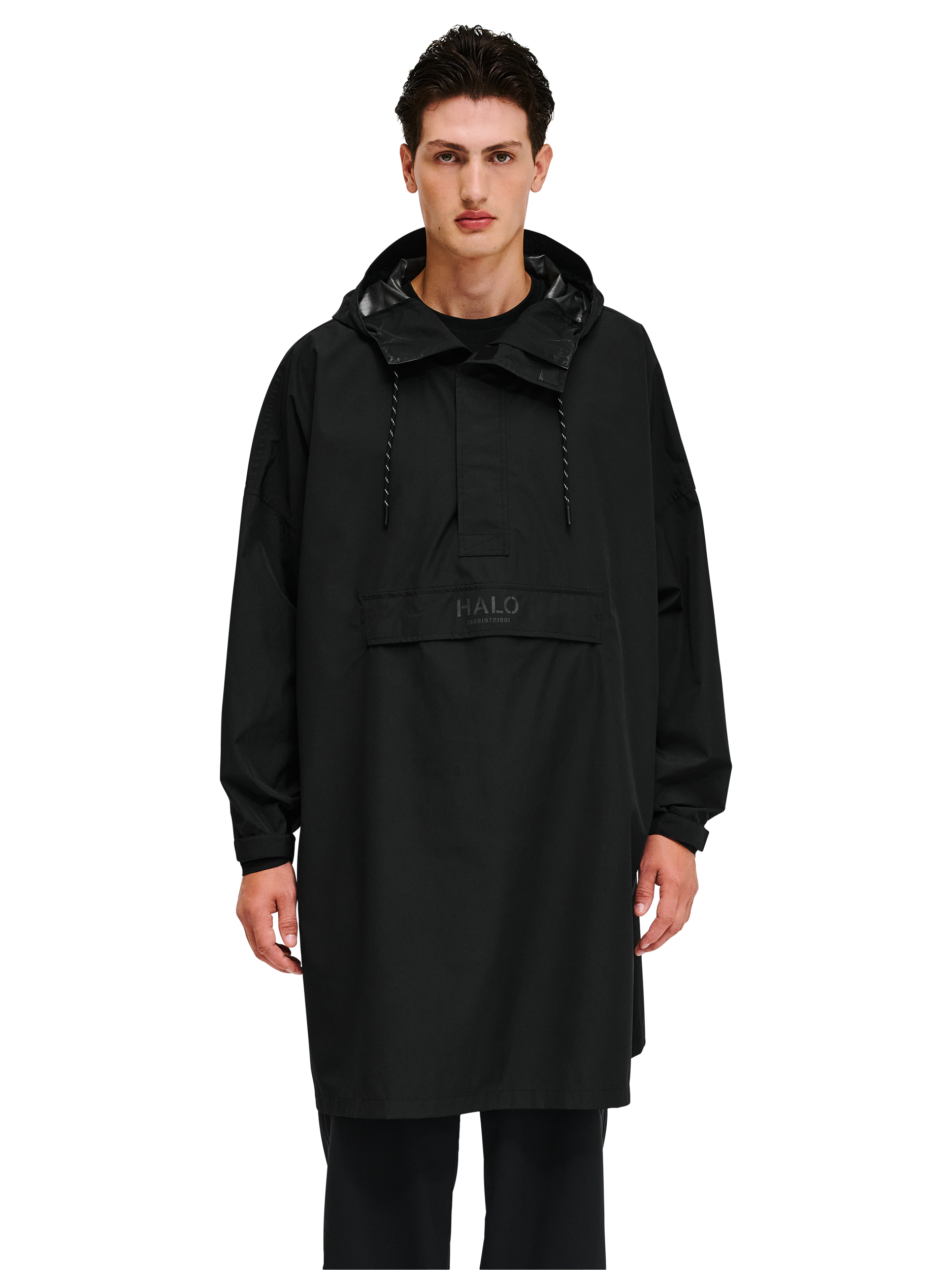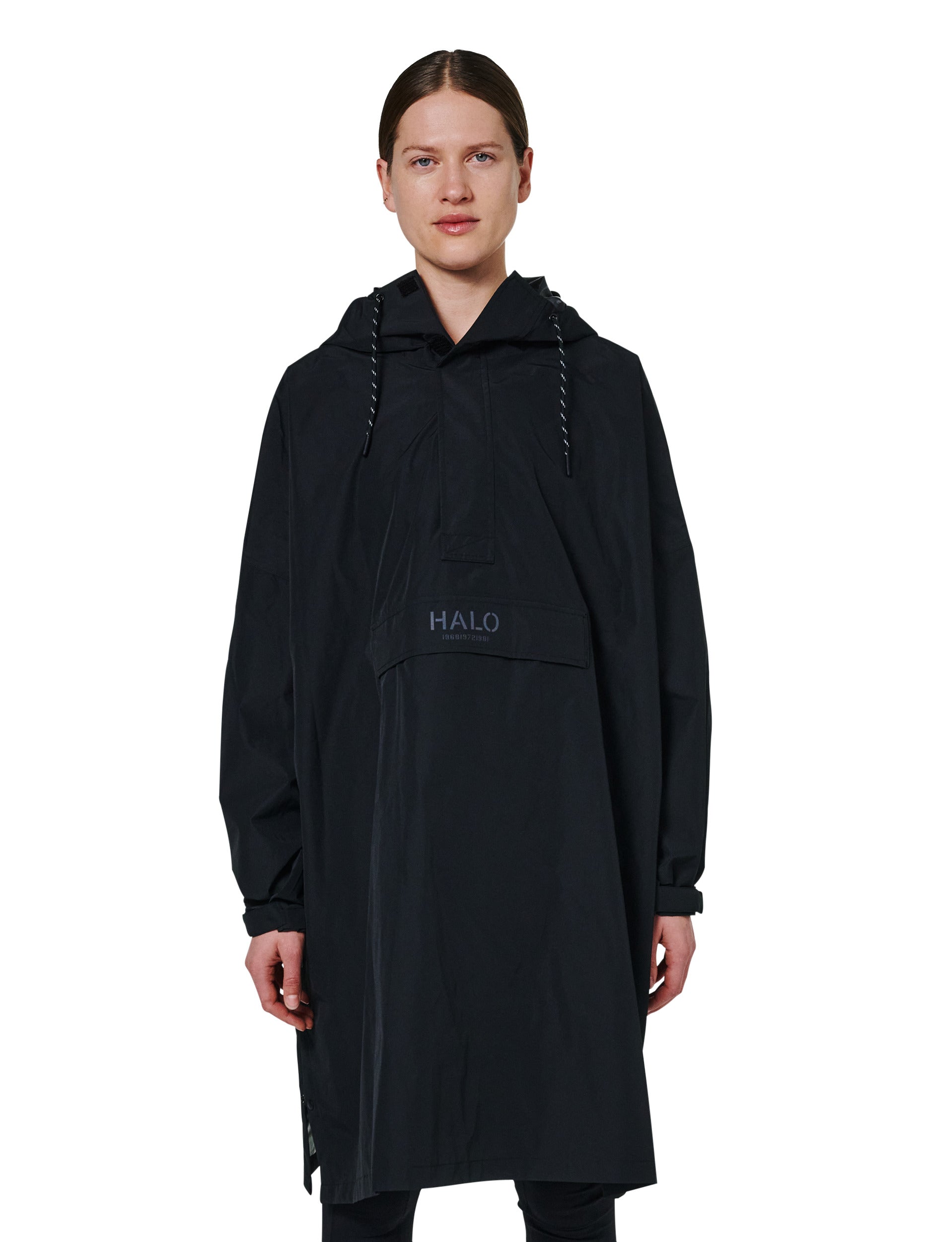 HALO RAINCOVER er fremstillet med slidstærk, vandafvisende imprægnering (DWR). Med fuldt tapede sømme, åndbarhed 5000 og modstand på vandsøjletryk 8000 er regnjakken vandtæt. En lomme med et reflekterende HALO logo ses fortil, mens hætten har en justerbar reflekterende snøre. HALO RAINCOVER kan pakkes nemt sammen.