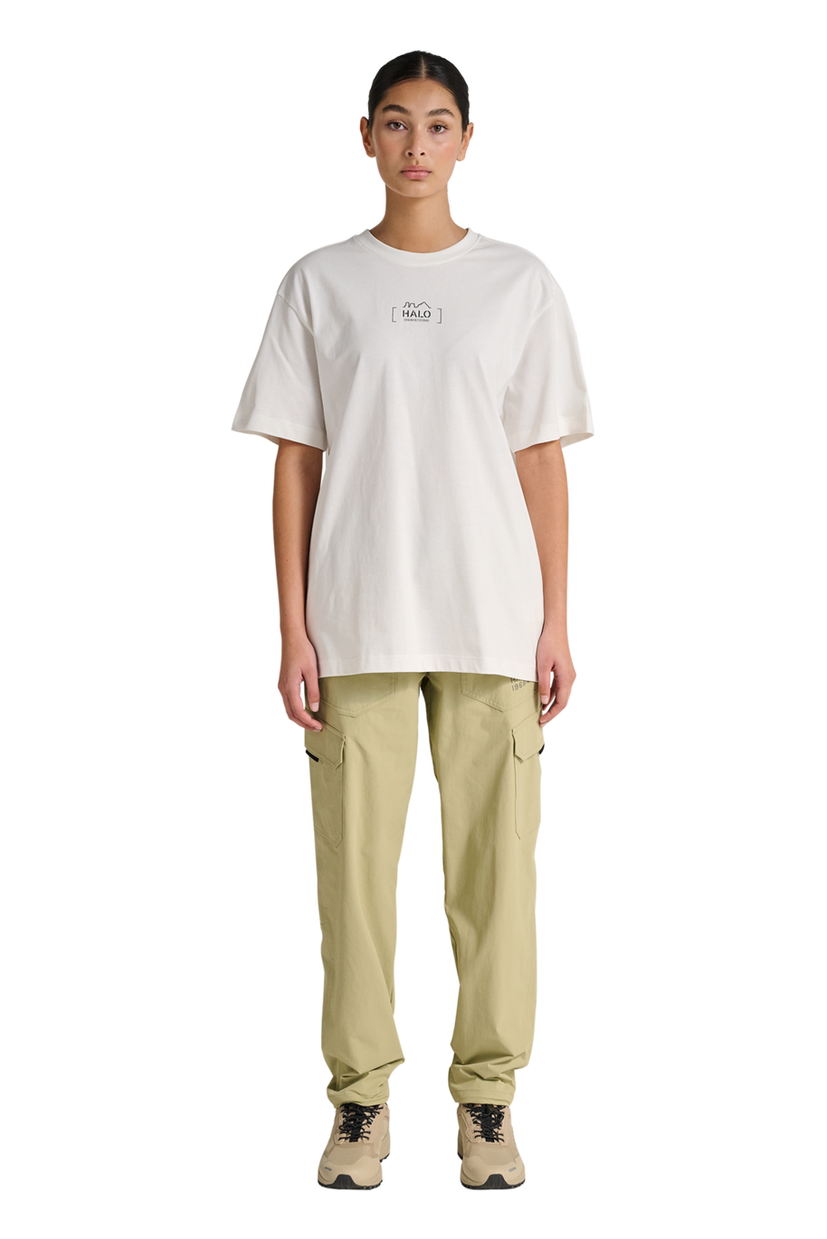 En blød t-shirt fremstillet i 100% økologisk bomuld i farven hvid, som sikrer komfort hele dagen. Den er let at style og passer til forskellige lejligheder med sit enkle og tidløse design. T-shirten fra HALO har et diskret print på brystet, der tilføjer et moderne touch uden at overdøve det klassiske udtryk og et større print på ryg.