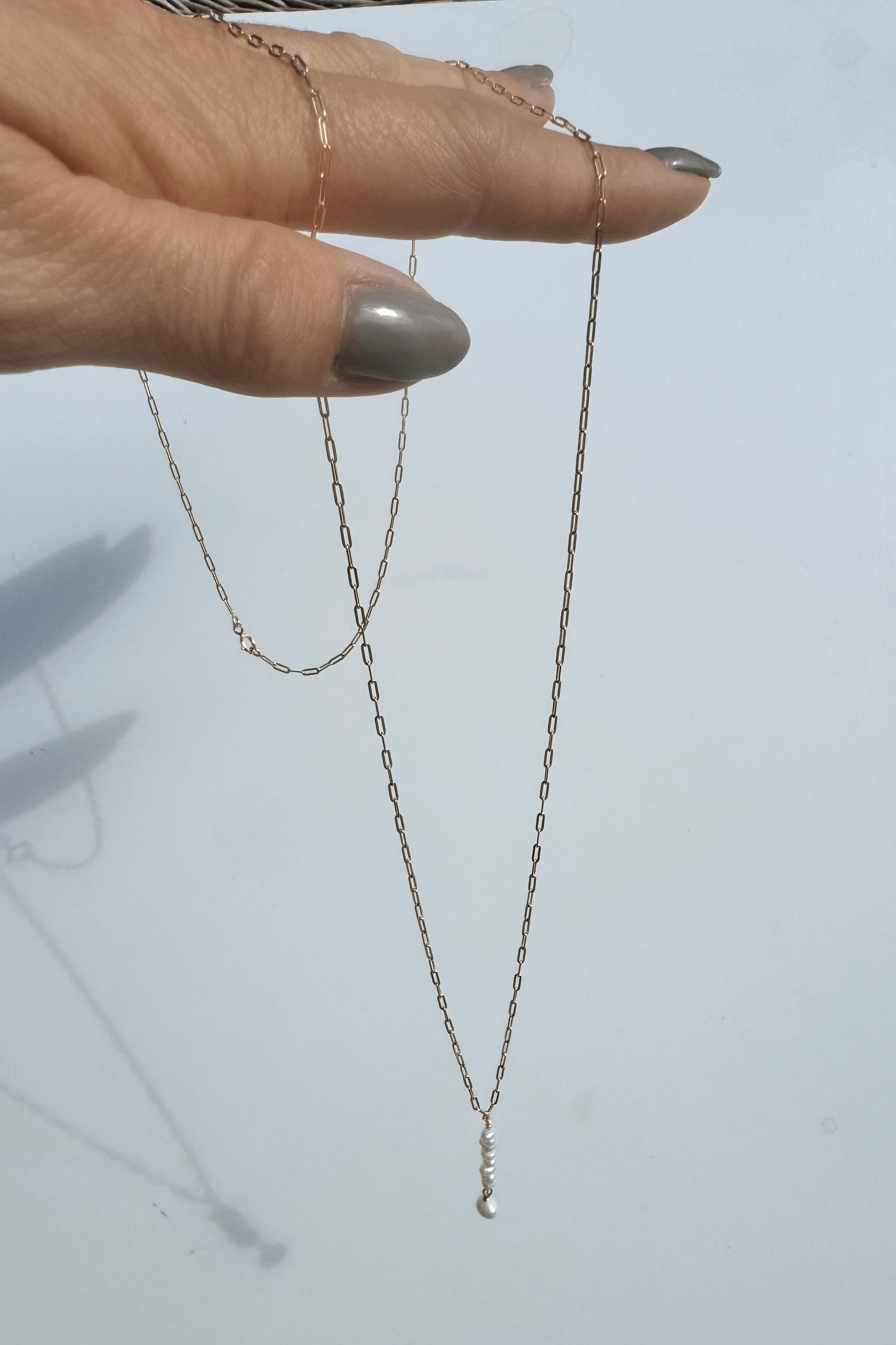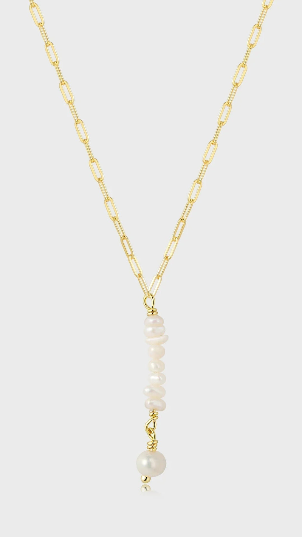 Ida Long-halskæden fra Andcopenhagen har aflange led og et særpræget vedhæng med små perler og en større perle. Den justerbare længde giver dig mulighed for at tilpasse den til forskellige outfits.