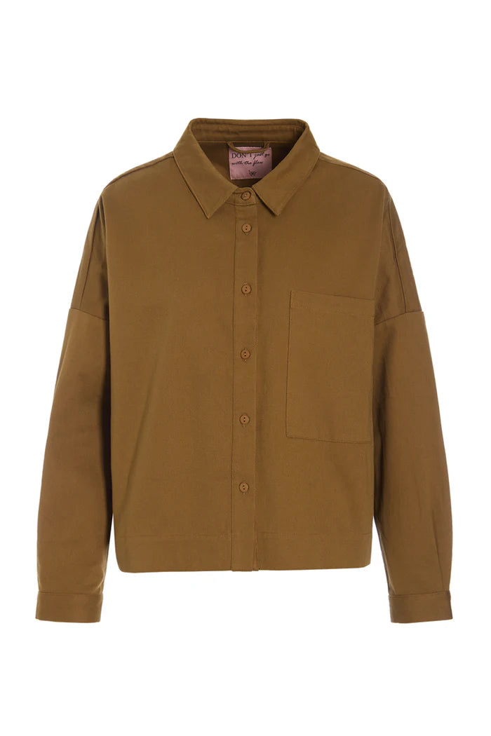 Skjorten i bomuldstwill har en klassisk krave, sænkede skuldre, brede ærmer og en stor brystlomme. Manchetterne er afsluttet med knapper.