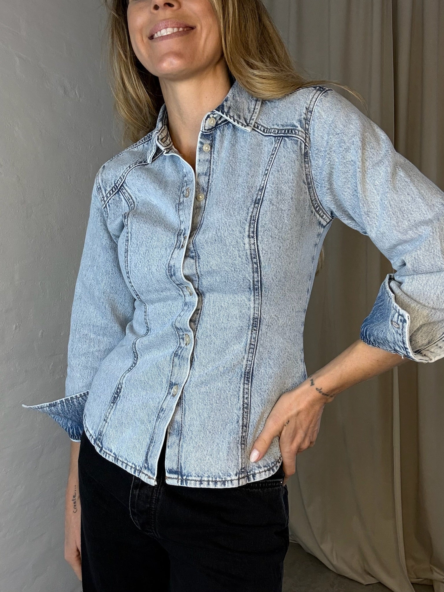 Denimskjorte som har en klassisk skjortekrave og lange ærmer med høje manchetter, der skaber et tidløst og stilfuldt look. Med knaplukning foran og en kort pasform er den designet til en afslappet, men alligevel velklædt stil.