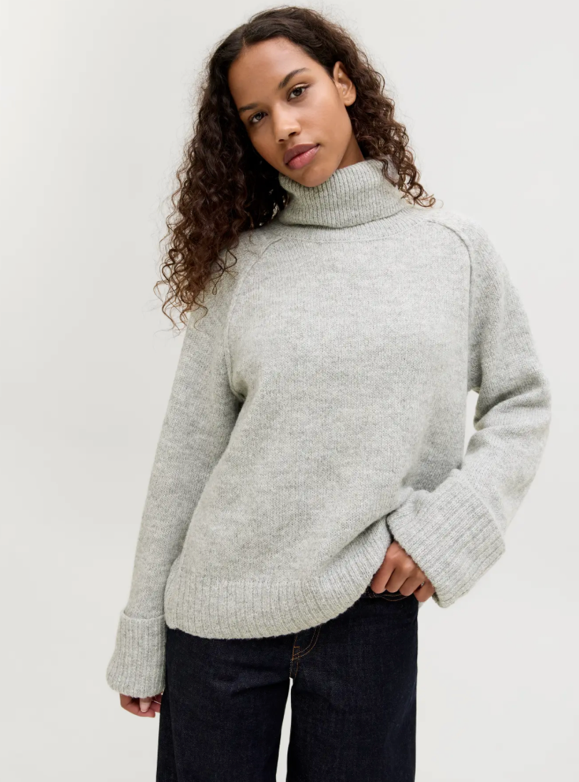 Denne basale strik passer til alt i din garderobe og er fremstillet i en flad strik, der giver både komfort og fleksibilitet. Pulloveren har en klassisk rullekrave, lange ærmer med ribstrikkede manchetter og en løs pasform, der gør den behagelig at have på hele dagen.