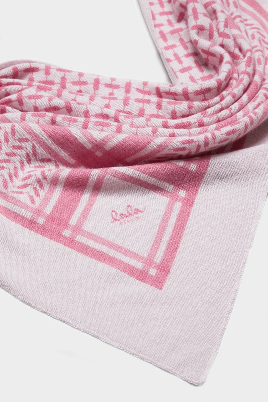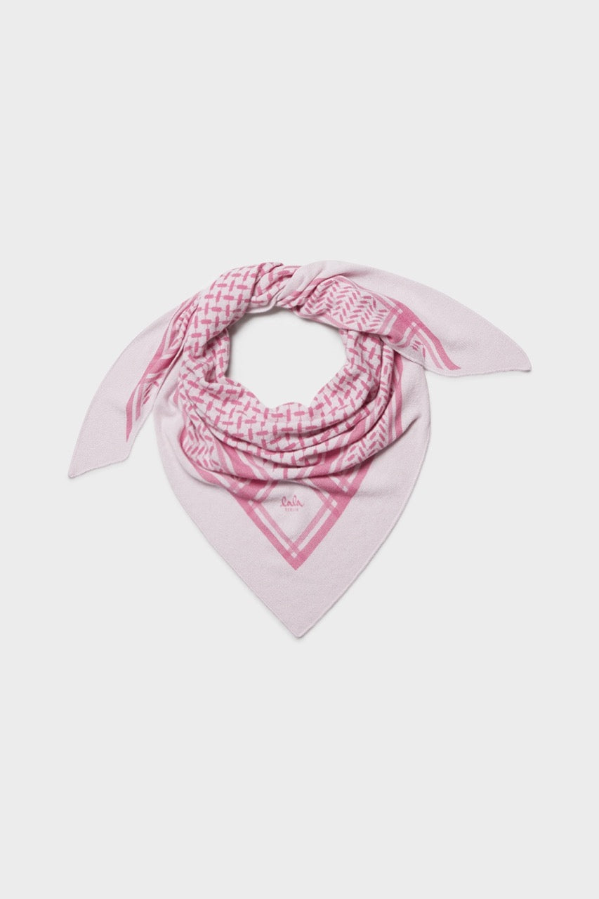 Dette eksklusive trekantede tørklæde i 100% cashmere kombinerer luksus og tidløst design. Det er udført i en blød lyserød nuance med et grafisk, vævet mønster og en dekorativ kant, der giver tørklædet et raffineret og moderne udtryk.