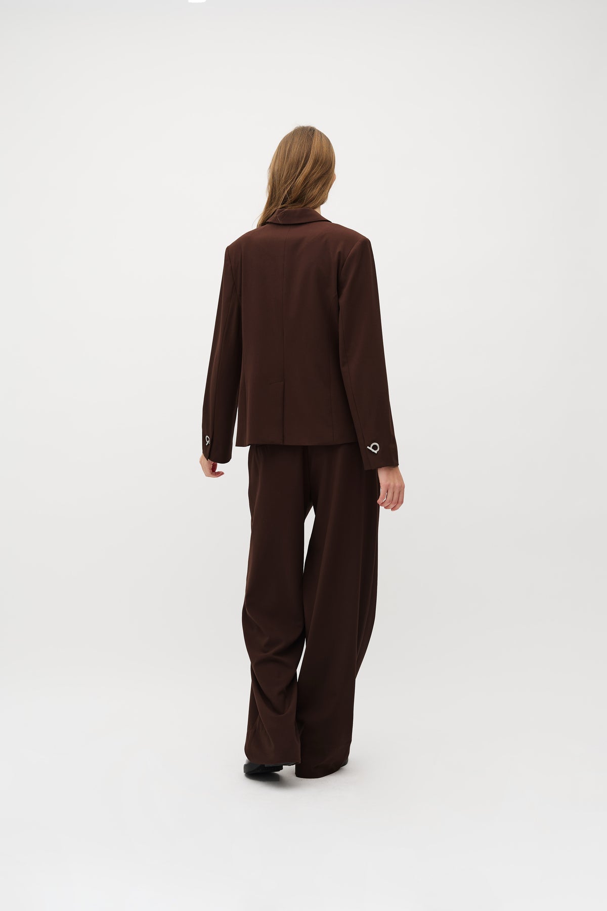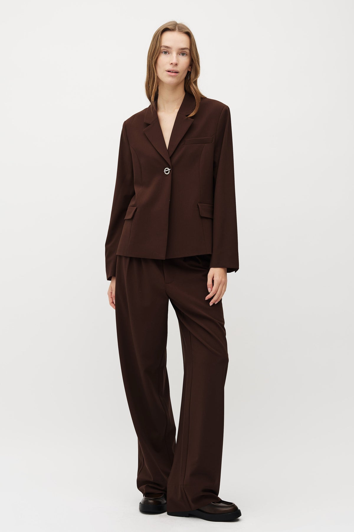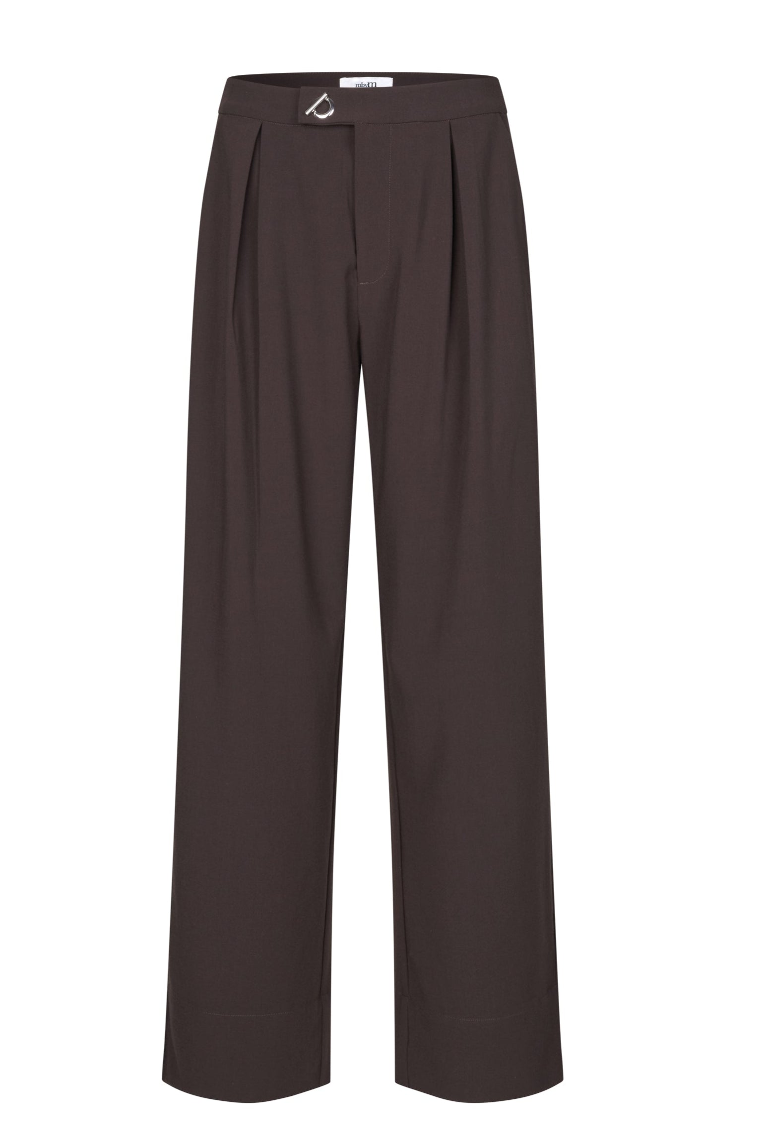 Rosalyn-bukserne fra MbyM har en straight fit med læg foran, der gør dem ideelle til afslappede cafébesøg. Den fleksible taljehøjde kan justeres efter dit ønske, og den brune farve er let at style.