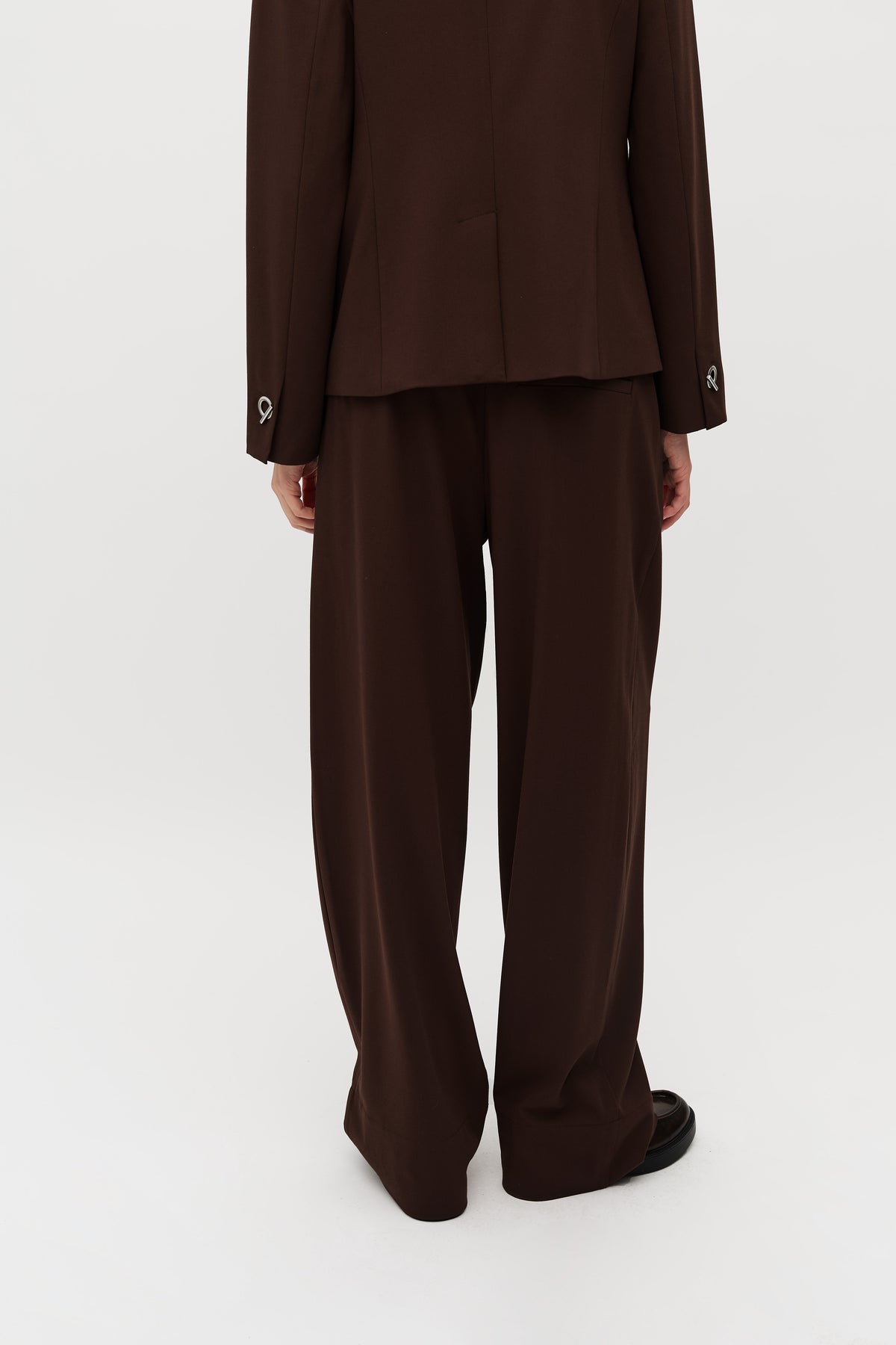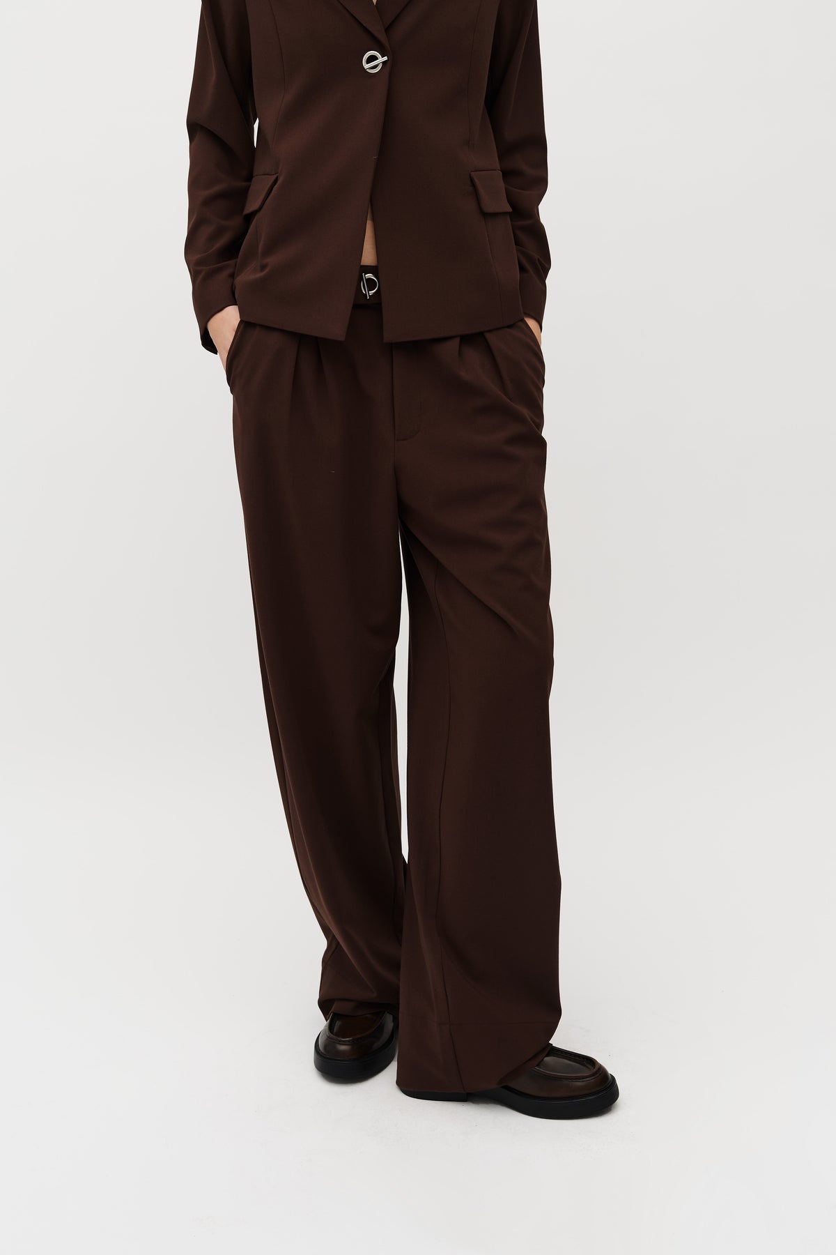 Bukserne har en bred, lige pasform med læg foran og sølvfarvet lukningsdetalje ved bæltekanten.