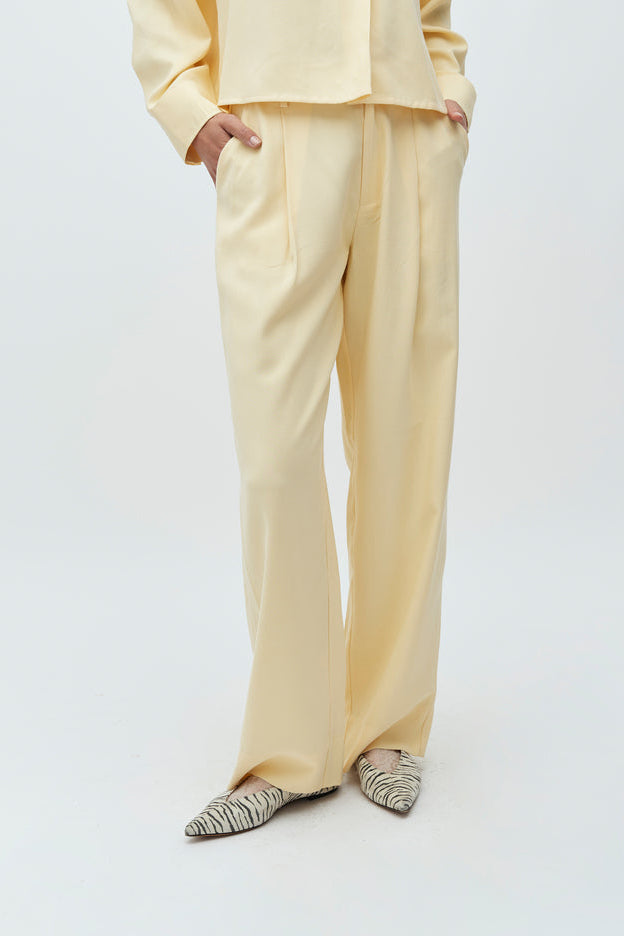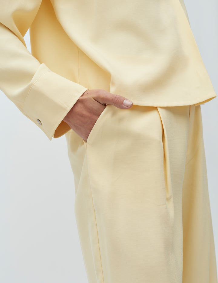 Daniello bukserne fra MbyM er elegante, wide leg bukser i den lyse og friske nuance Summer Yellow. Den lette, glansfulde kvalitet og de fine læg fortil giver et feminint og sofistikeret udtryk.