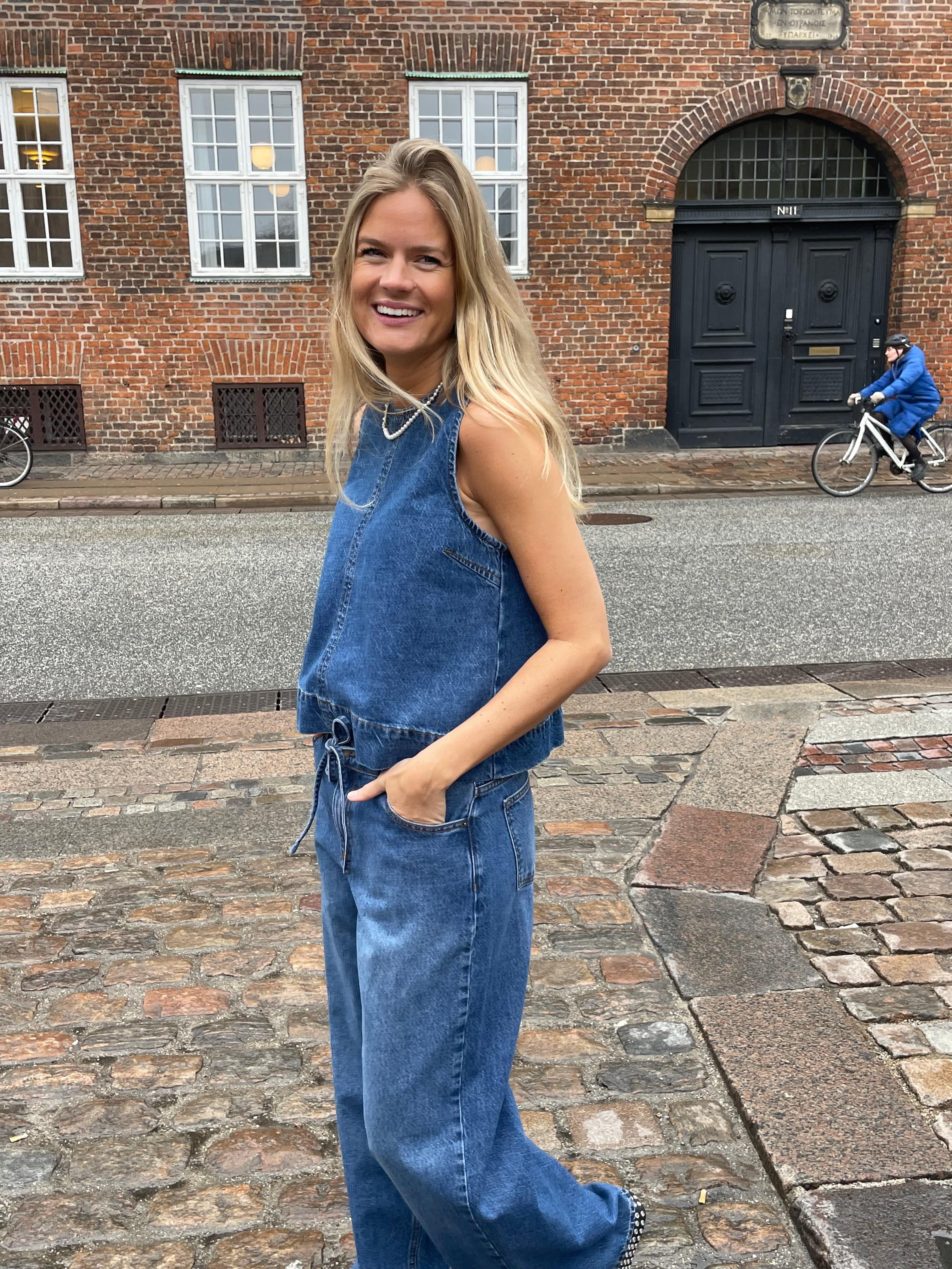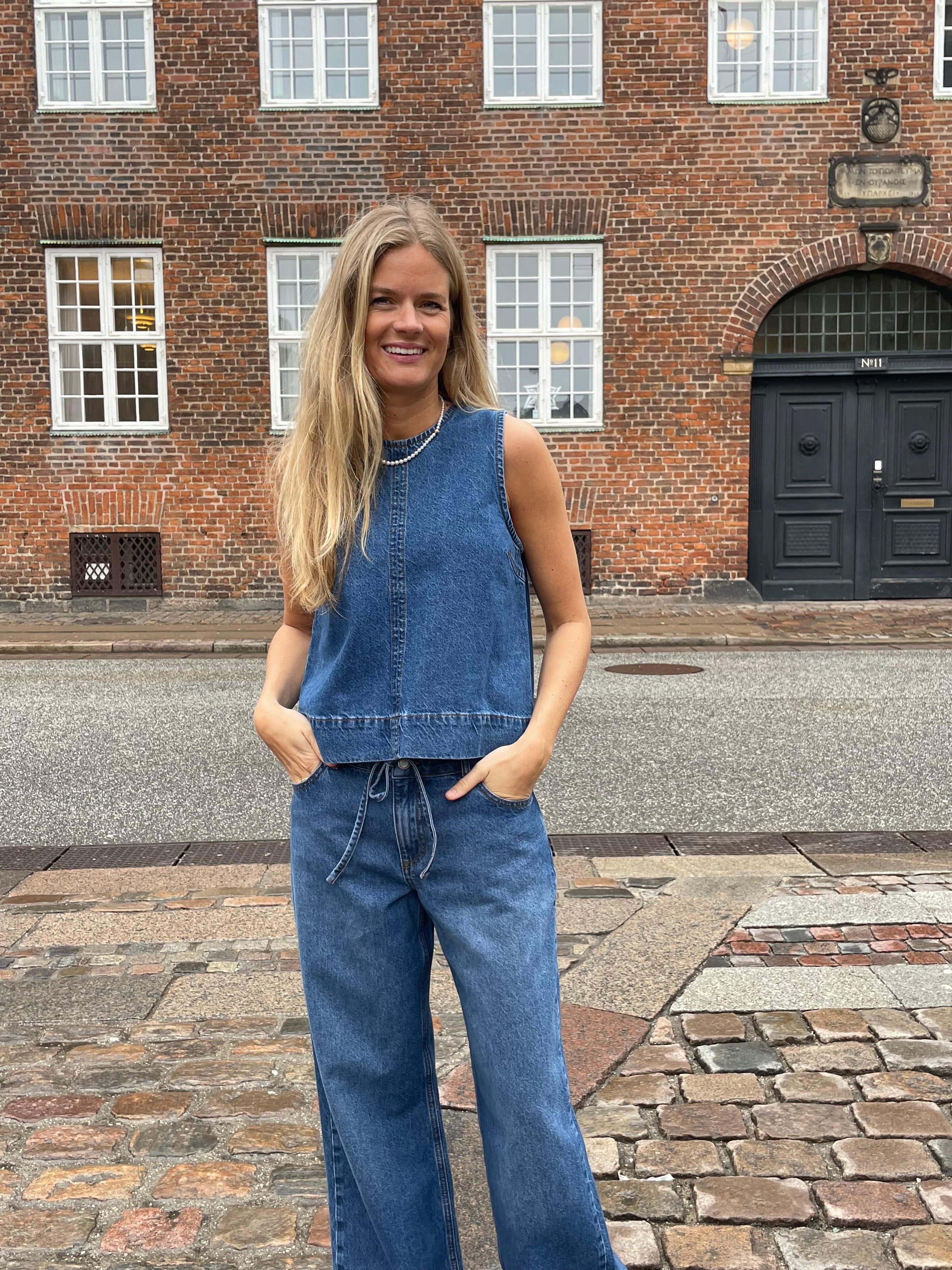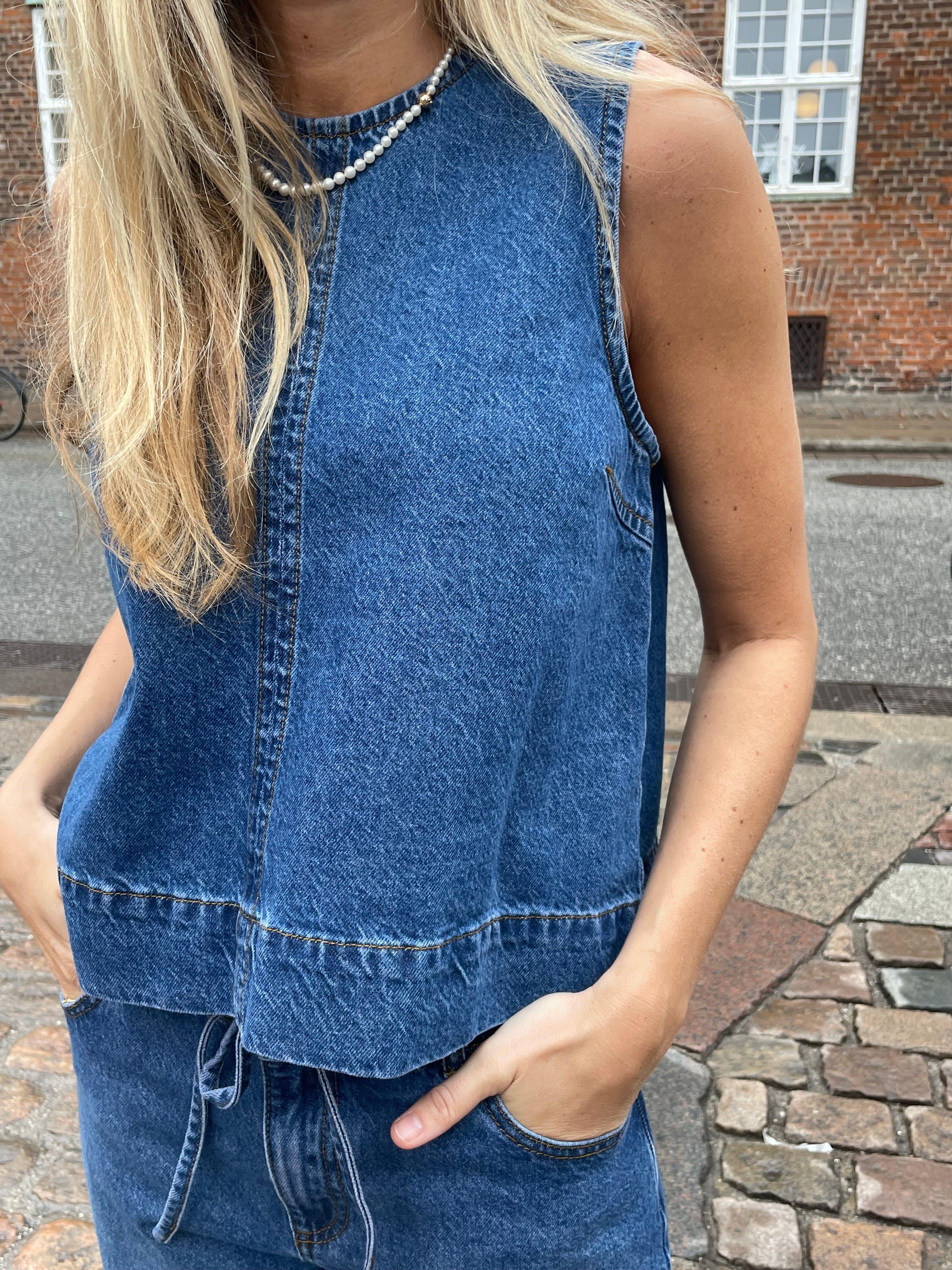 Rihne-M fra Mbym er en cool og tidløs denimtop med et enkelt, moderne udtryk. Toppen er ærmeløs og designet i en blød, vasket blå denim, der giver et afslappet og let vintage-inspireret look.