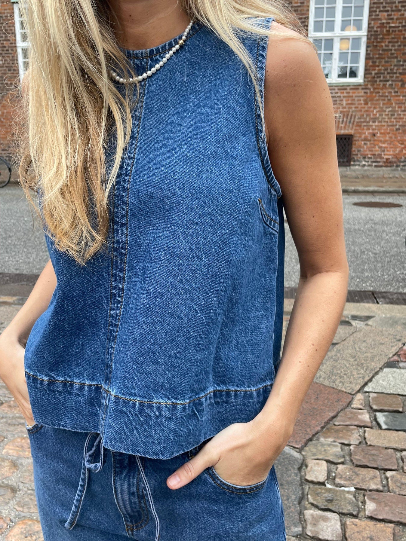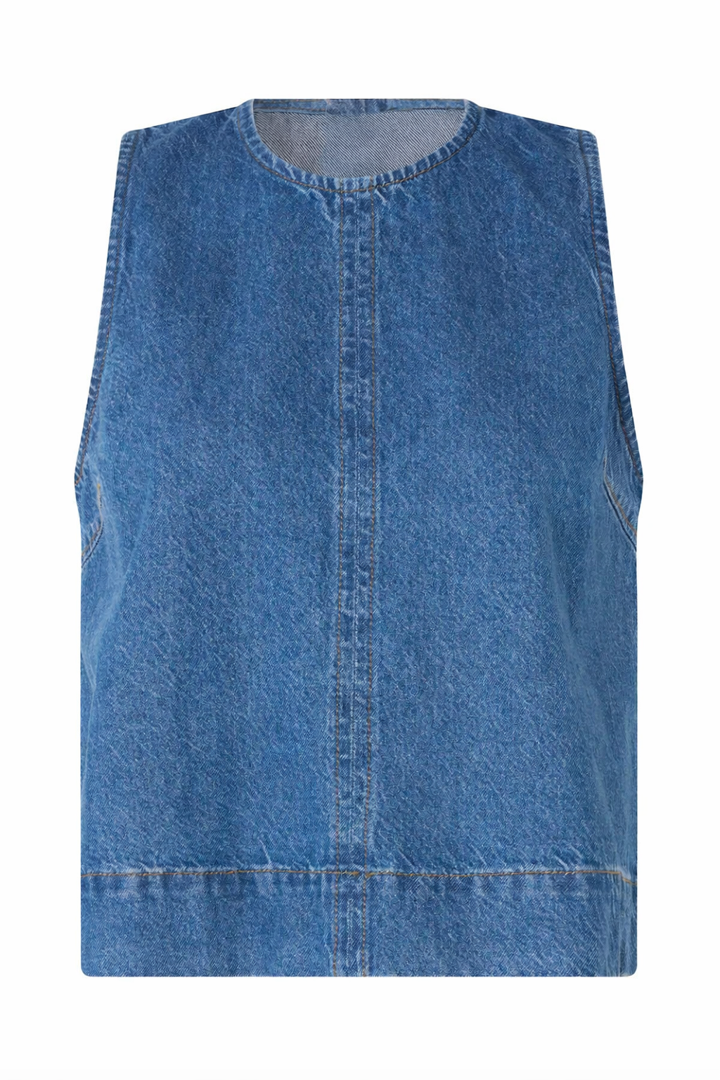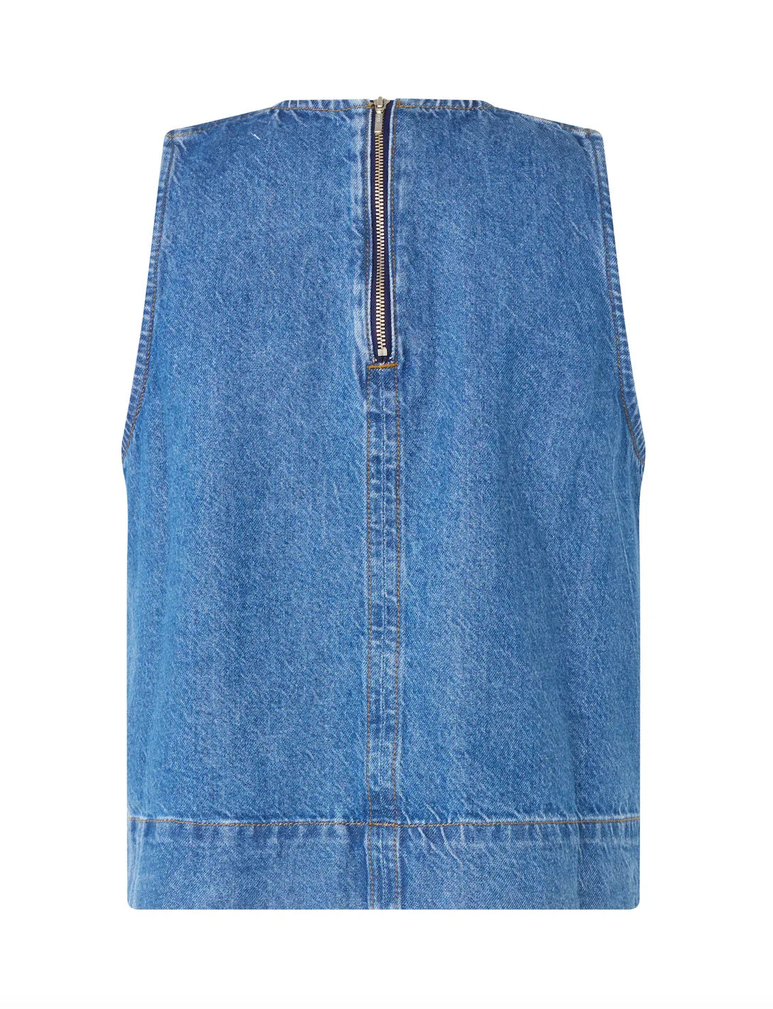 Rihne-M fra Mbym er en cool og tidløs denimtop med et enkelt, moderne udtryk. Toppen er ærmeløs og designet i en blød, vasket blå denim, der giver et afslappet og let vintage-inspireret look.