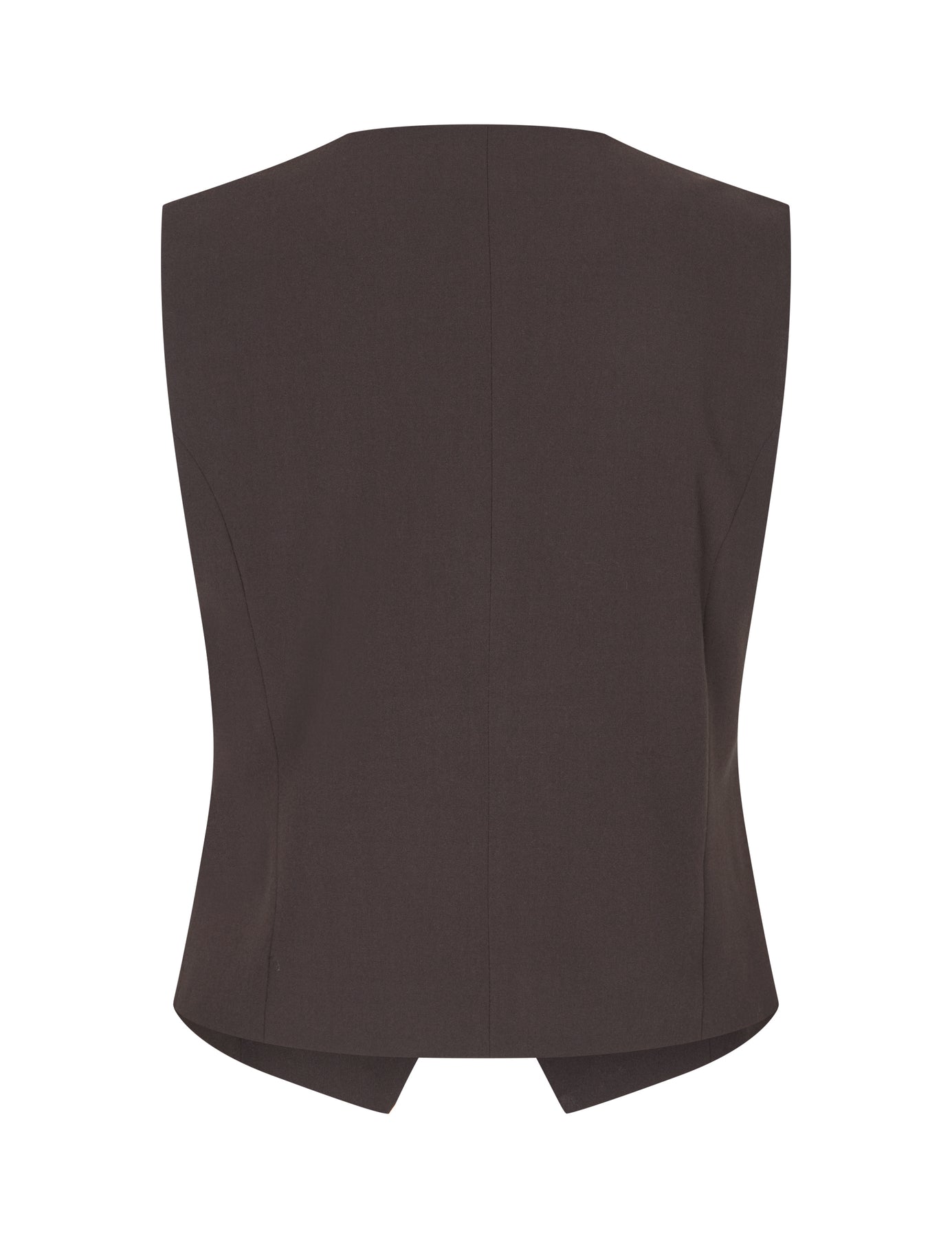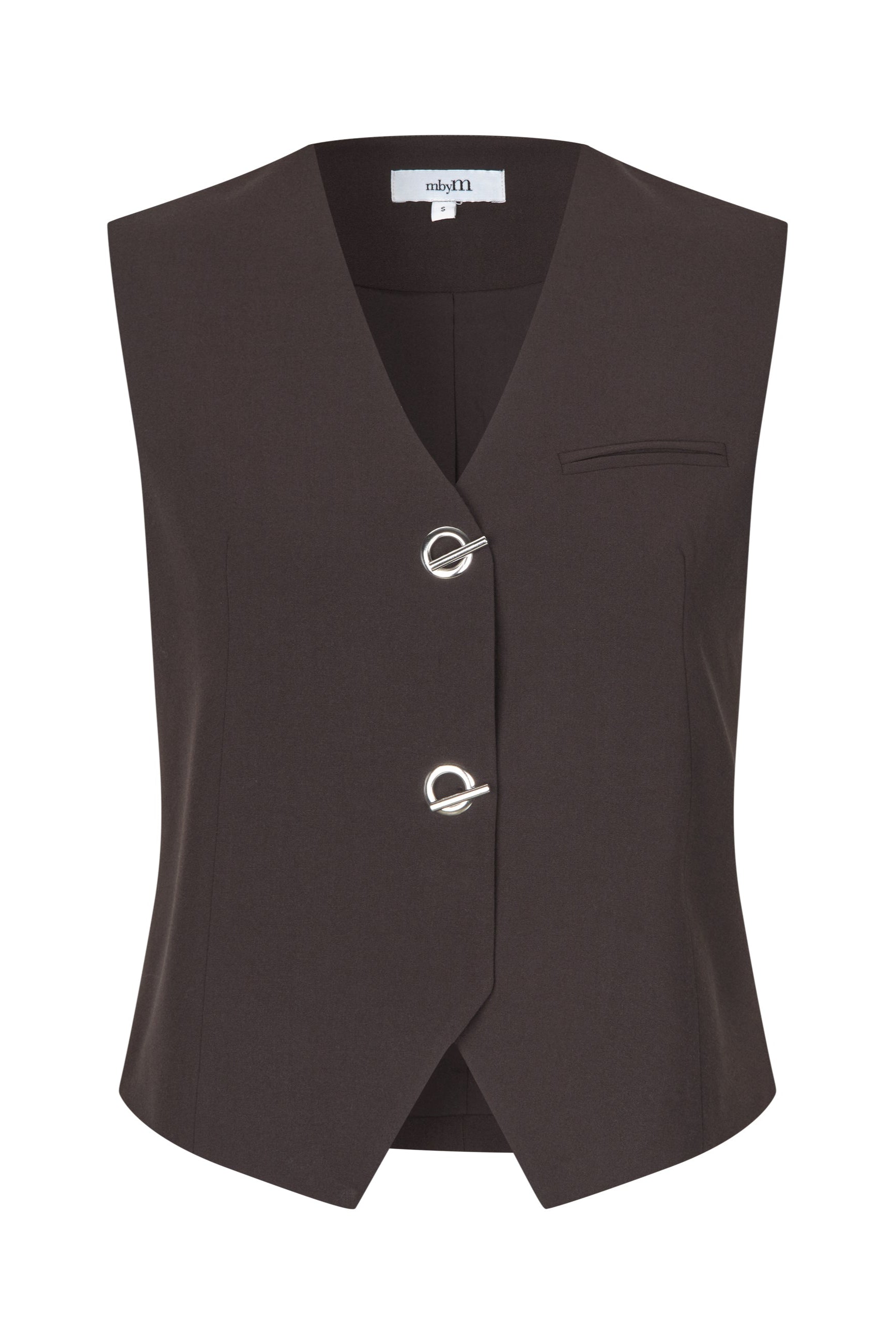 Brun vest fra MbyM med v-udskæring og to sølvfarvede knapper. Den kortere baglængde og den praktiske lomme gør vesten ideel til afslappede cafébesøg eller shoppingture, hvor stil stadig er vigtig.