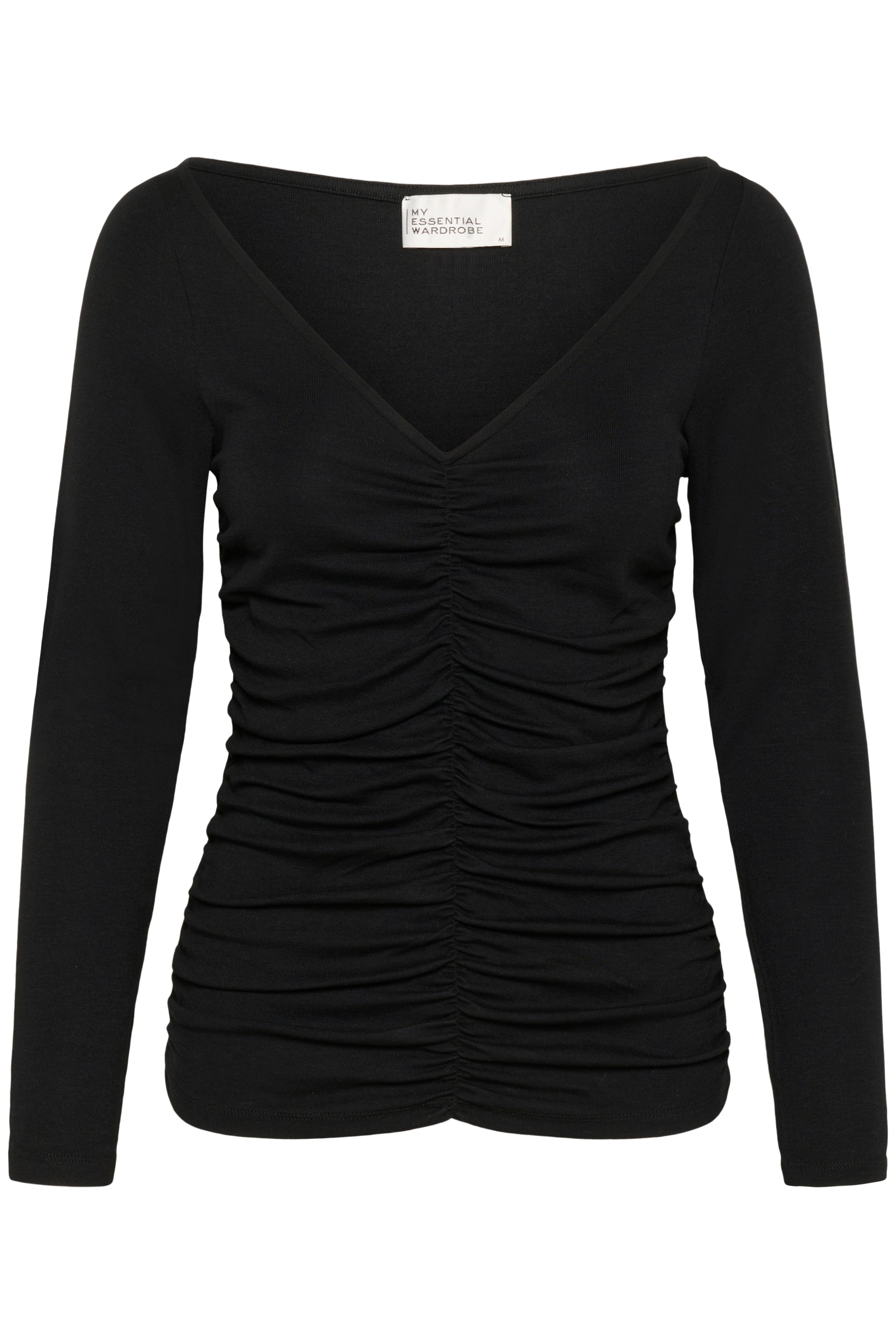 En fin sort bluse fra My Essential Wardrobe. Blusen har en fin v-udskæring og rynke detaljer foran som gør at blusen falder fint.