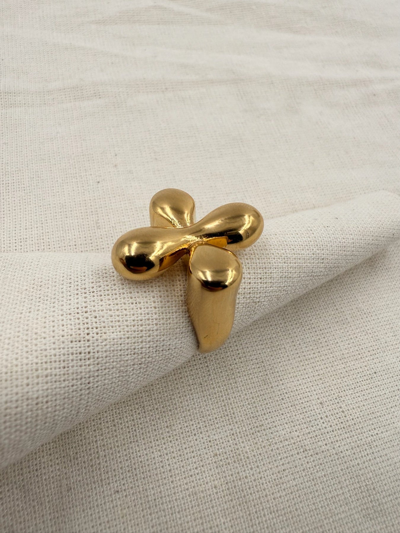 Ring med karakteristisk blomsterformet korsdesign og afrundede ender. Det åbne design gør ringen justerbar, så den passer til forskellige fingerstørrelser. Poleret overflade, der fremhæver de bløde former.