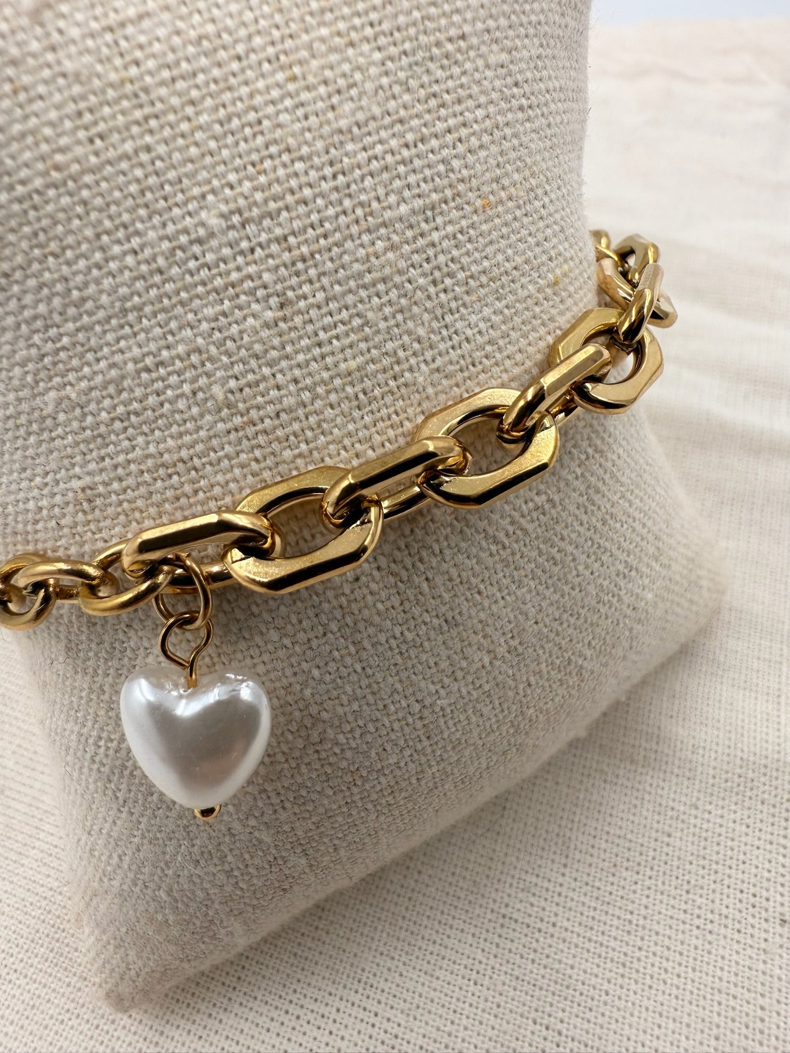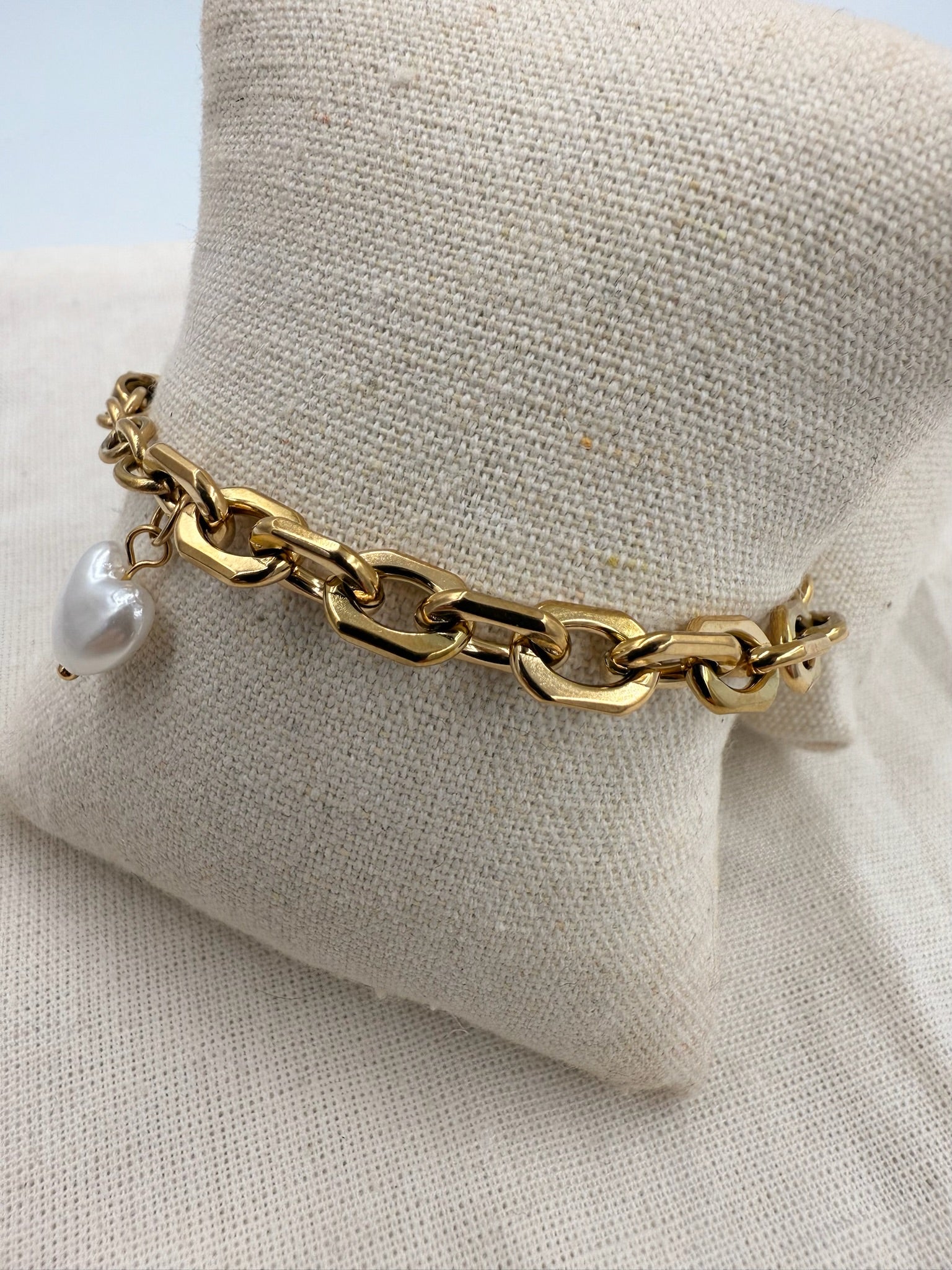 Dette rustikke kædearmbånd med hjerteformet perle er skabt til festlige begivenheder. Den chunky udformning og 18 karat guldbelægning gør det til et iøjnefaldende smykke, der skiller sig ud.