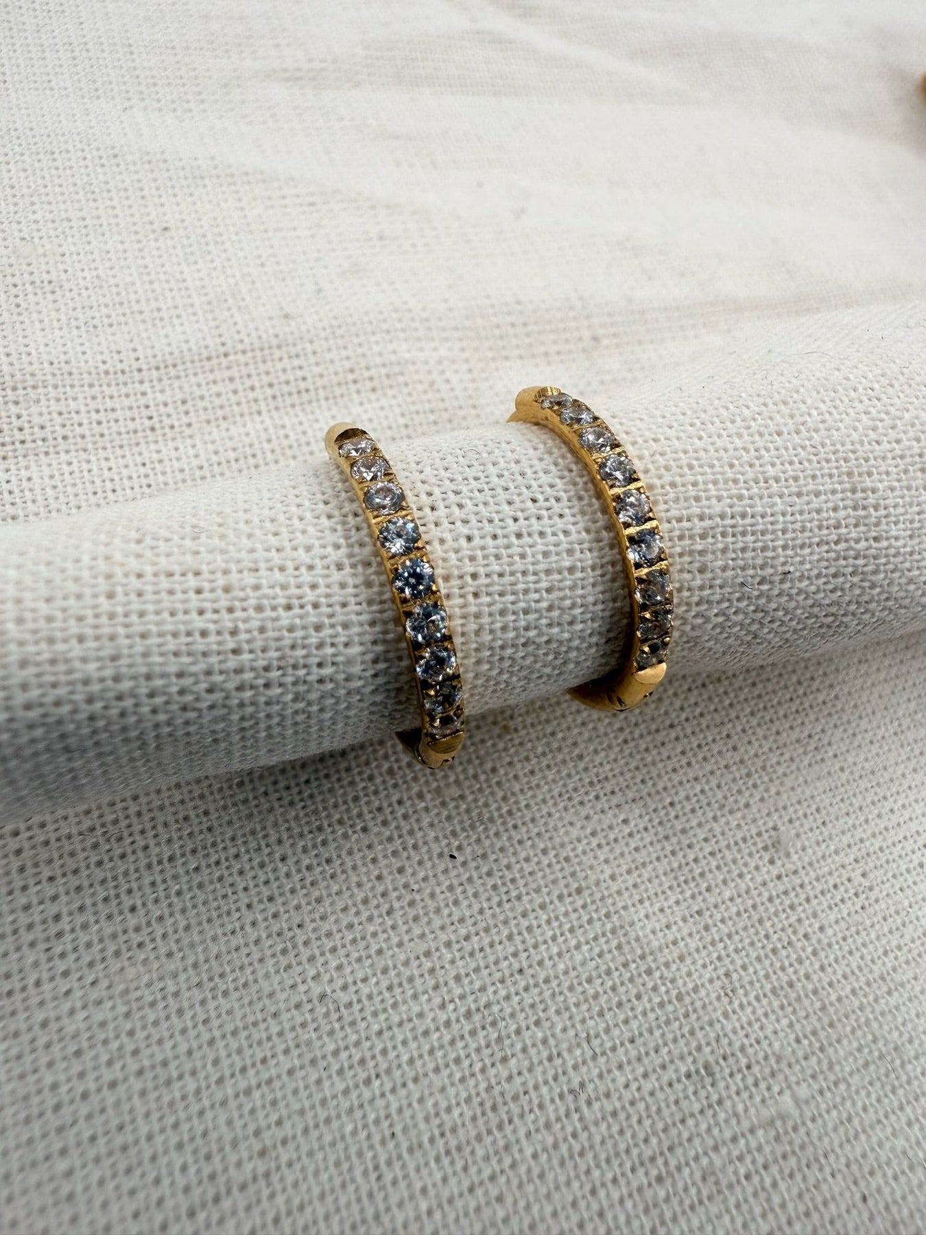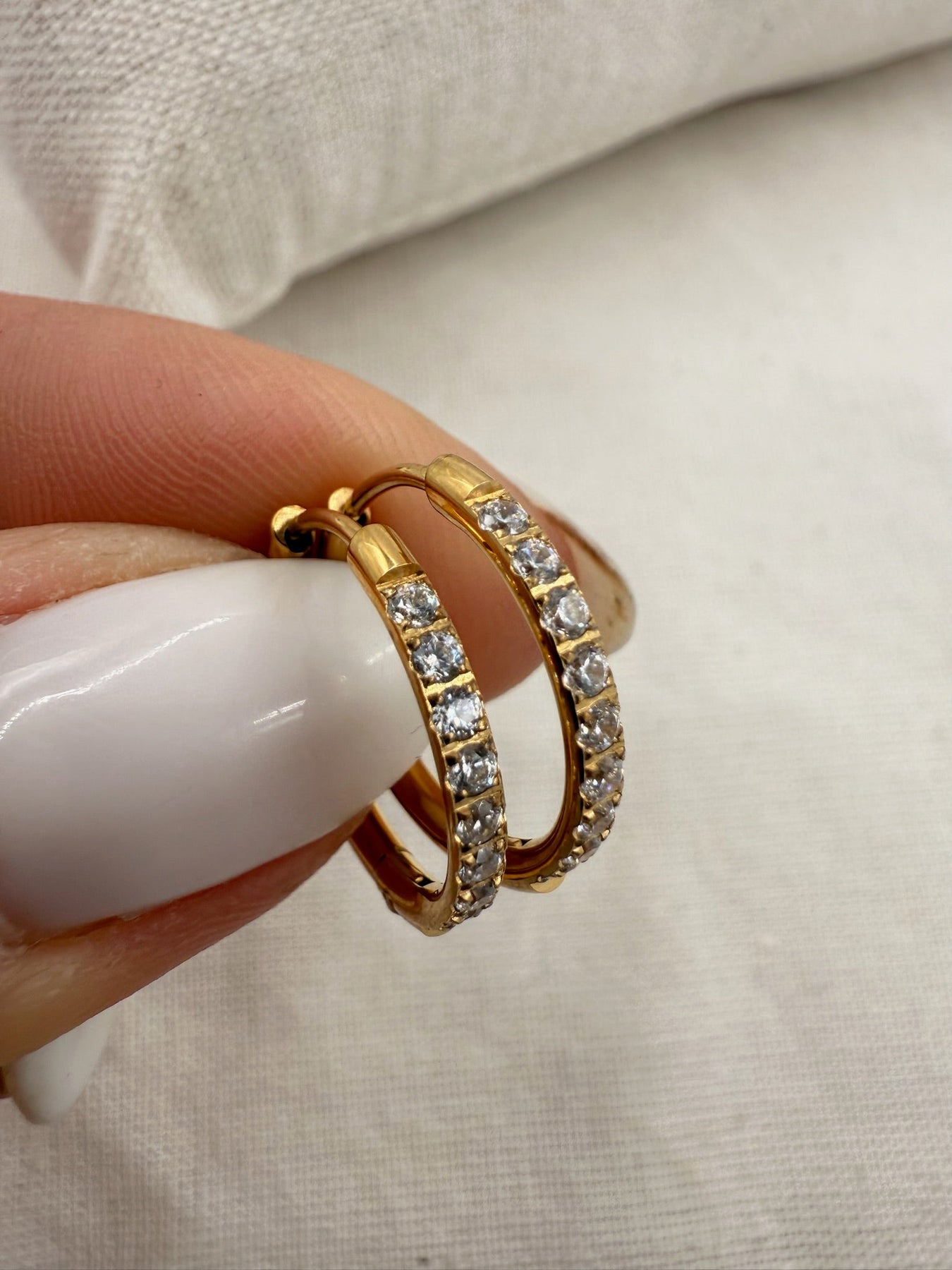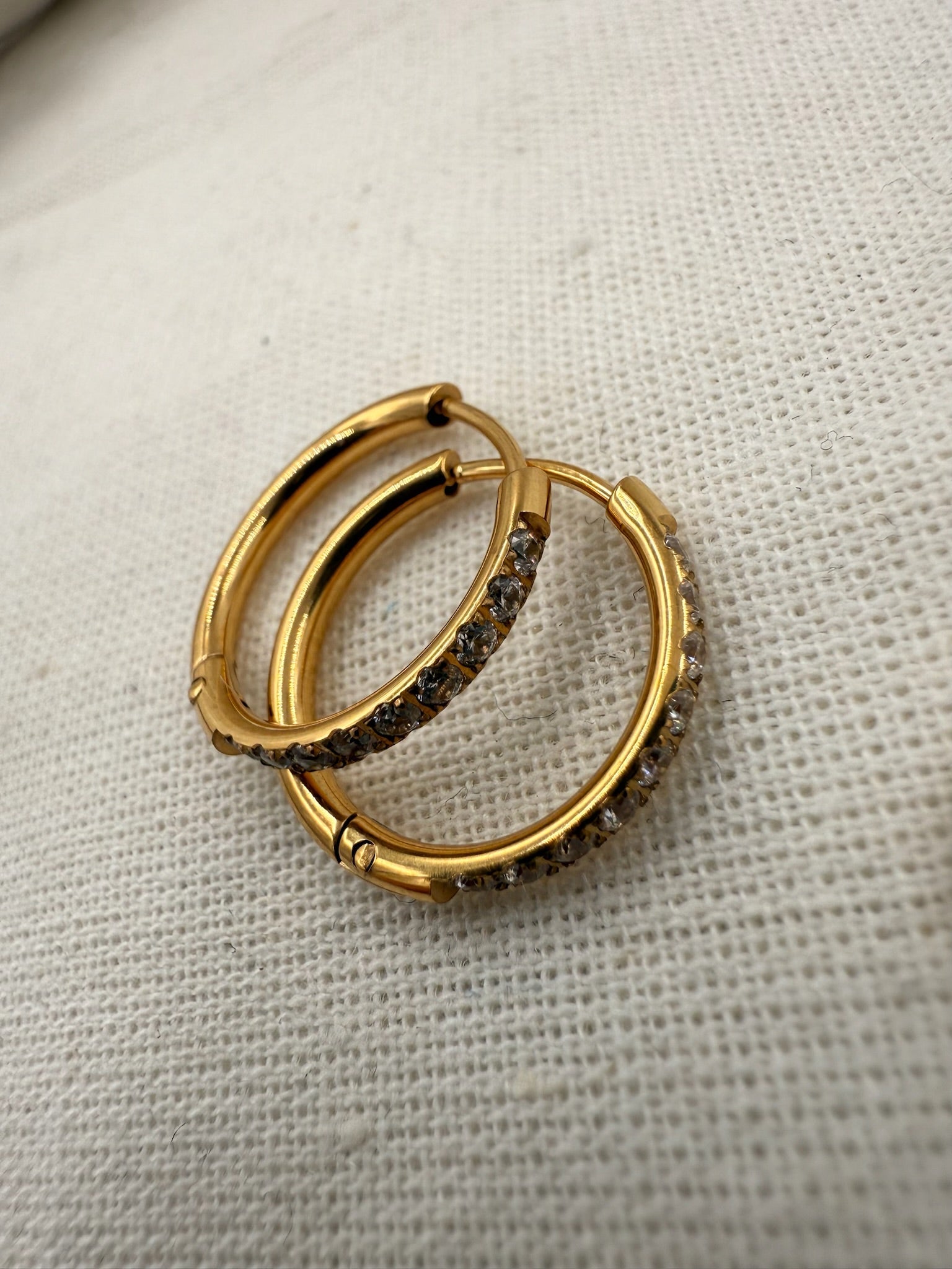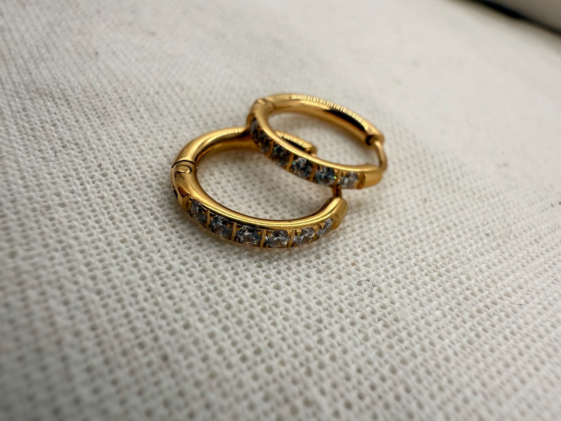 Runde øreringe med dekorative sten langs forsiden. Disse hoops kommer i tre størrelser og er vandtætte. Den glatte overflade giver et sofistikeret udtryk til både hverdag og fest.