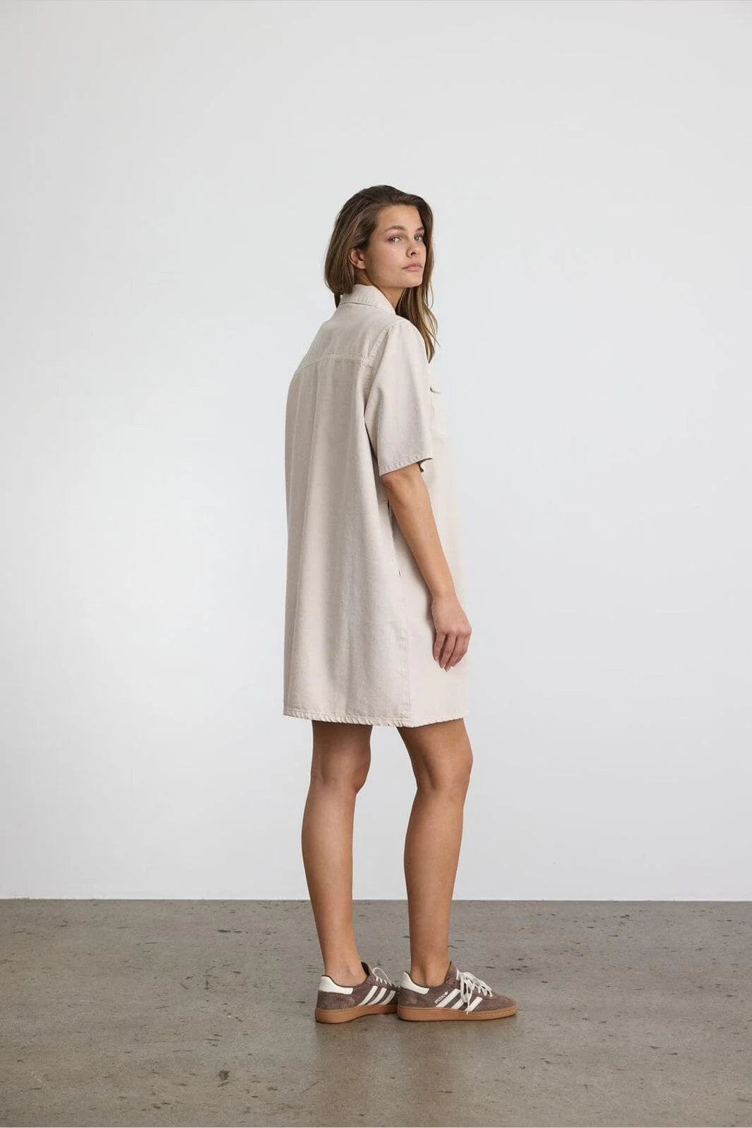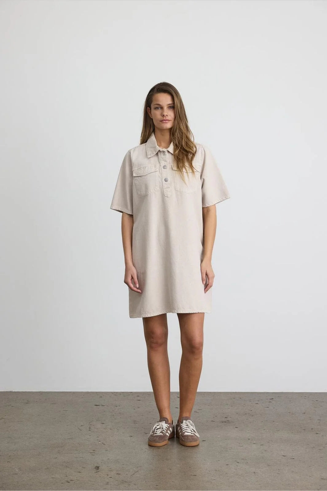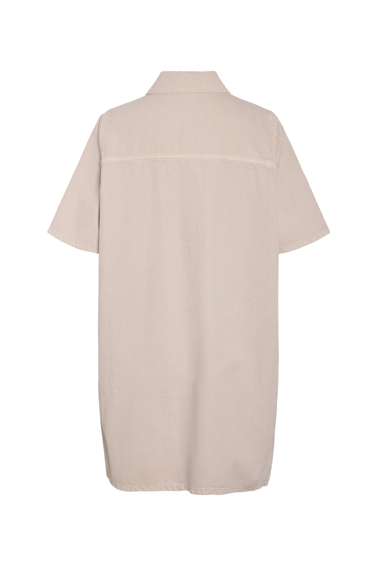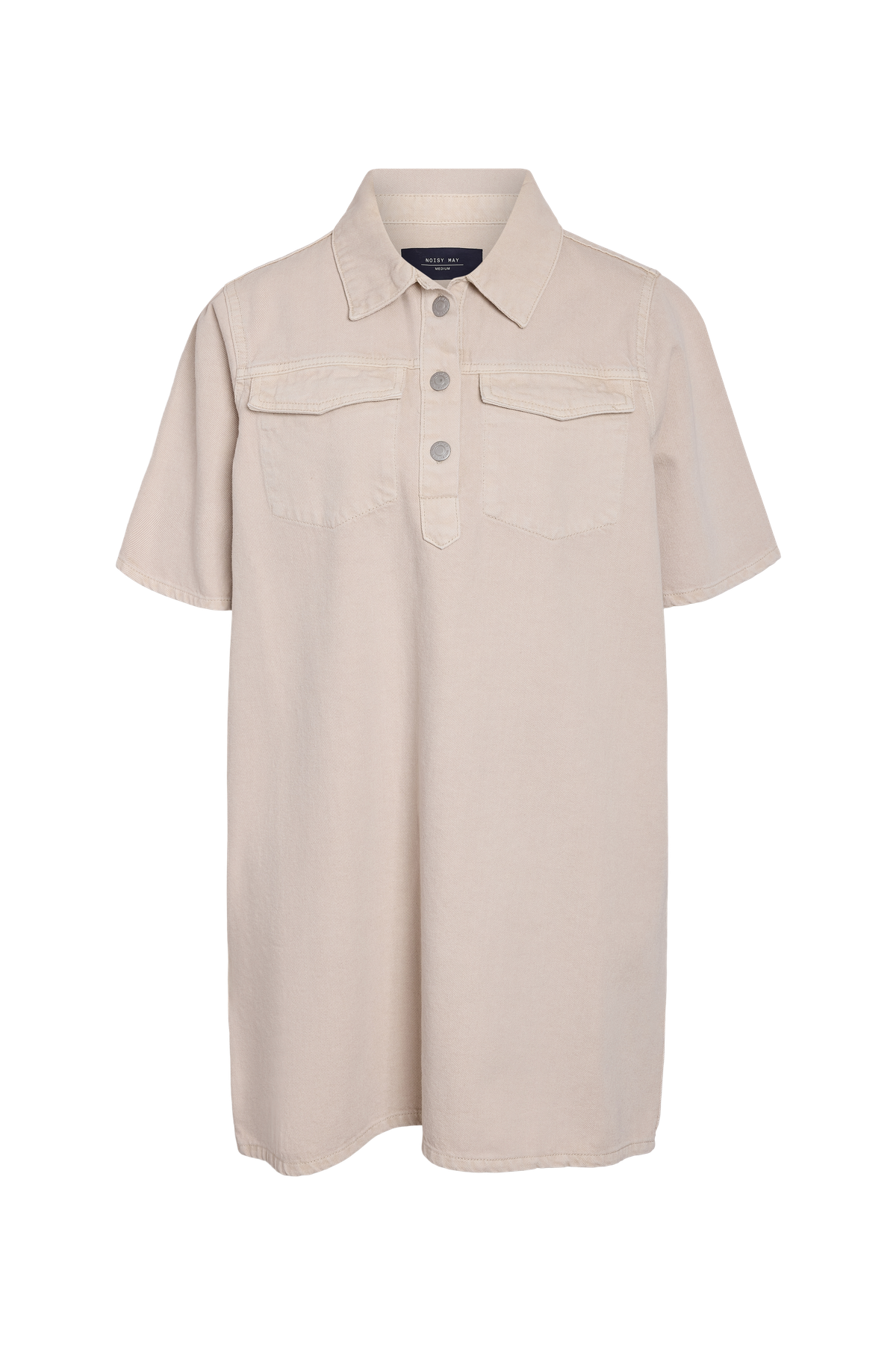 Denne kortærmede denimkjole har en klassisk skjortekrave og en lukning med knapper, der giver et enkelt og stilfuldt udtryk. Kjolen her er fra Noisy May og er skabt i blød bomuld, hvilket sikrer både komfort og åndbarhed hele dagen. Farven, kaldet Pumice Stone, er en lys, beige nuance, der passer godt til mange lejligheder.