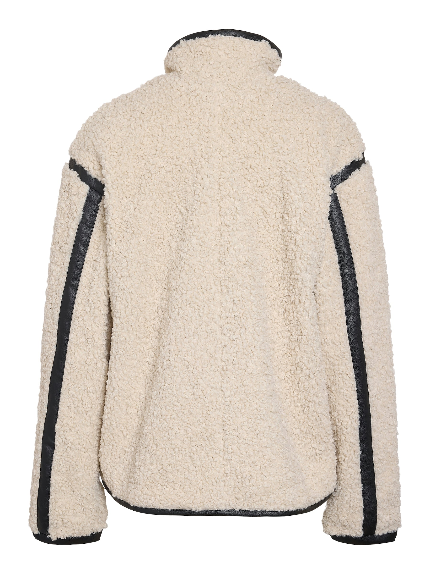 North-jakken fra Noisy May er en cremefarvet teddyjakke med høj hals, lange ærmer og en blød, vamset overflade. De mørke kantbånd med læder look, langs front, hals, ærmer og lommer har en glat, let skinnende struktur, der skaber en tydelig kontrast til teddymaterialet.