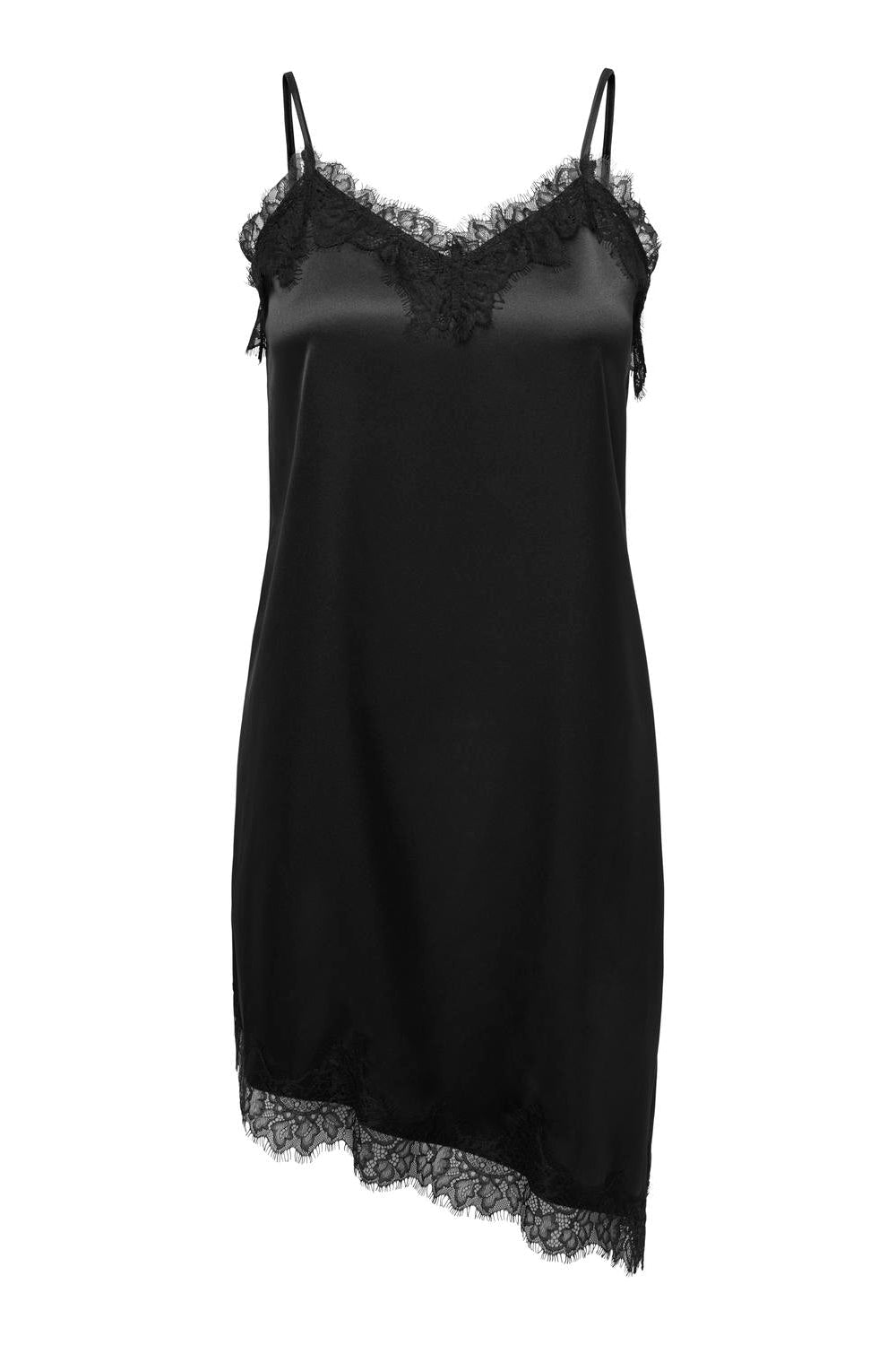 En stilfuld sort kjole i satinvævet polyester med en subtil stretch, der sikrer en behagelig pasform. Kjolen har et elegant snit med tynde, justerbare stropper og et smukt blonderelateret detaljearbejde, som tilføjer et feminint præg. Den er ærmeløs og har en flatterende V-hals samt en midi-længde, hvilket gør den velegnet til mange forskellige anledninger og årstider.