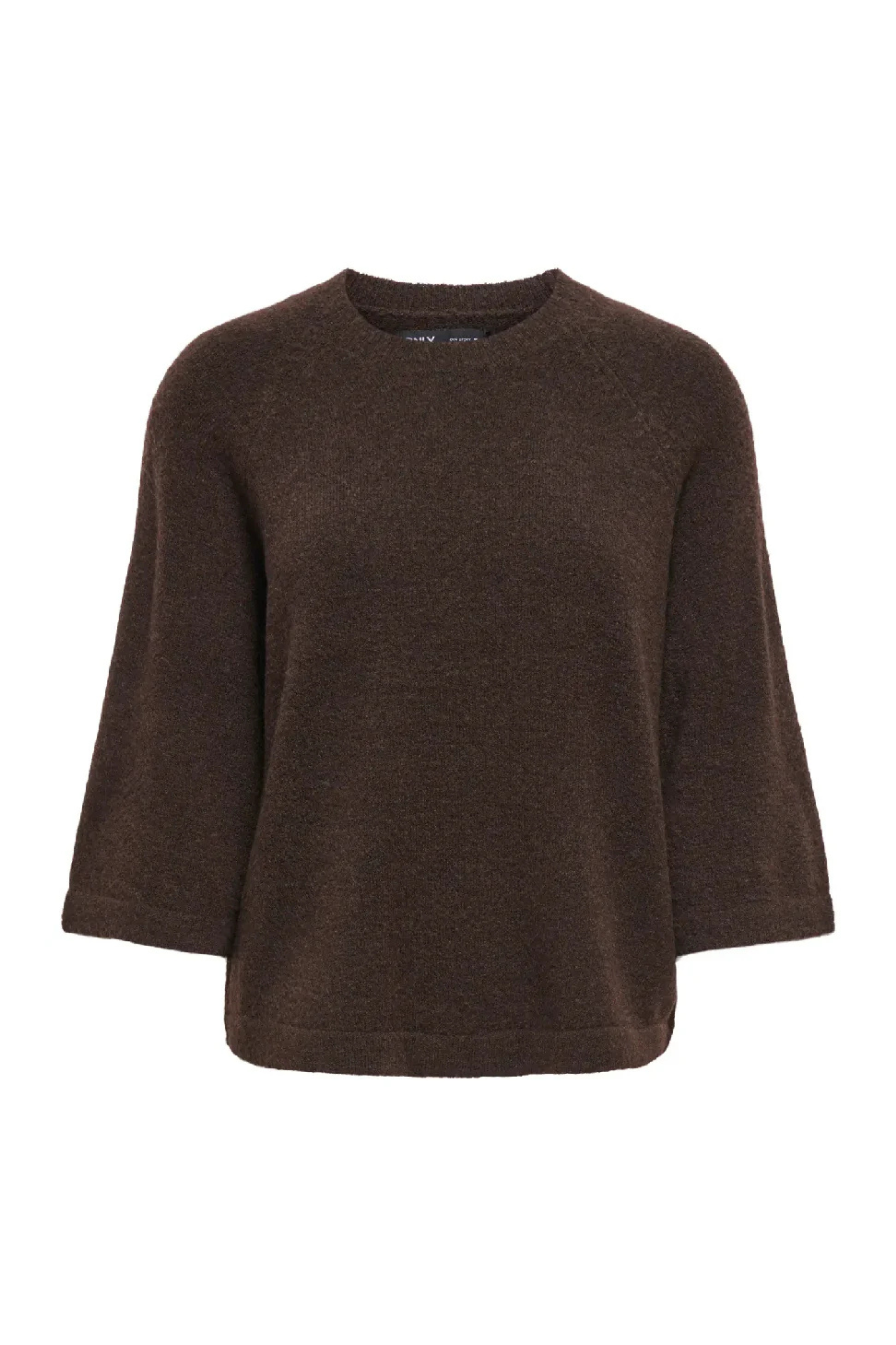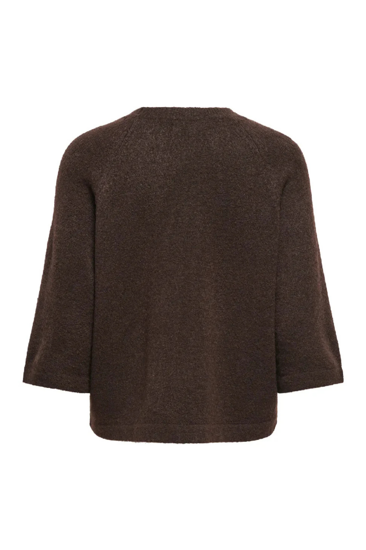 Only Simoni Pullover – en blød, enkel og tidløs strik i en dyb brun nuance. Modellen har en klassisk rund hals, let cropped længde og brede 3/4-ærmer, som giver et afslappet, moderne udtryk. Overfladen fremstår let børstet for et varmt og cozy look, mens pasformen er løs uden at blive oversize.