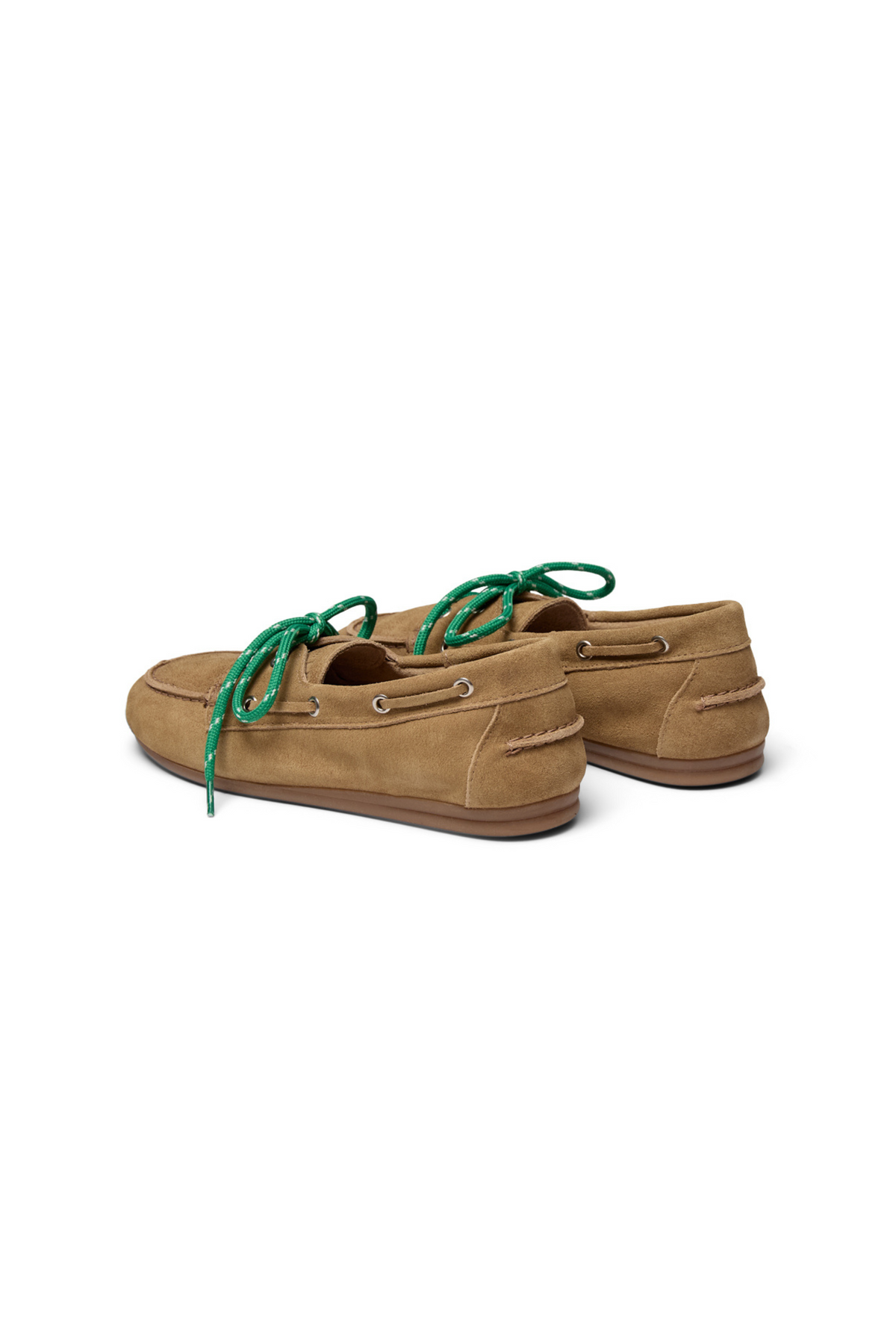 Denne loafer fra Pavement kombinerer et klassisk, maritimt udtryk med et moderne twist. Skoen er udført i blødt ruskind i en varm sand/camel nuance og har fine moc-toe syninger, metalliske snøreringe og en lav, komfortabel gummisål med godt greb. Den lette konstruktion gør den oplagt til både hverdagsbrug og pænere anledninger – perfekt til alt fra jeans til chinos, shorts og sommerkjoler.