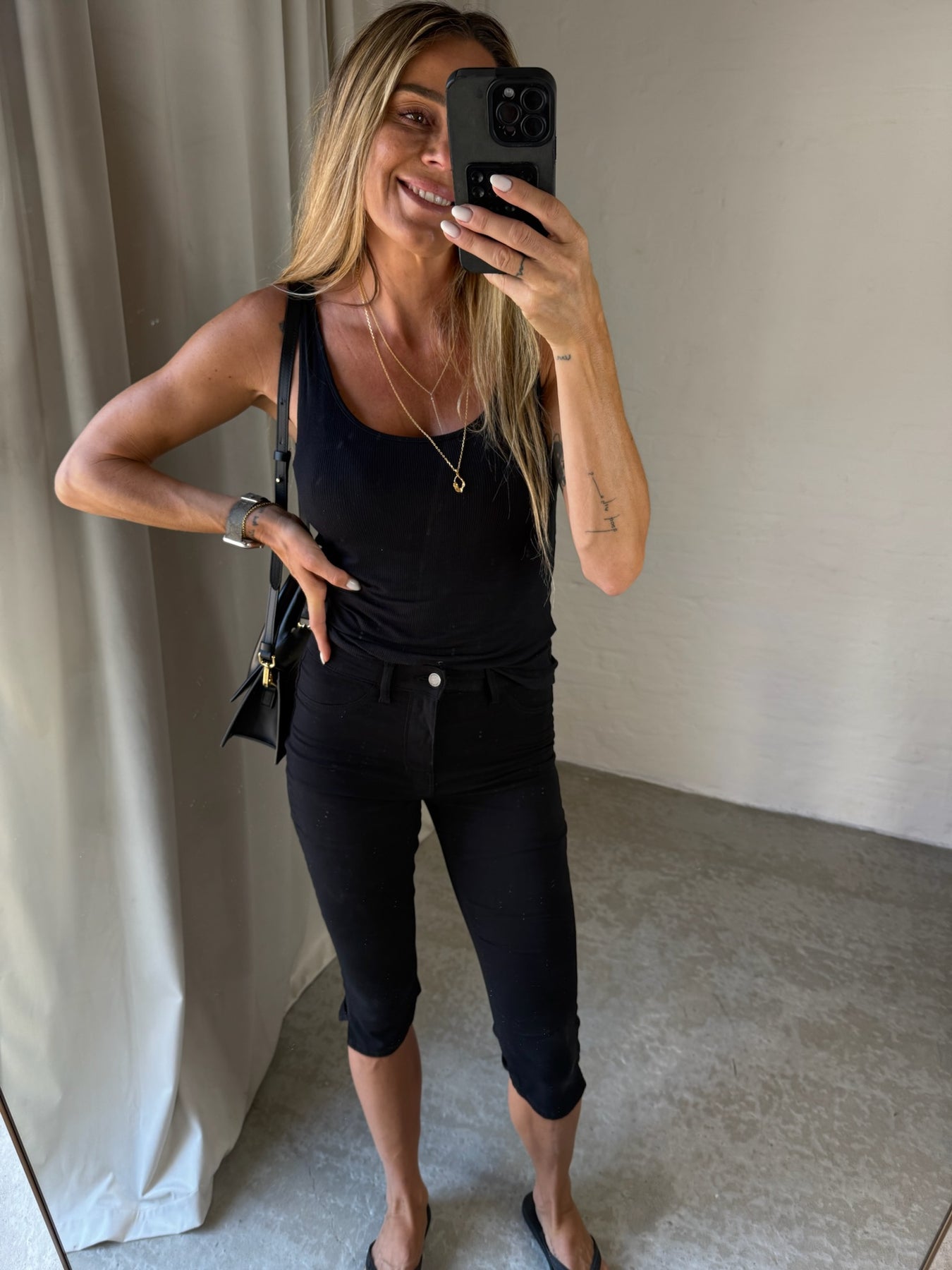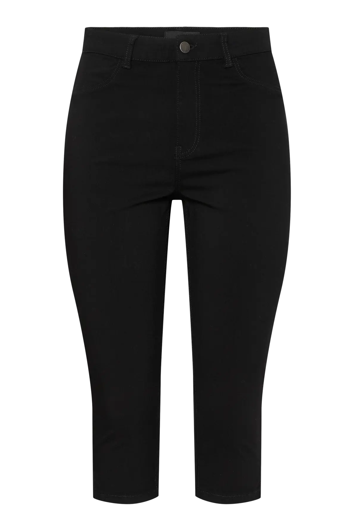 Sorte capri bukser fra Pieces med praktiske for- og baglommer. Den høje talje med elastik sikrer en behagelig pasform hele dagen, mens slidsdetaljen ved buksebenene giver et moderne touch.
