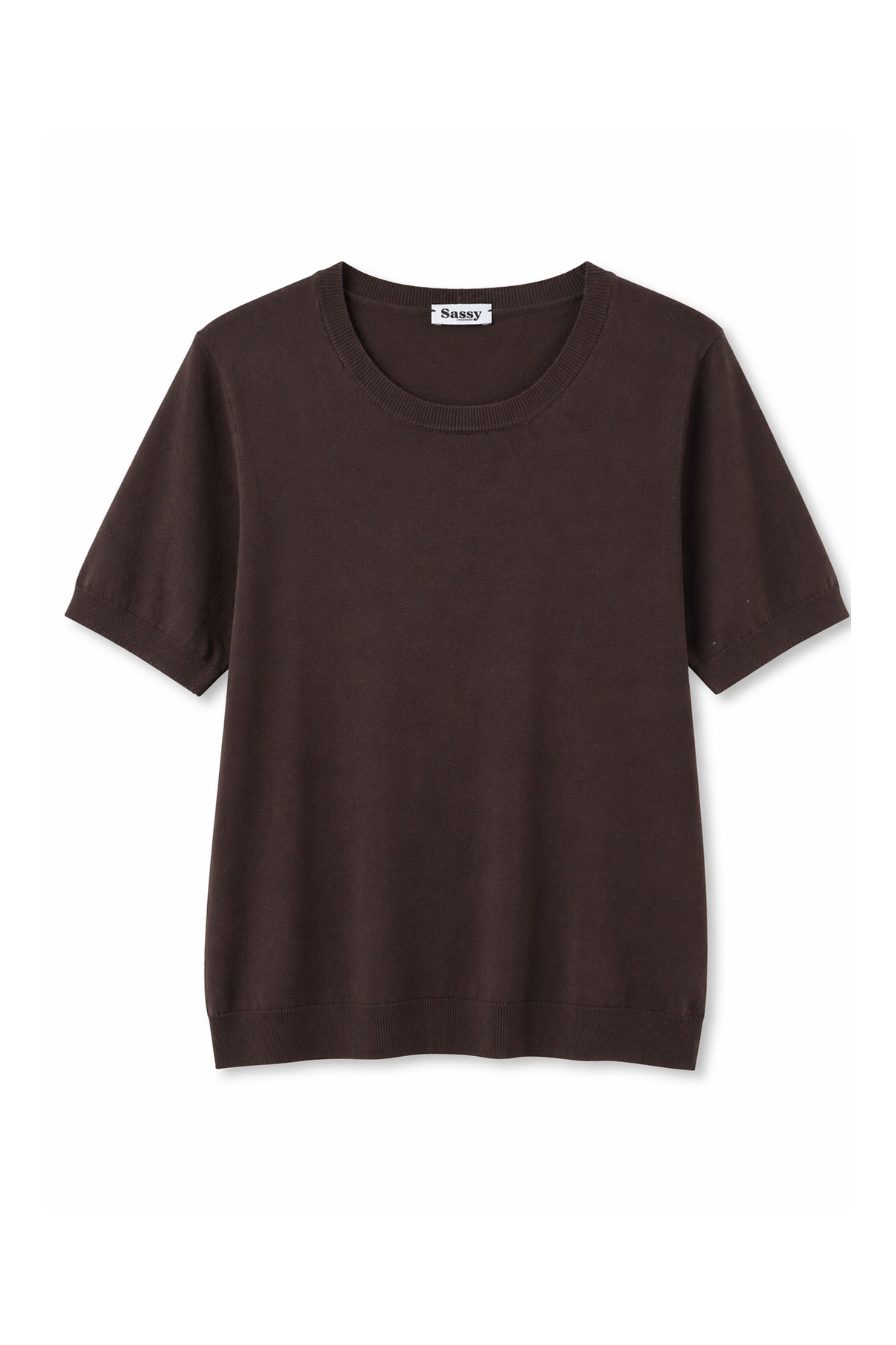 Kortærmet strikbluse fra Sassy Copenhagen i en smuk, dyb brun farve. Designet med rund halsudskæring, ribkanter og en afslappet pasform, der giver et enkelt og tidløst udtryk. Den bløde kvalitet gør blusen behagelig at have på og nem at style til både hverdag og mere elegante looks.