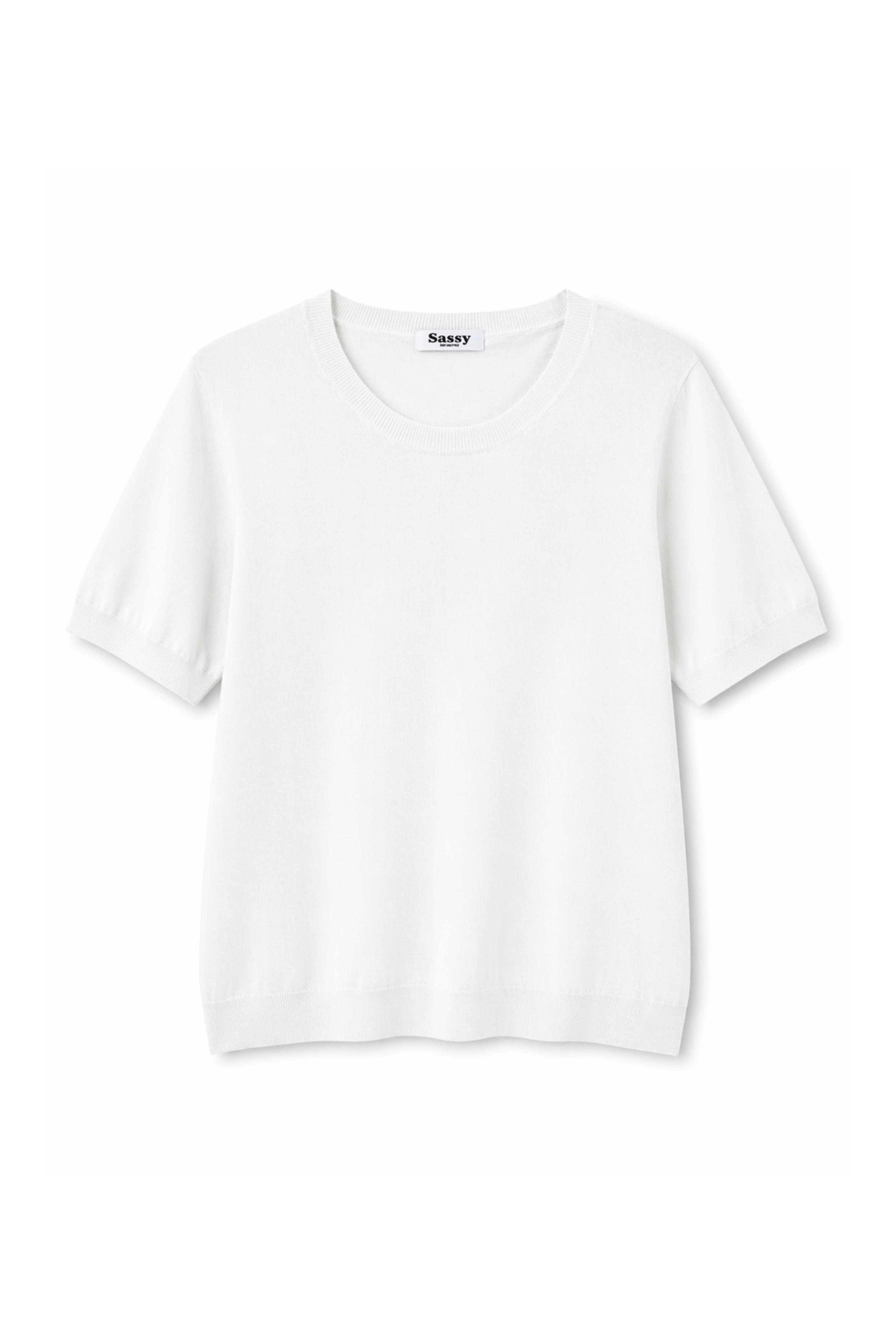 Kortærmet strikbluse i klassisk hvid med et rent og minimalistisk udtryk. Den har en rund halsudskæring med ribkant, korte ærmer og en afslappet pasform. Den fine strikkvalitet føles blød mod huden og gør blusen behagelig at have på. Den hvide farve gør den alsidig og nem at style – perfekt både til lyse sommerlooks og som base i en mere klassisk garderobe.