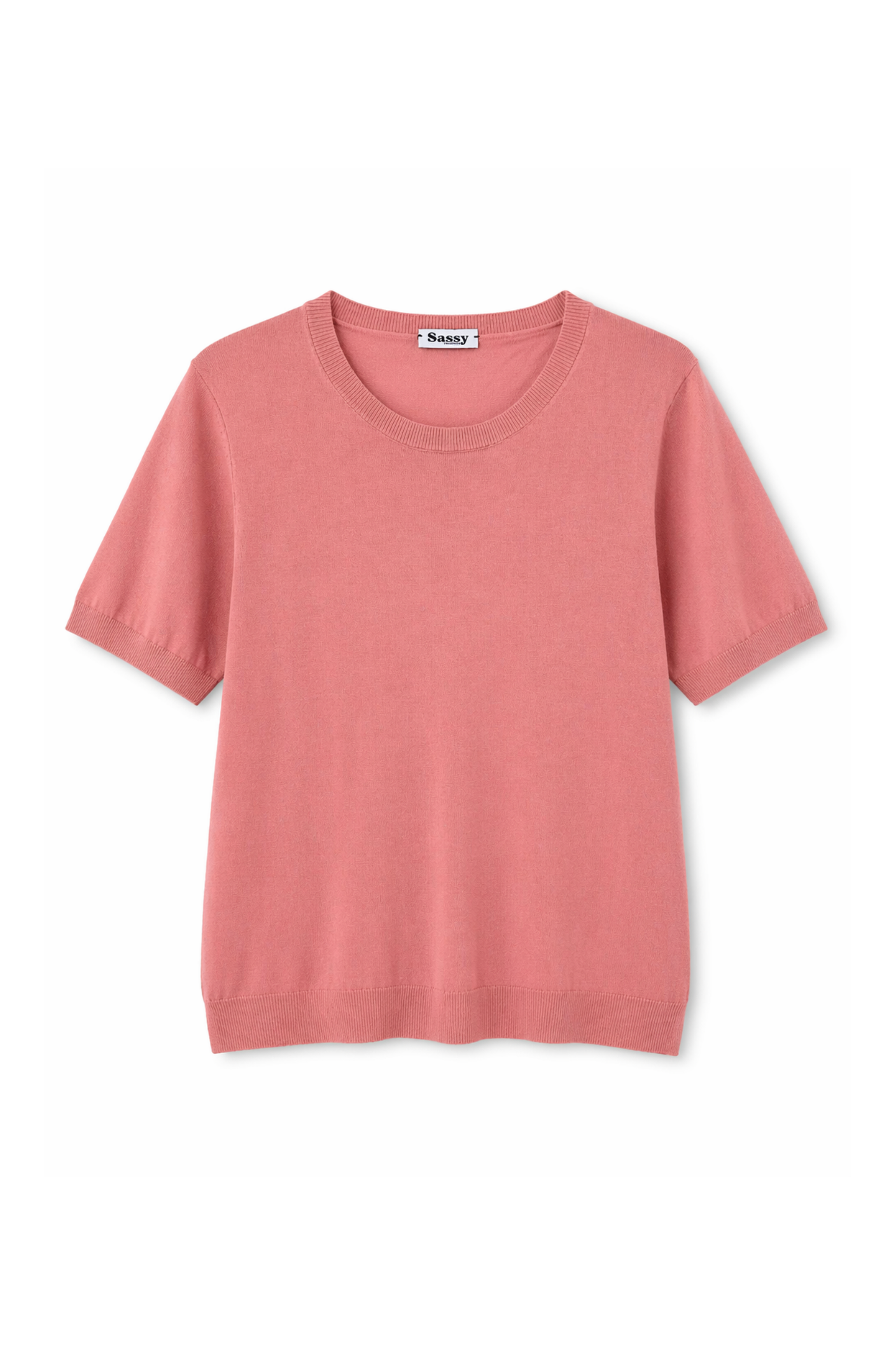 Blød og stilren strikbluse i en varm koralfarve. Blusen har en klassisk rund halsudskæring, korte ærmer og ribkanter ved hals, ærmer og bund, som giver et pænt og afsluttet look. Den lette kvalitet gør den behagelig at have på og velegnet til både hverdag og mere afslappede anledninger. Perfekt at style med lyse bukser eller jeans for et enkelt og feminint udtryk.