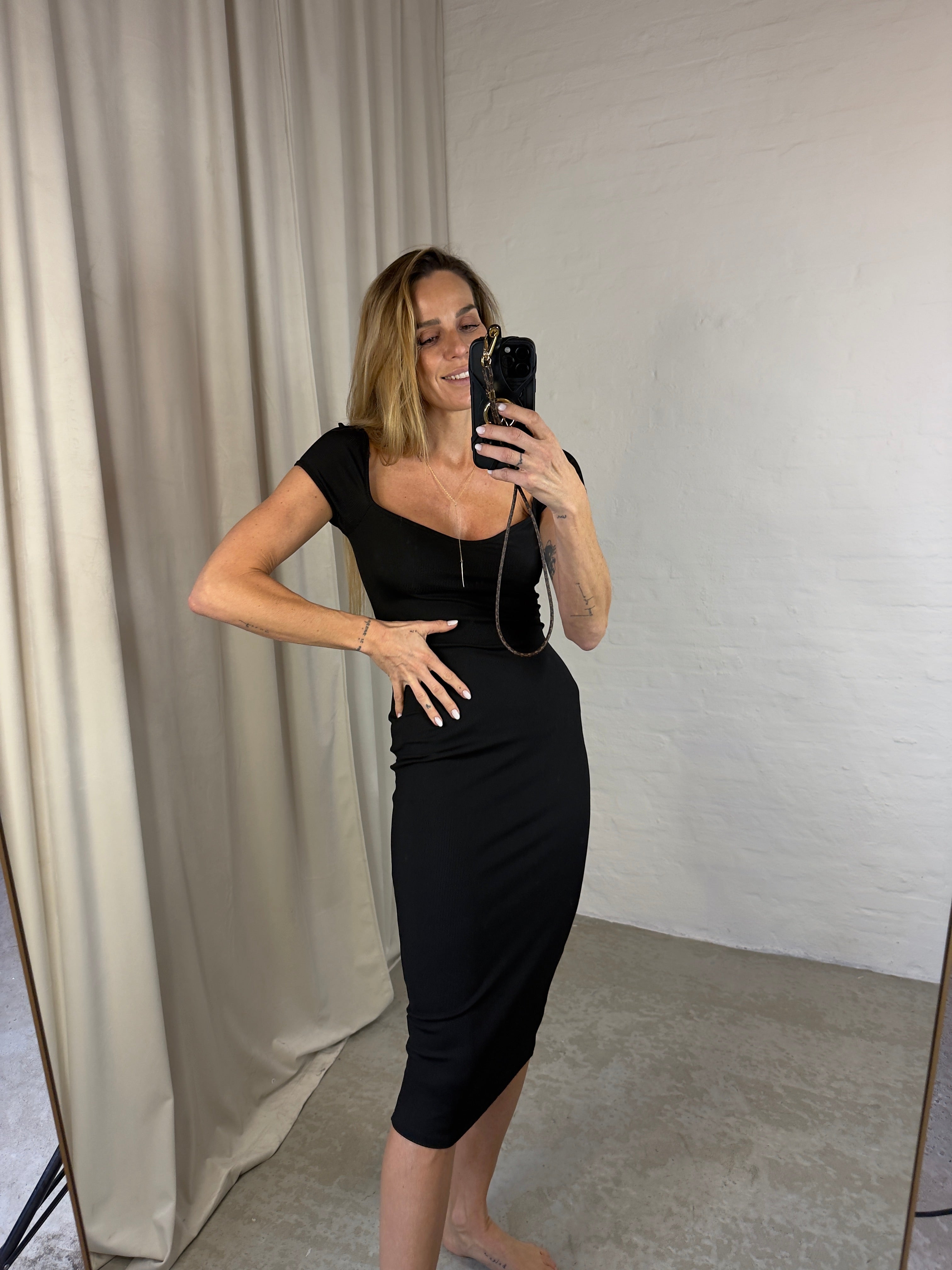 En stilren sort kjole, der kombinerer minimalisme, elegance og en perfekt pasform – et must-have i enhver garderobe.