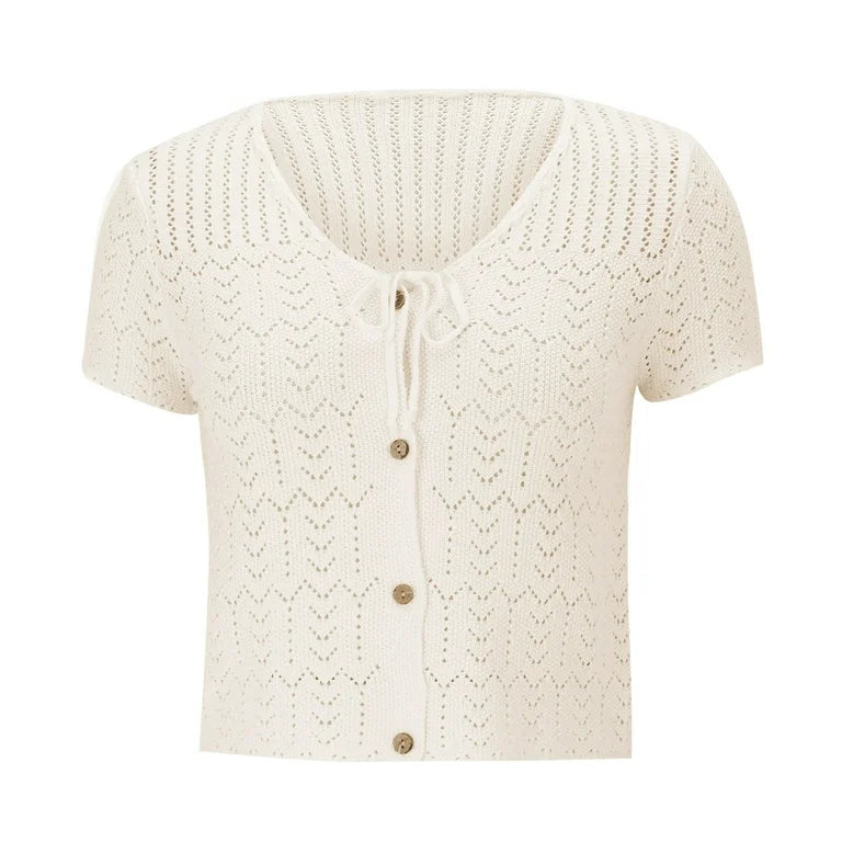 Denne Sassy Copenhagen-top har et detaljeret blondemønster og knapper hele vejen ned. Bindesløjfen ved halsudskæringen giver mulighed for personlig styling, mens den cropped pasform passer til højtaljede styles.