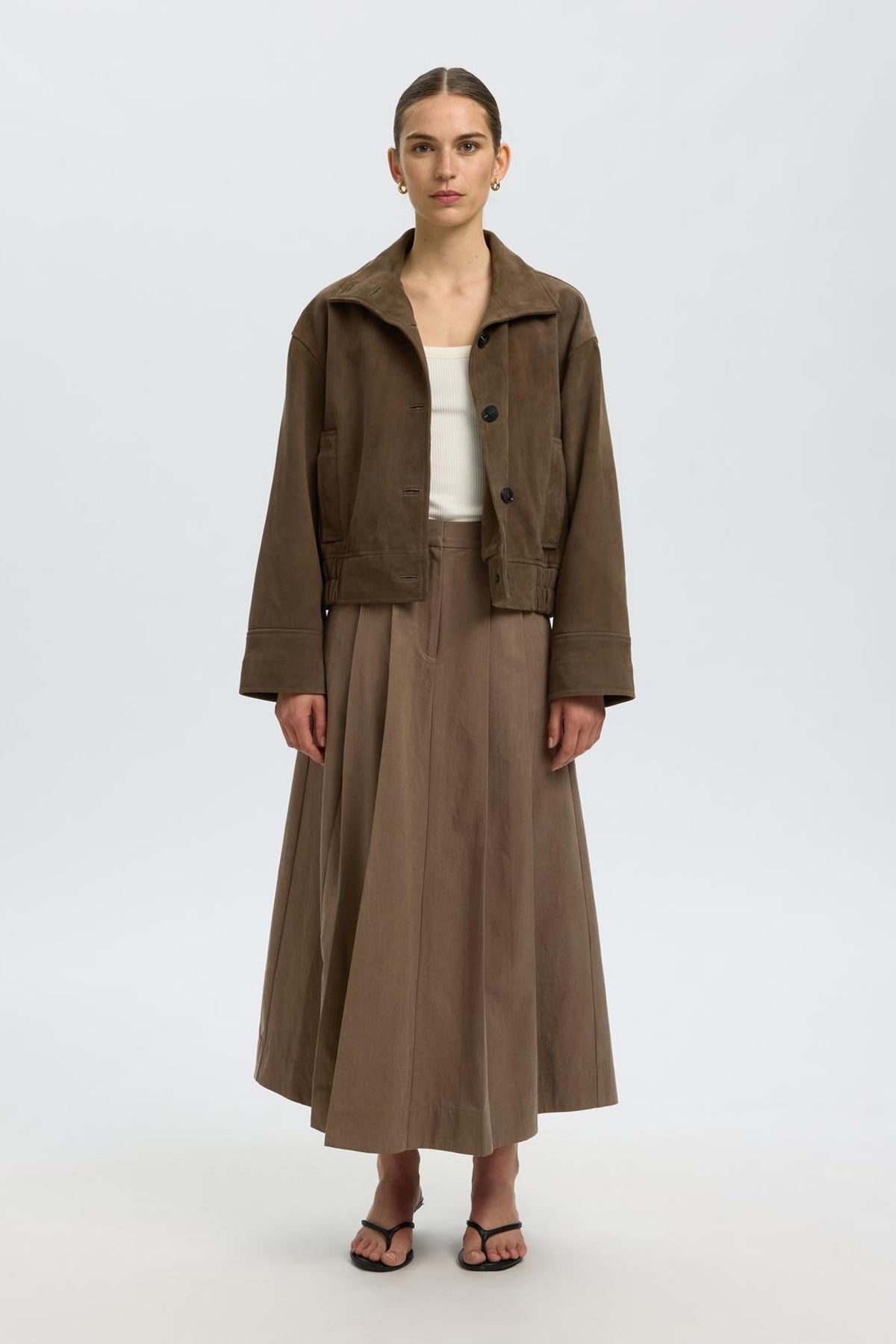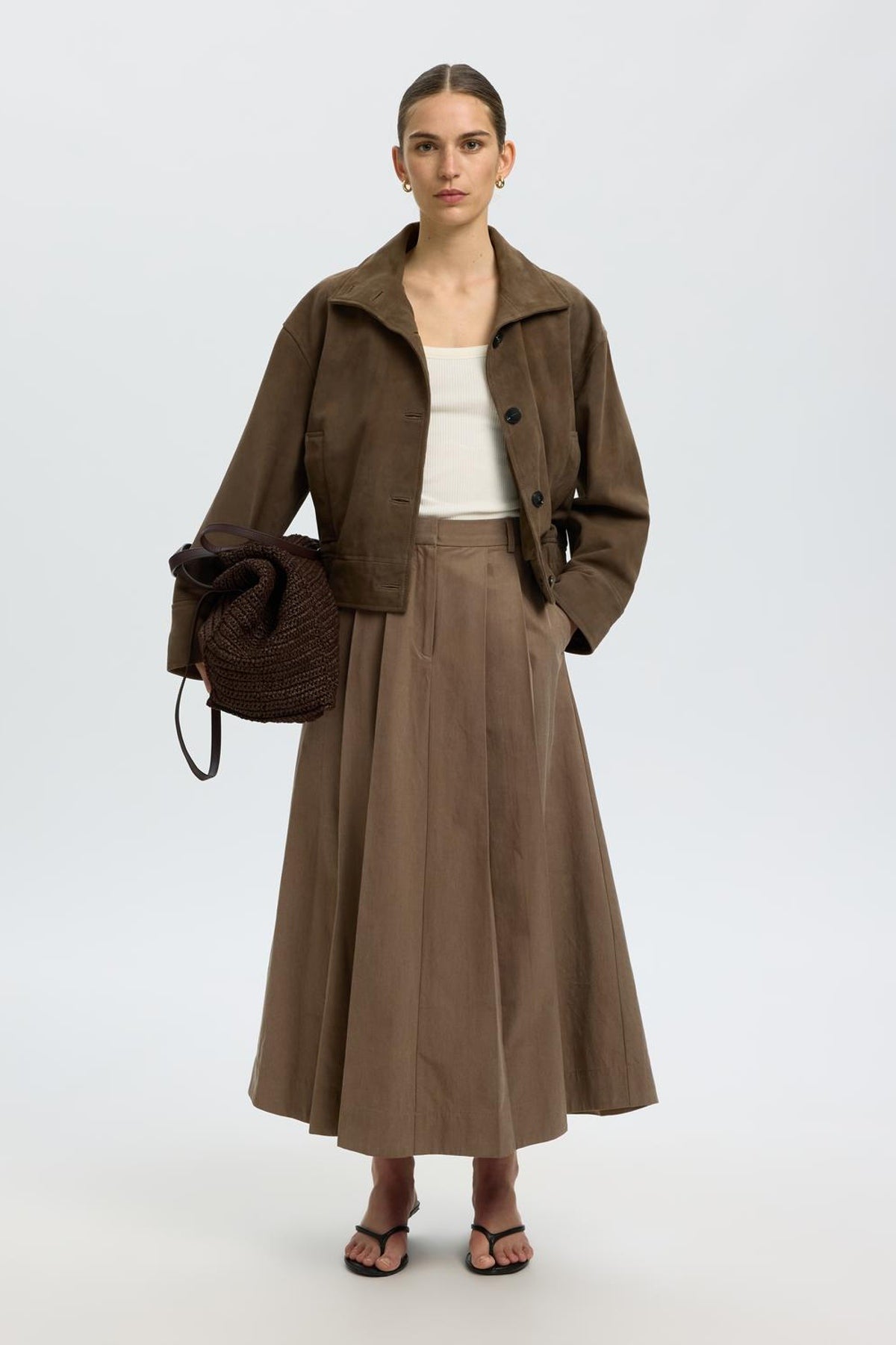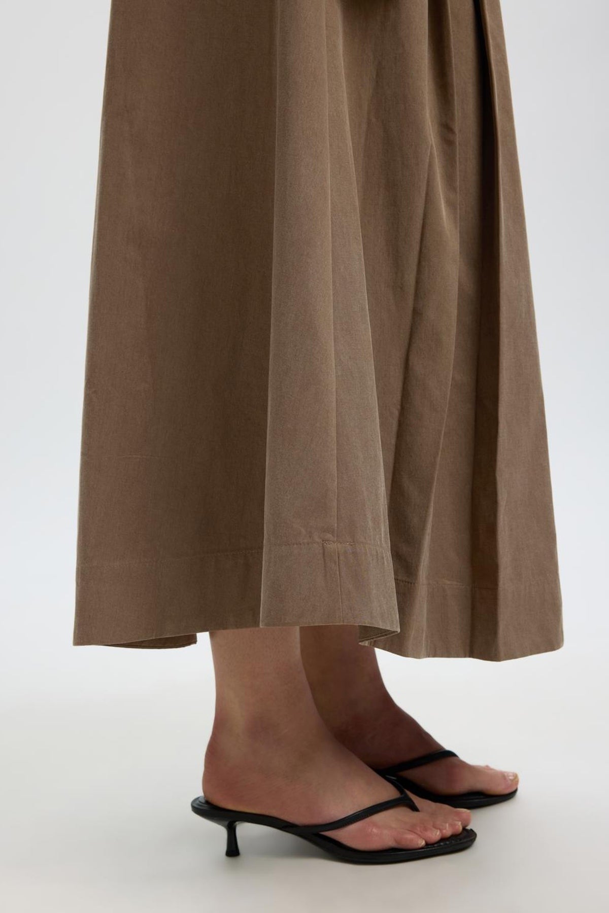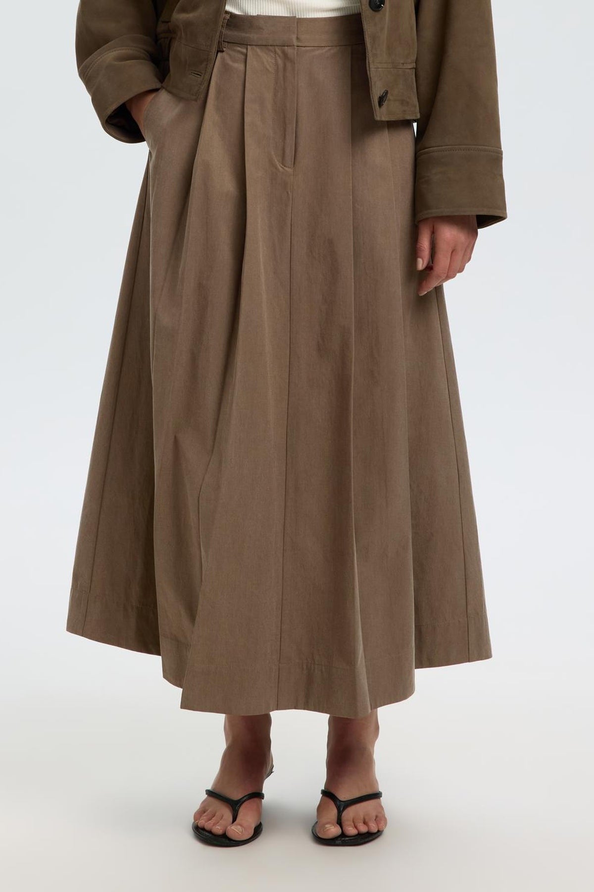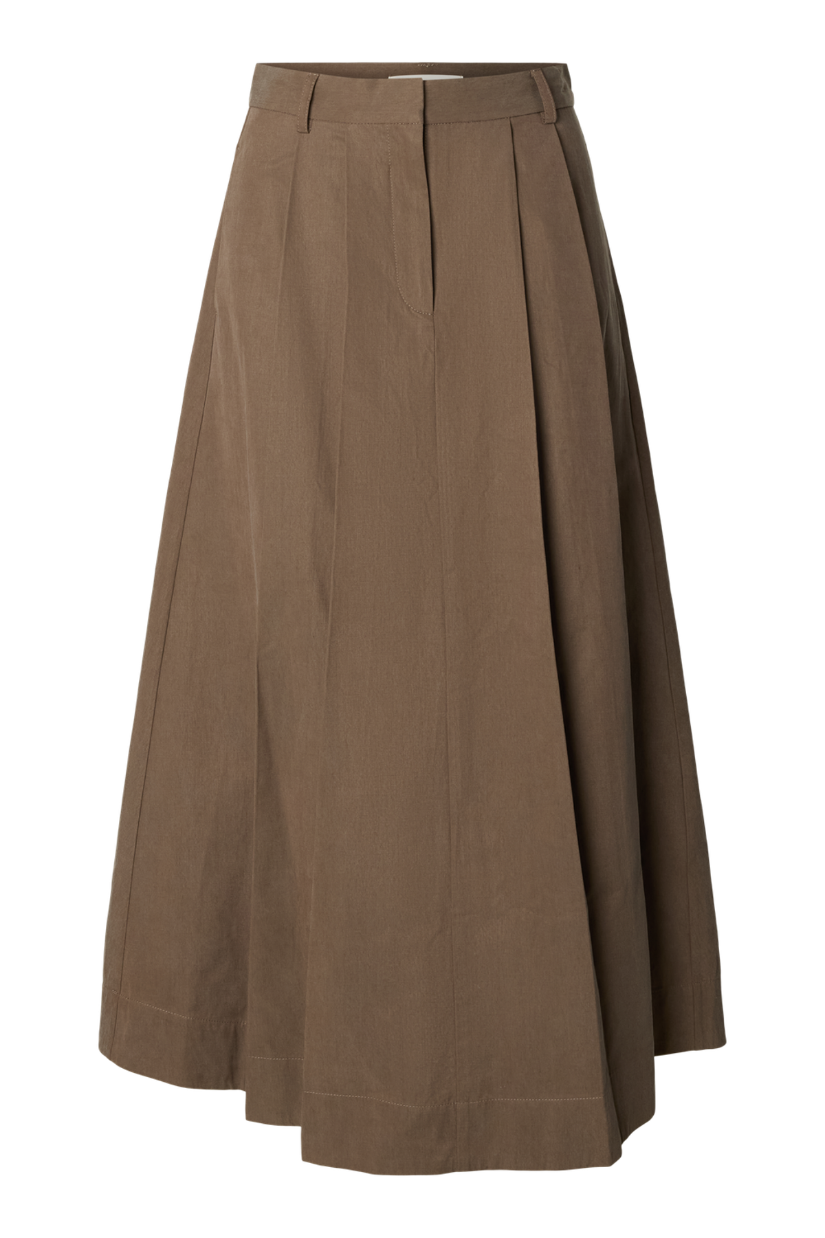 Denne lange nederdel fra Selected Femme i en varm, mellembrun nuance har en høj talje og diskrete læg, der giver et feminint og elegant fald. Den er forsynet med bæltestropper og en lukning med knap og lynlås for et klassisk finish. Materialerne kombinerer TENCEL™ Lyocell og bomuld, hvilket giver en blød og åndbar kvalitet velegnet til hele året.