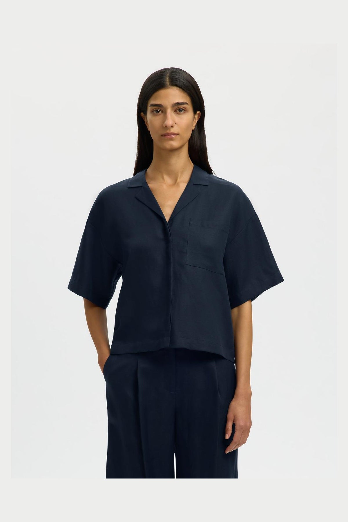 Den boxy skjorte med 2/4 ærmer kombinerer en let og behagelig blanding af 68% lyocell TENCEL™ og 32% hør, hvilket giver en naturlig og åndbar følelse. Skjorten har en klassisk skjortekrave og lukkes med knapper, og den har desuden en praktisk brystlomme. Den mørke safirfarve tilføjer et sofistikeret og tidløst udtryk, som passer perfekt til forårssæsonen.