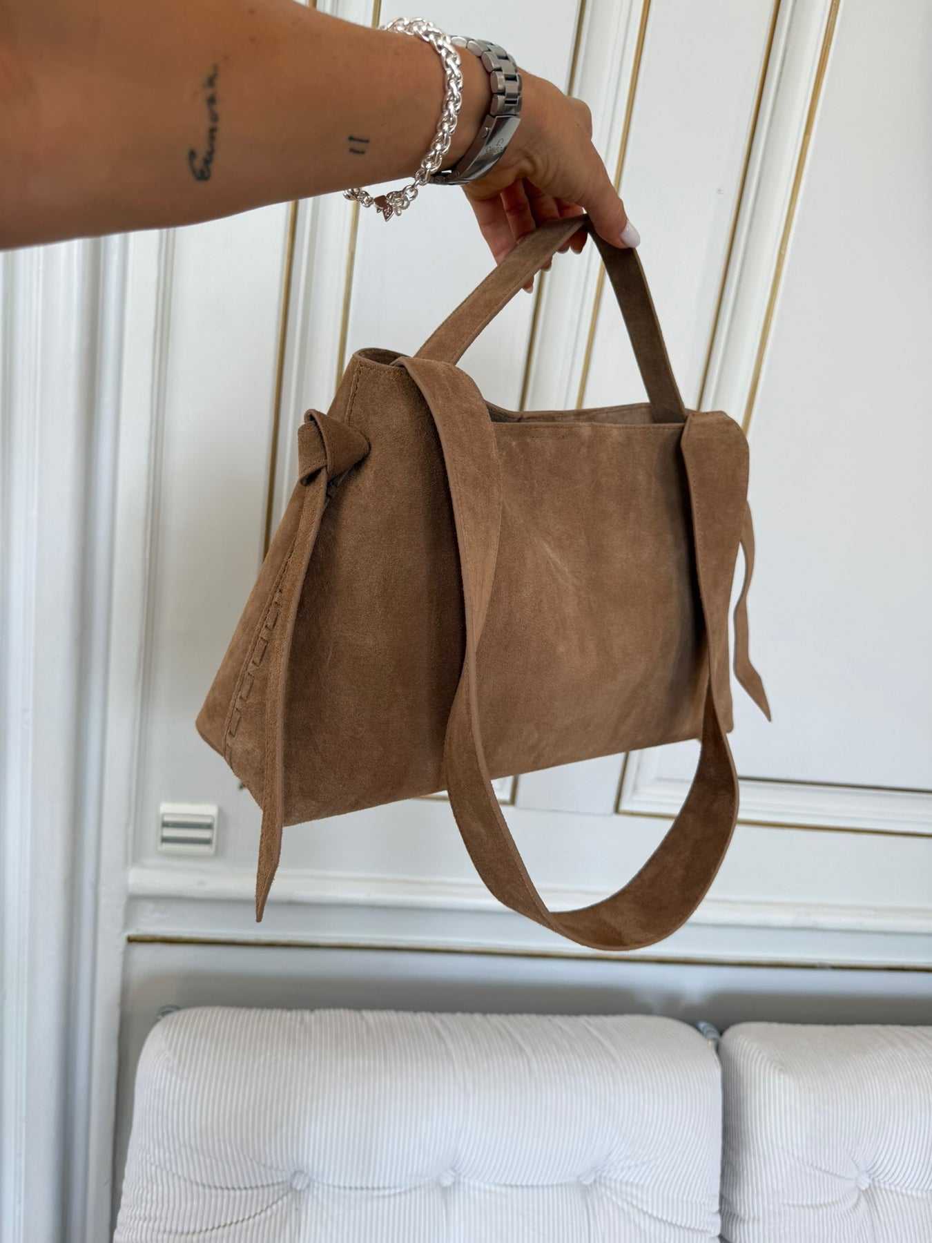 Tasken i medium størrelse er fremstillet i blødt kalvesuede med en flot knudedetalje, der giver den et unikt og elegant look. Den har en justerbar skulderrem for fleksibel bæring og en magnetisk lukning, der sikrer let adgang samtidig med, at indholdet holdes sikkert. Indvendigt finder du en lynlåslomme, der hjælper med at organisere mindre genstande. Taskens farve i en varm tan nuance giver et naturligt og alsidigt udtryk, der passer til mange outfits.