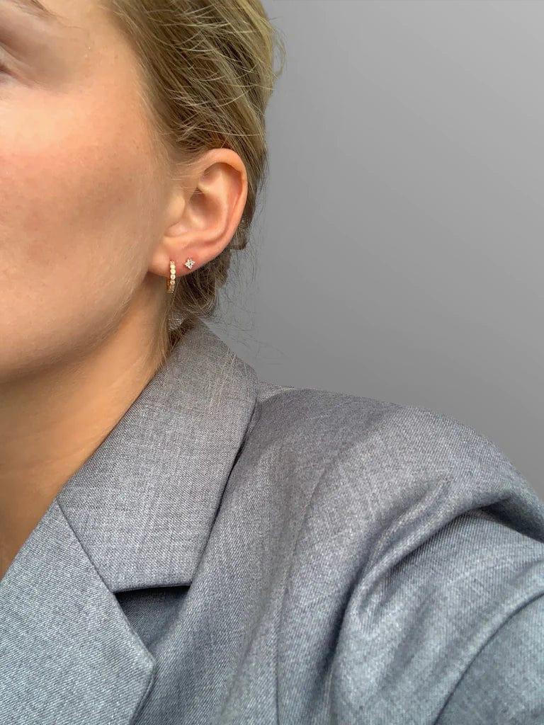 Andcopenhagen hoops med en kontinuerlig række af zirkonia-sten langs kanten. De er fremstillet i 925 sterlingsølv med 18 karat guldbelægning og har en diameter på 12 mm.