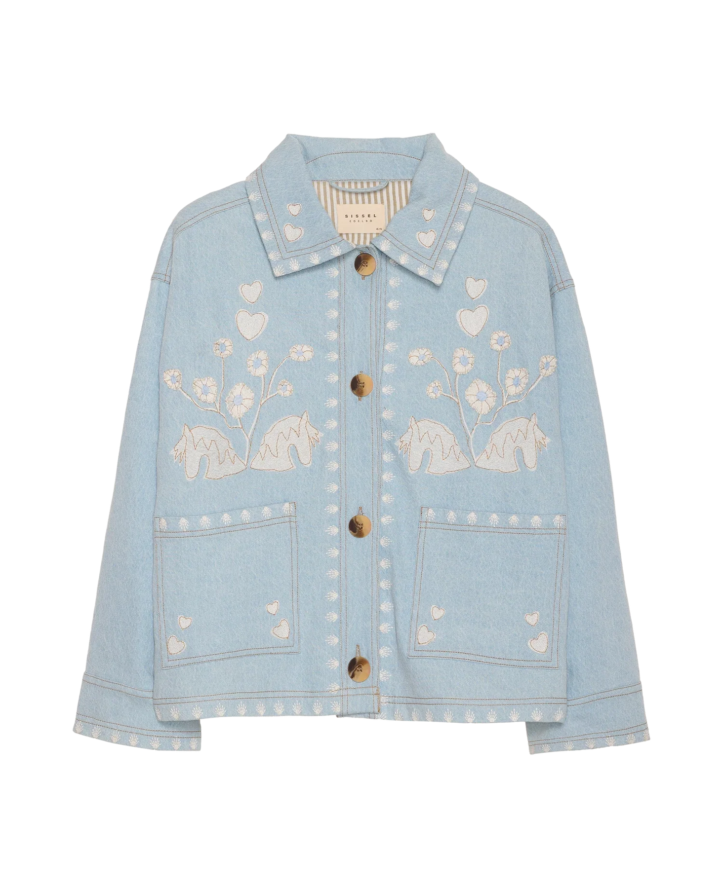 Dekorative frynser i matchende denim løber langs rygstykket og ærmesømmene og giver et legende udtryk. Den er smukt udsmykket med poetisk broderi og fine perledetaljer. Indvendigt er jakken foret med stribet leftover bomuld for et gennemført finish.