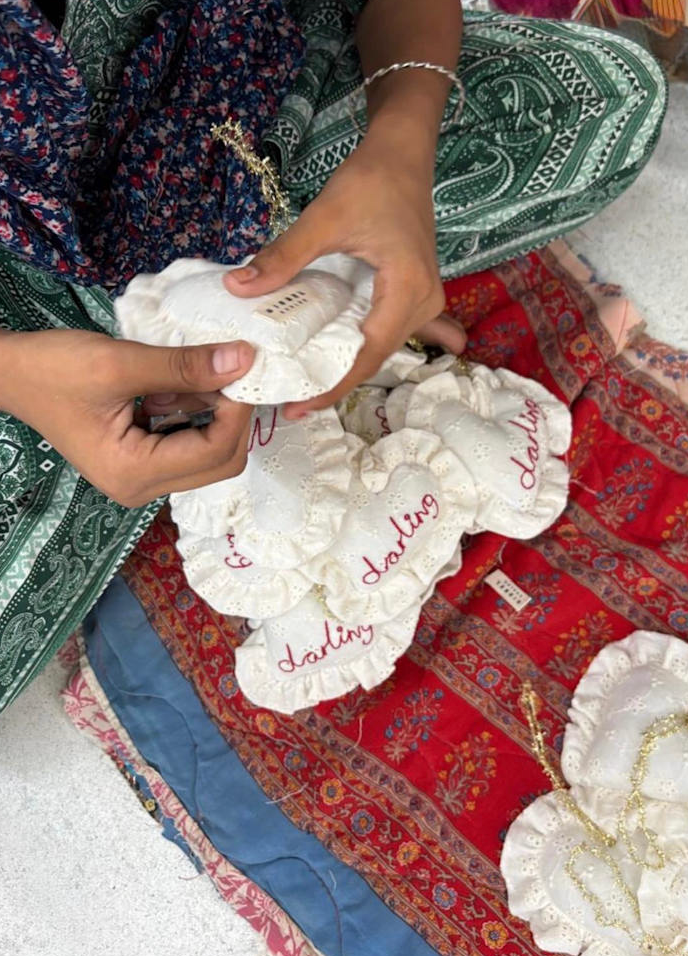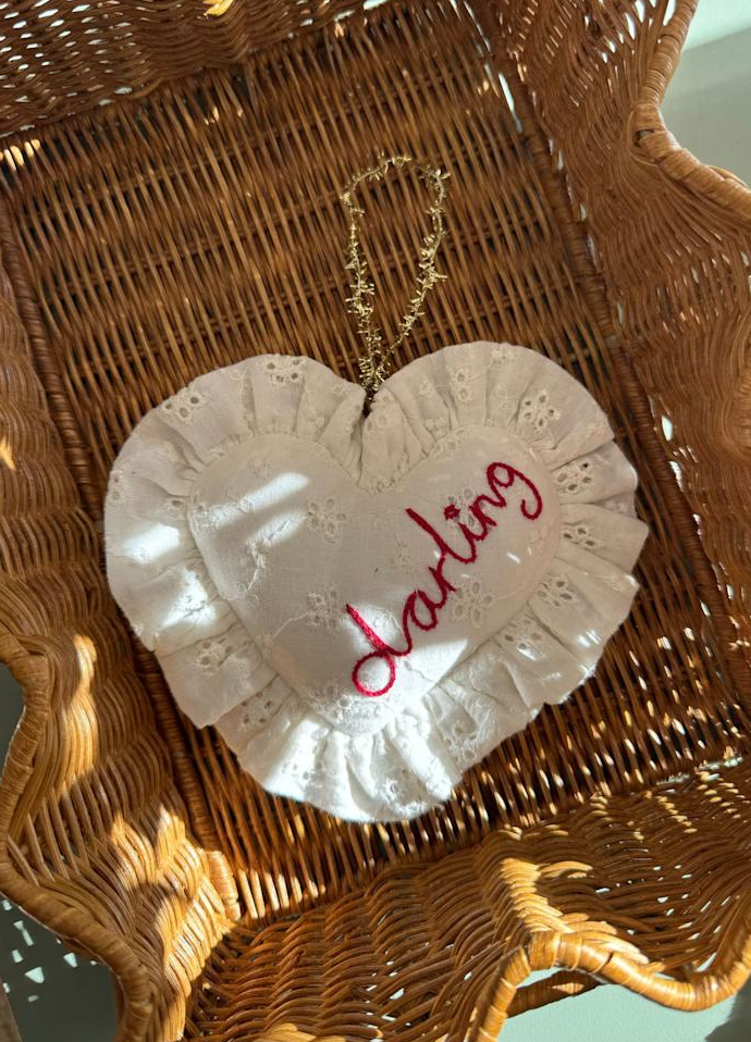 Giv dit juletræ et kærligt og håndlavet præg med dette Sweetheart-ornament. Den er lavet af overskydende broderie anglaise-stof og har en let vattering, der giver et blødt og fyldigt udtryk. Ornamentet er dekoreret med fine flæser langs kanten og smukt broderet med ordet “darling” i rød tråd – en sød hyldest til en som er dit hjerte nært. Perfekt til at sprede julestemning og varme i hjemmet.