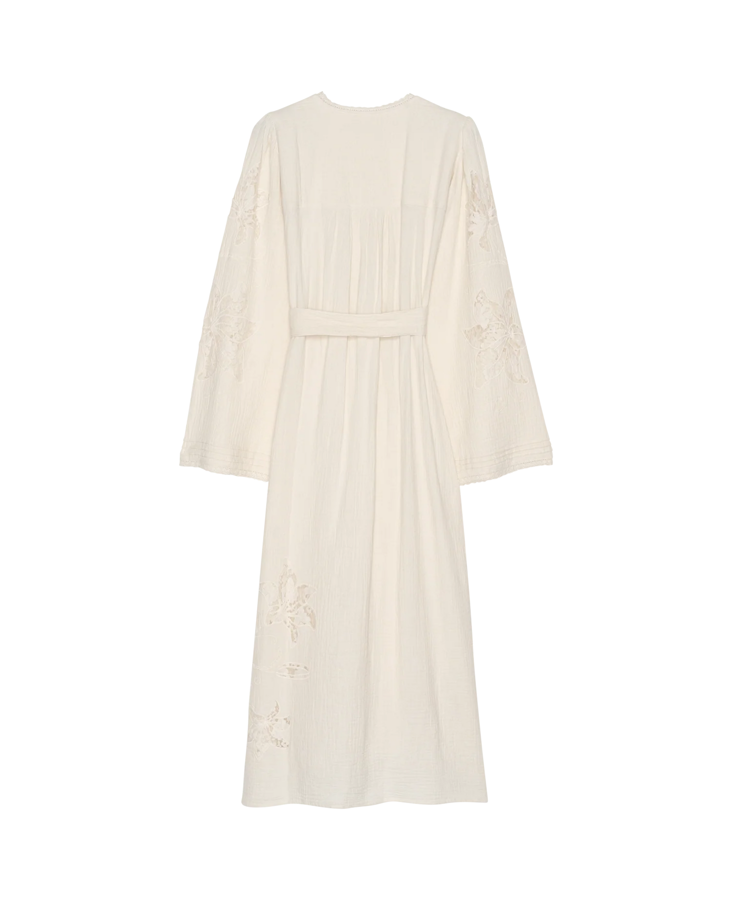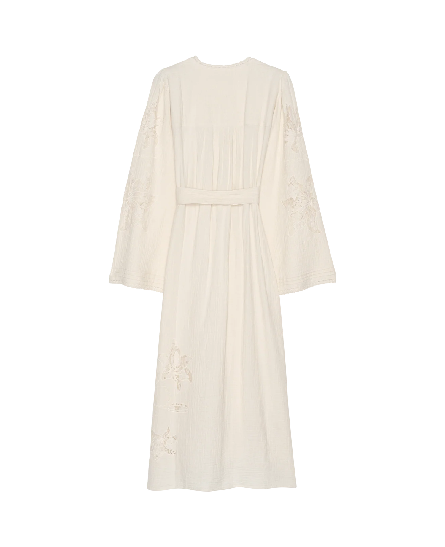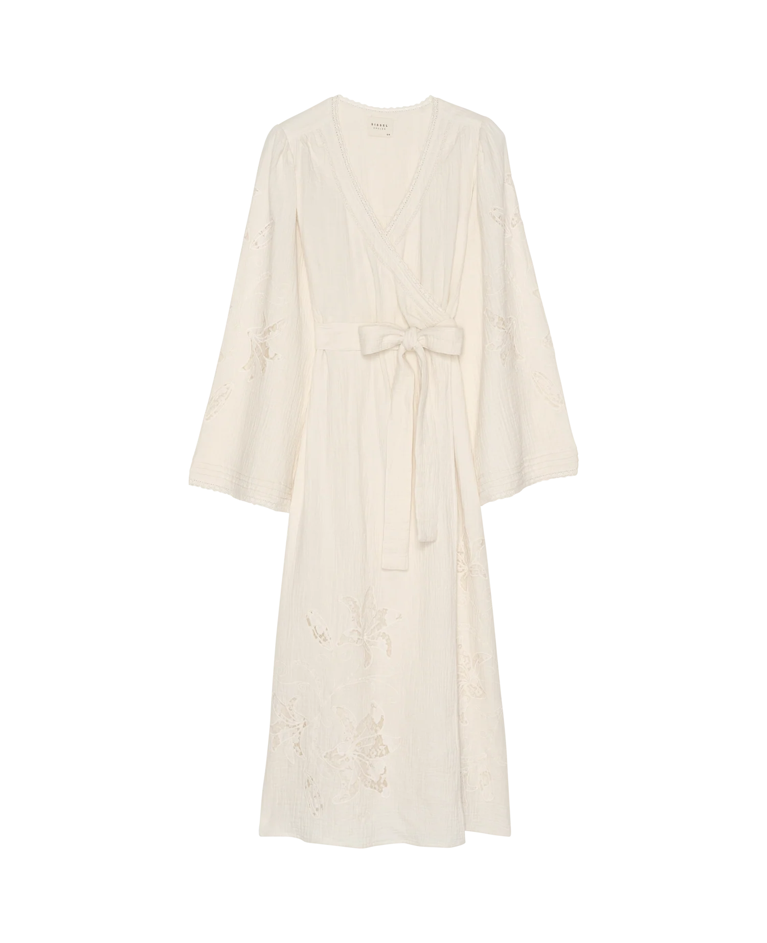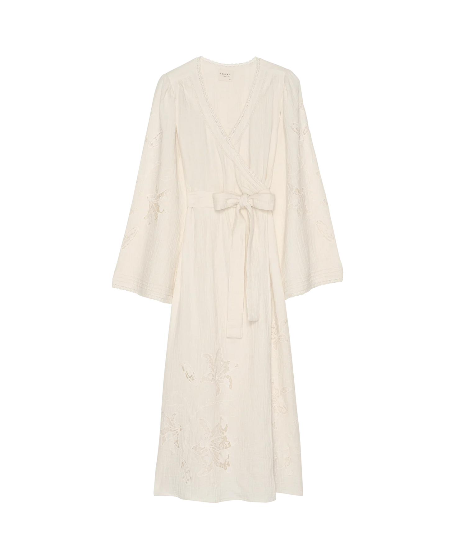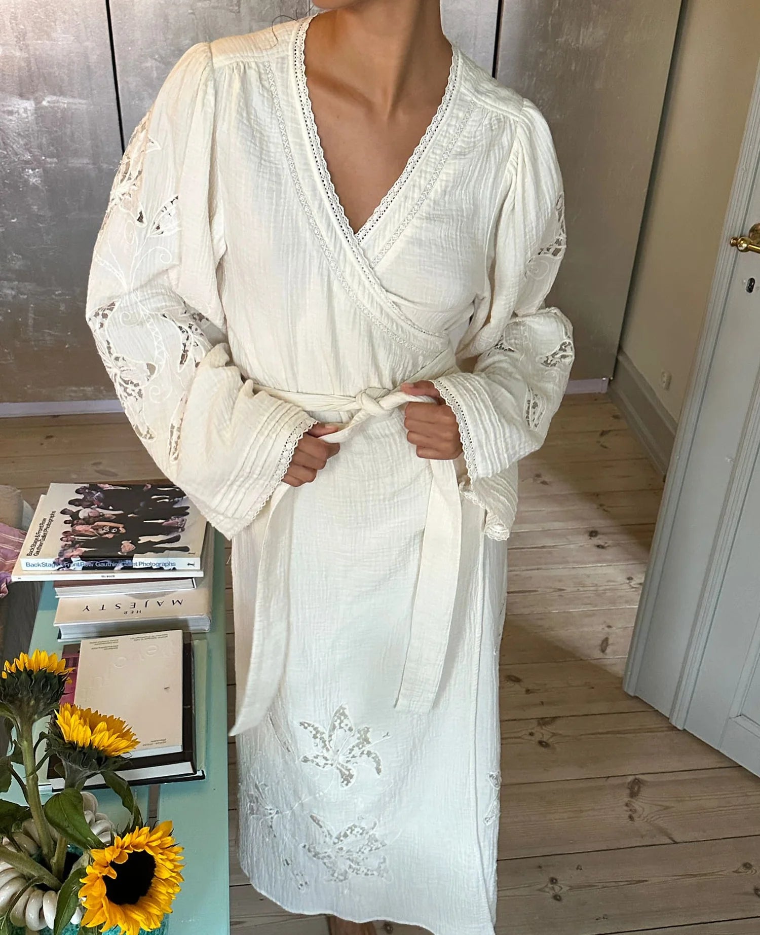 Winfrey Wrap Dress fra Sissel Edelbo er en feminin slå-om kjole i blød, vaffelstruktureret double gauze i 100% økologisk bomuld. Kjolen har en elegant silhuet med bindebånd i taljen, der fremhæver formen på en let og komfortabel måde. De lange, vidde ærmer og de fine blomsterbroderier foran og på ærmerne giver et romantisk udtryk, mens tone-i-tone bomuldsblonde ved hals og ærmer fuldender designet.