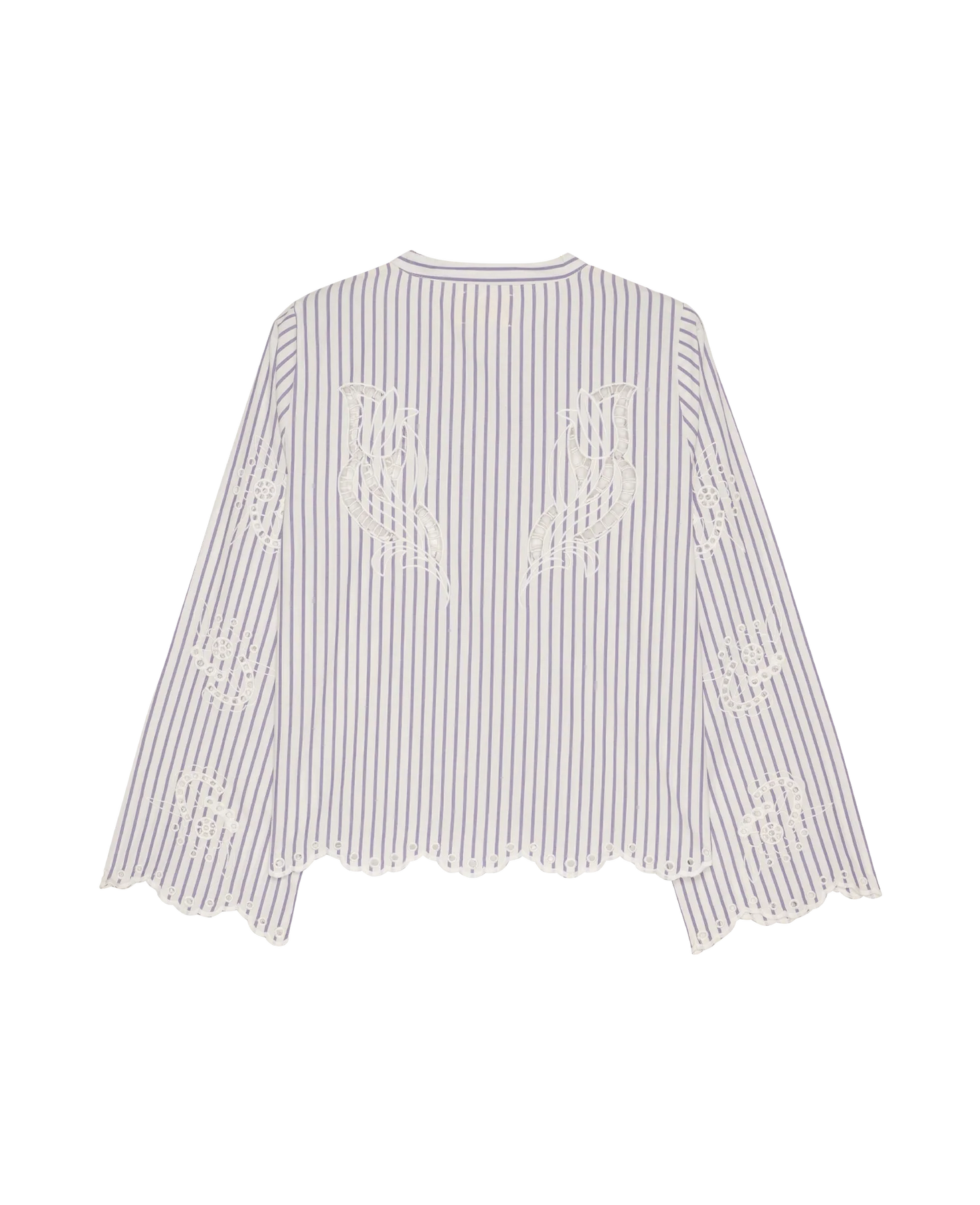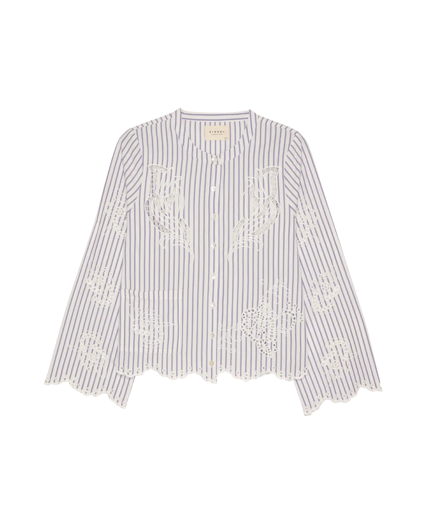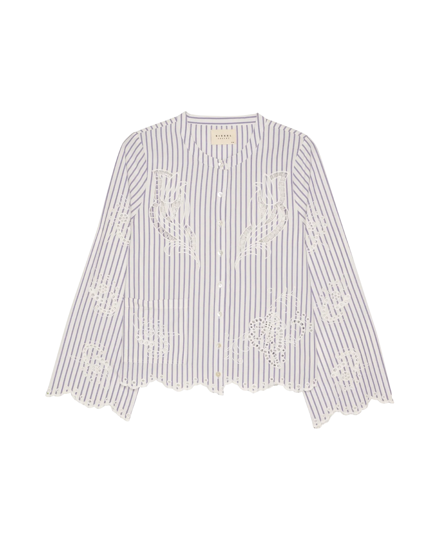 Designet er gennemført med en rund halsudskæring og en front placket med fine, lyse mother-of-pearl buttons. Den har lange ærmer samt en klassisk brystlomme, mens de dekorative detaljer virkelig gør den særlig: skjorten er udsmykket med delicate cutwork embroidery og afsluttes med scalloped edges langs bundkanten, hvilket tilføjer et romantisk og eksklusivt præg.