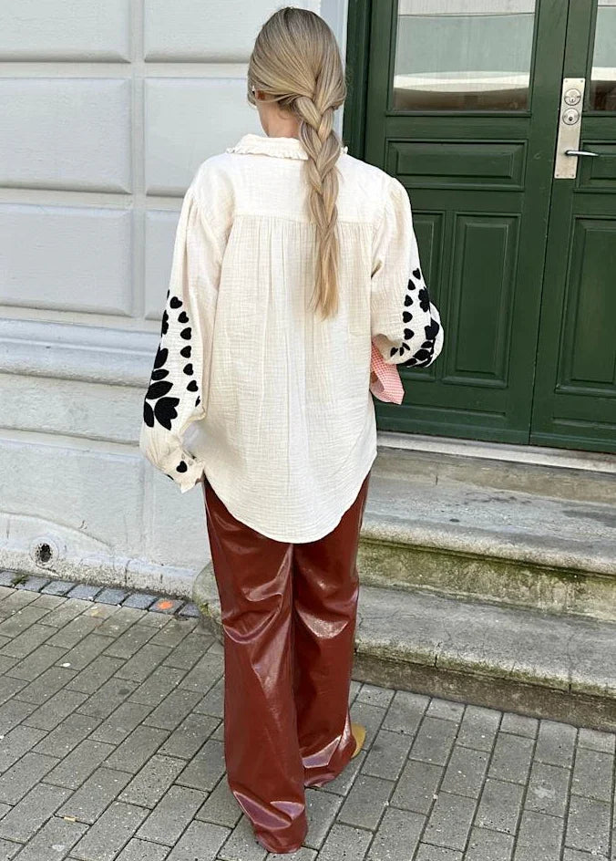 Hvid skjorte fra Sissel Edelbo med sort blomster- og hjertebroderi. Skjortens sofistikerede design skaber et professionelt udtryk, der gør den velegnet til forretningsrelaterede sammenhænge. Perlemorsknapper og flæsekrave fuldender designet.