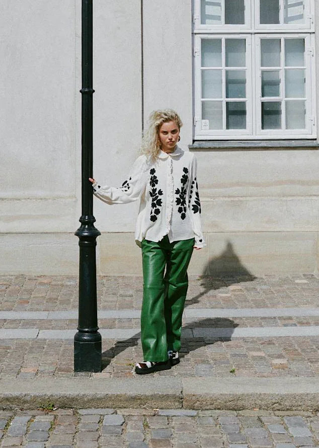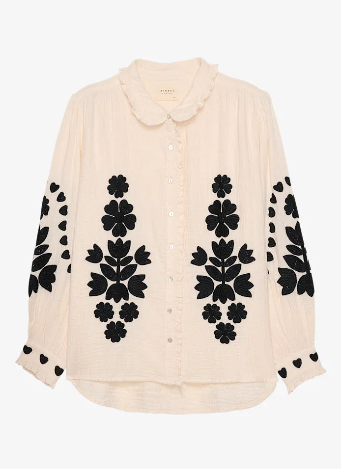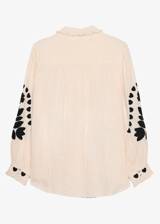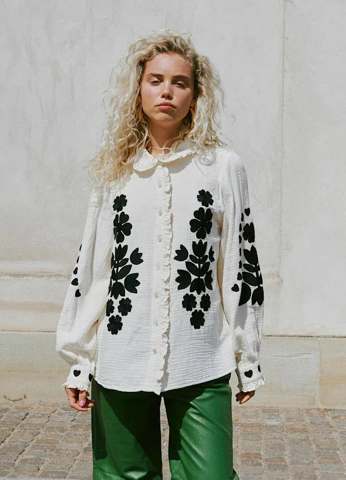 Skjorte med blomsterbroderi og flæsekrave