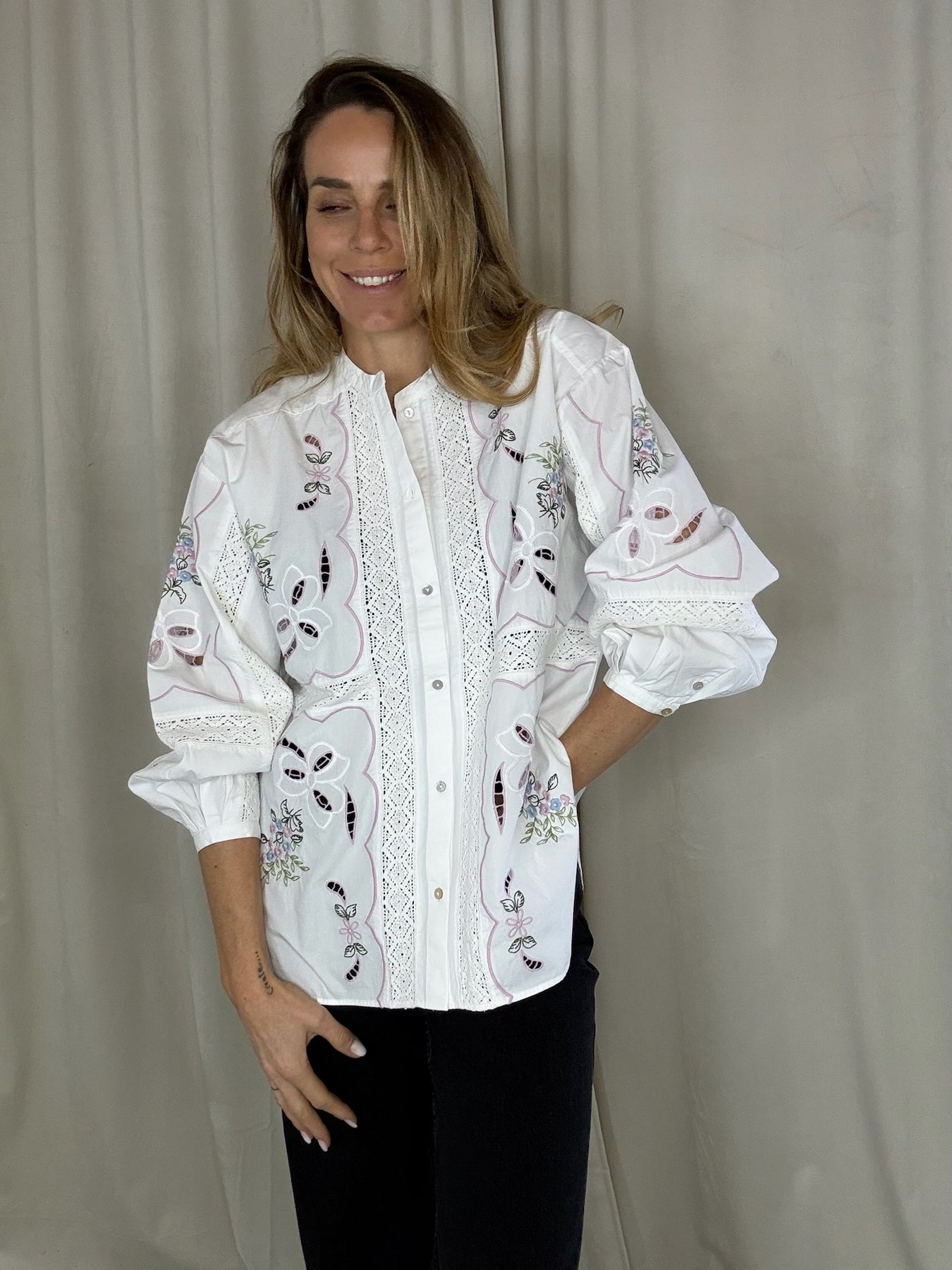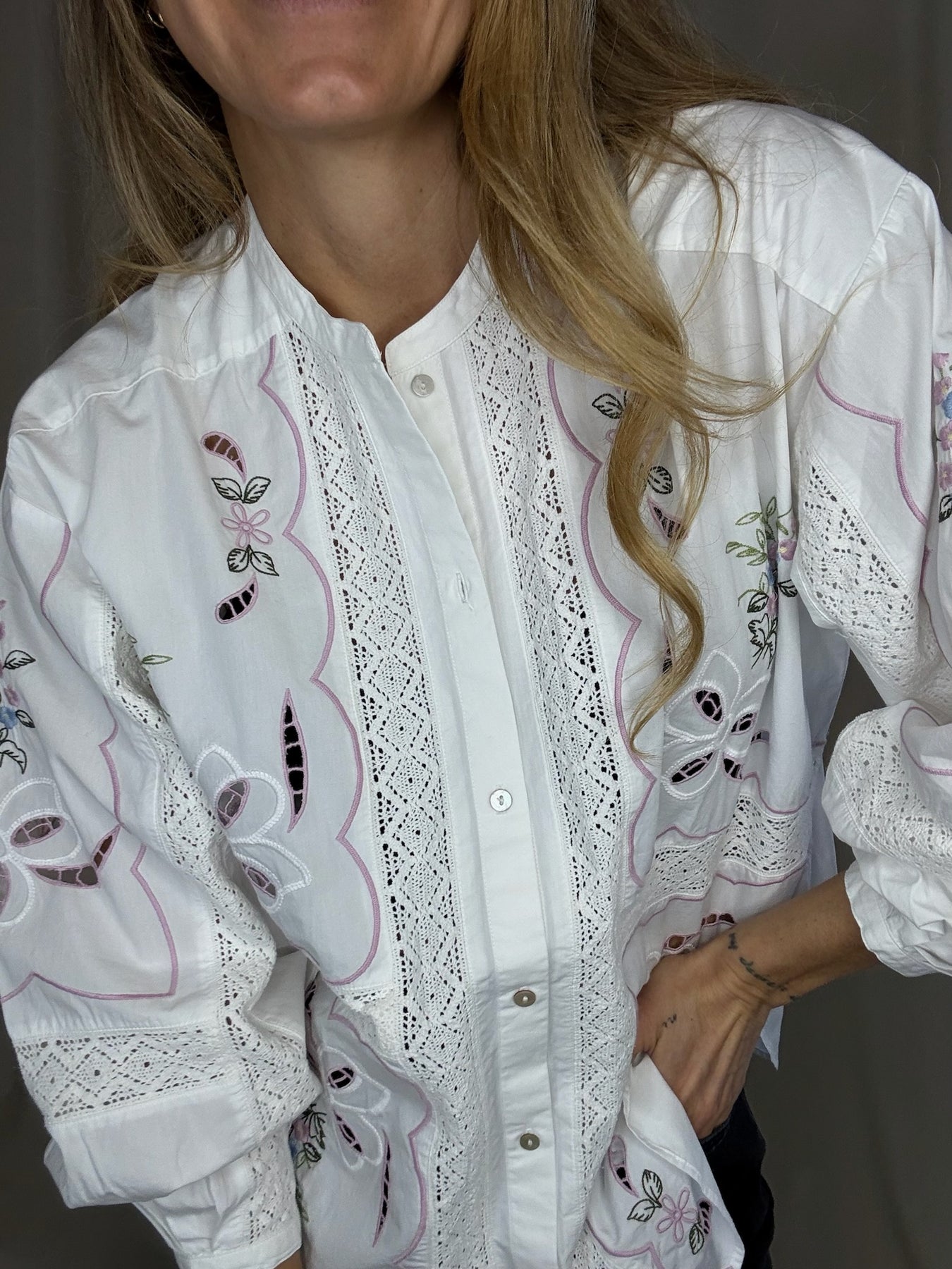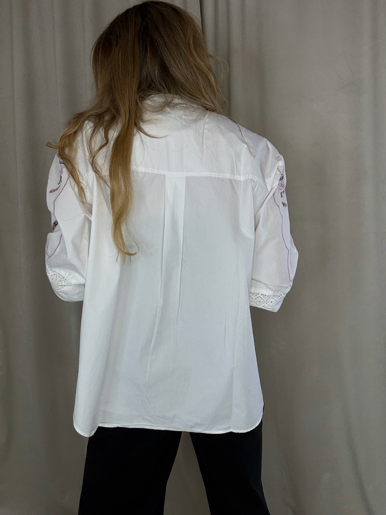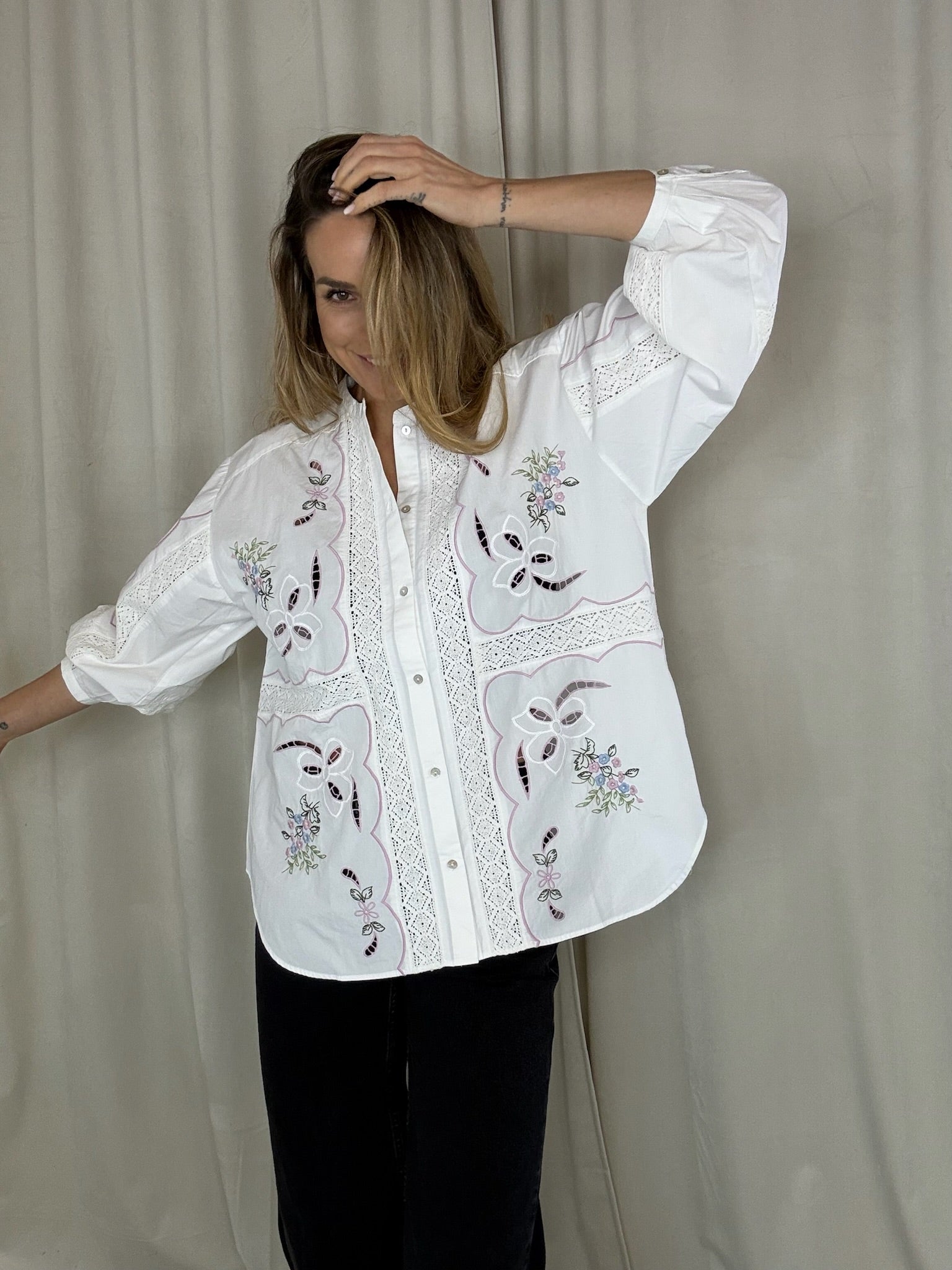 Designet er dekoreret med poetiske broderier inspireret af en vintage dug og detaljeret med smukke blondebånd, som skaber et unikt og håndlavet præg.