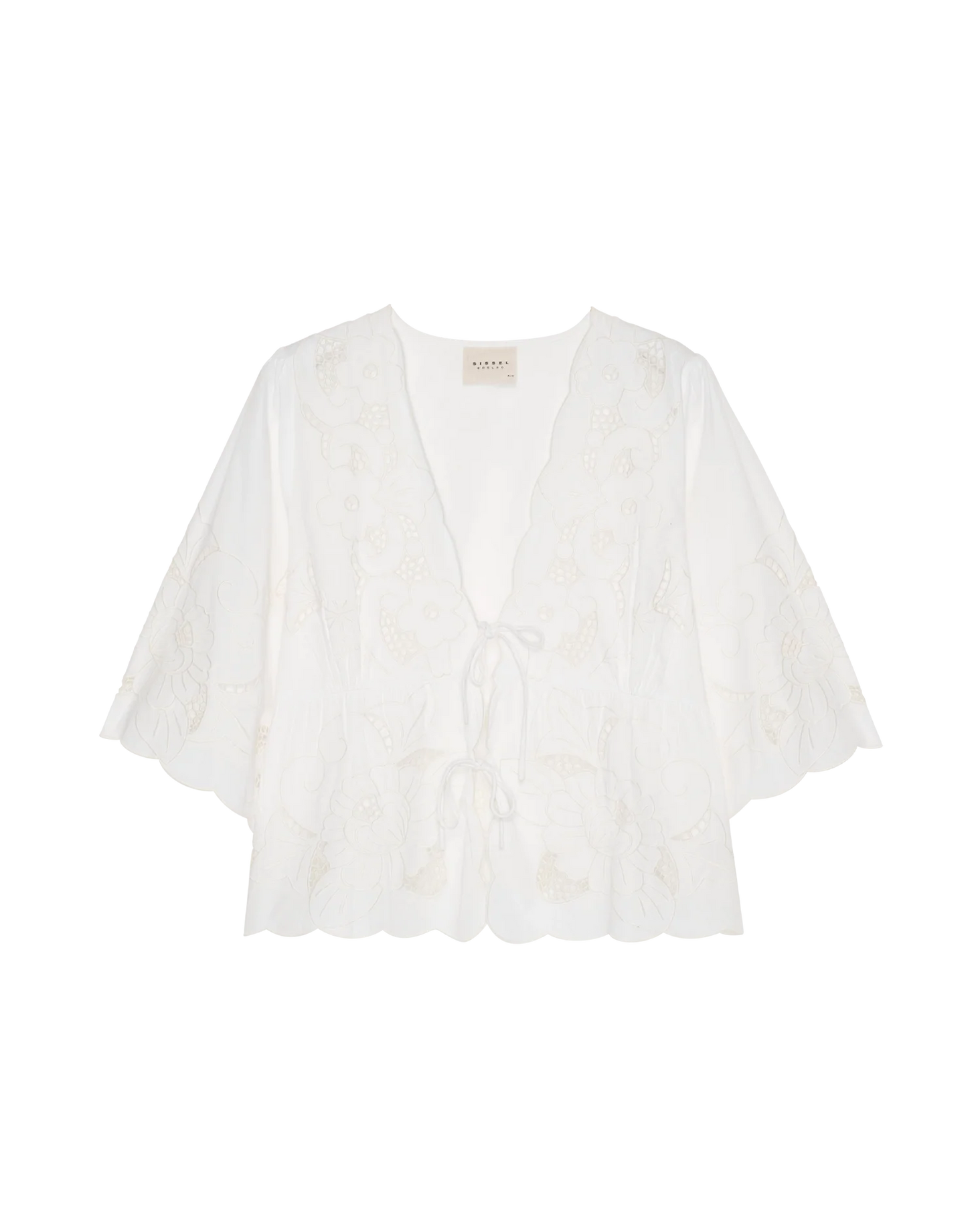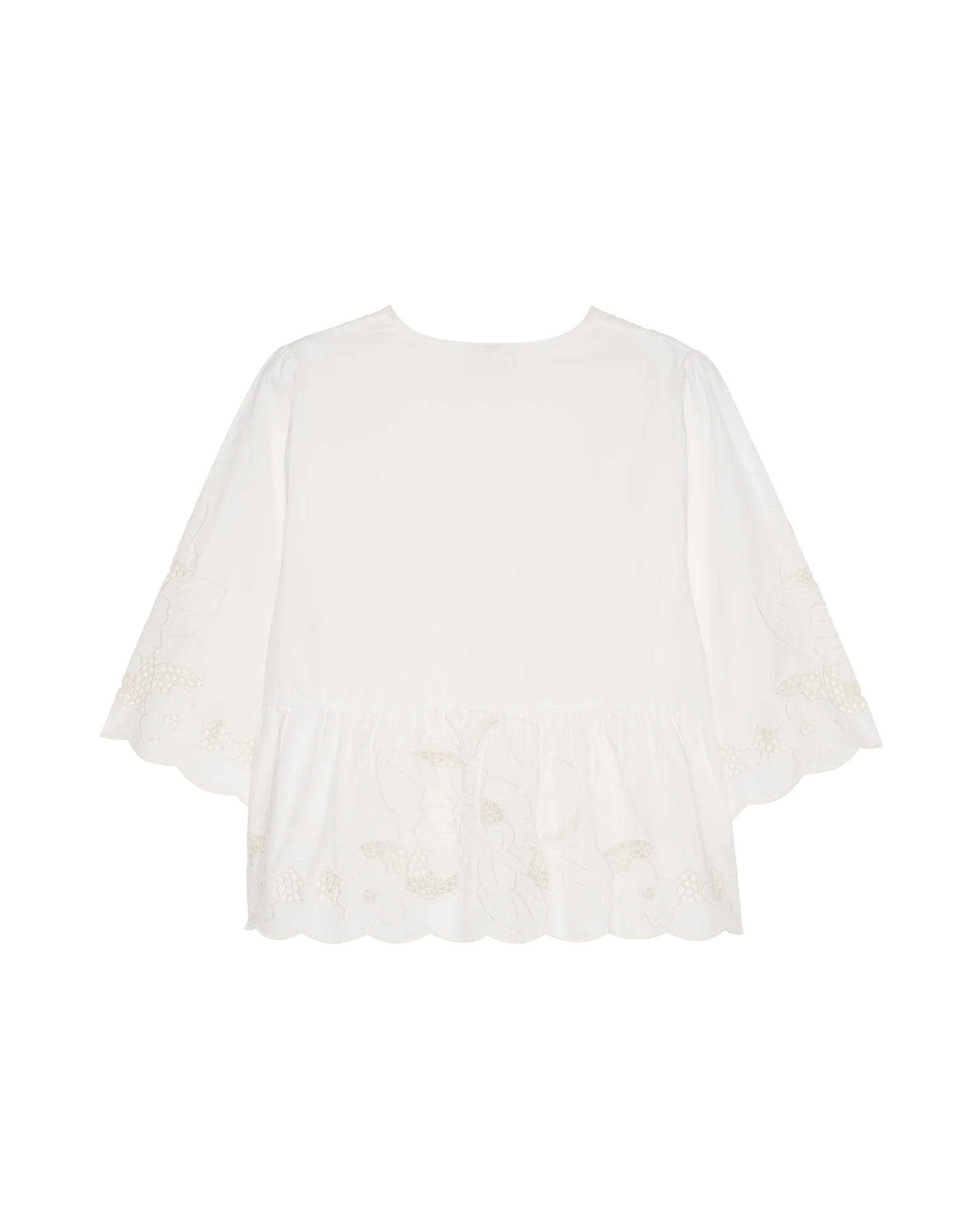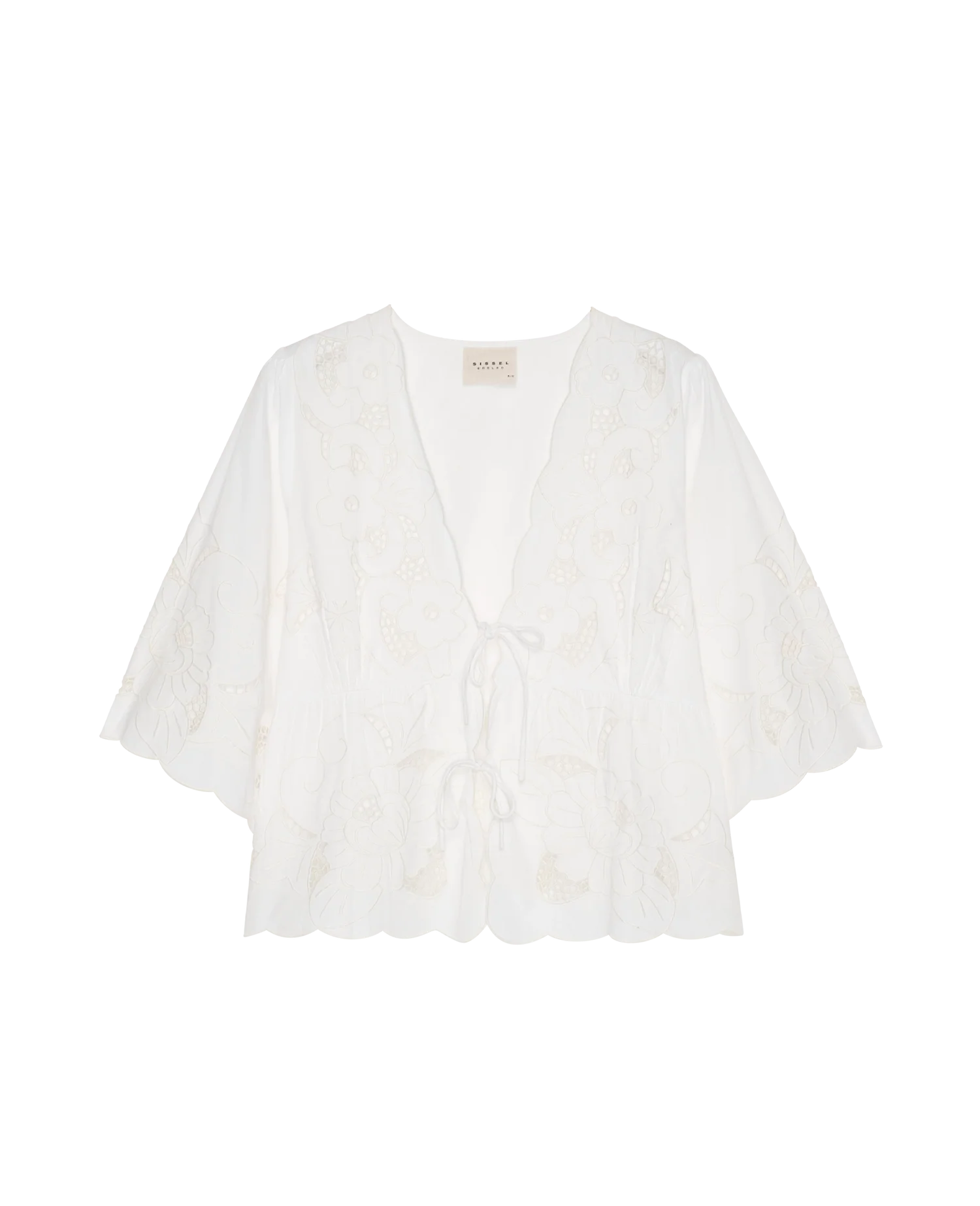 Toppen er smukt udsmykket med tone-i-tone broderet cutwork inspireret af en vintage dug og afsluttes med bølgede, broderede kanter, der understreger det romantiske look.