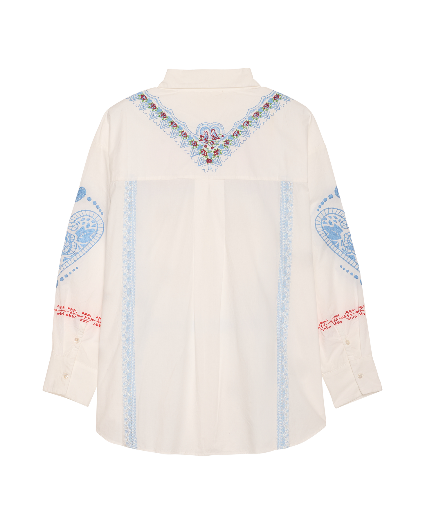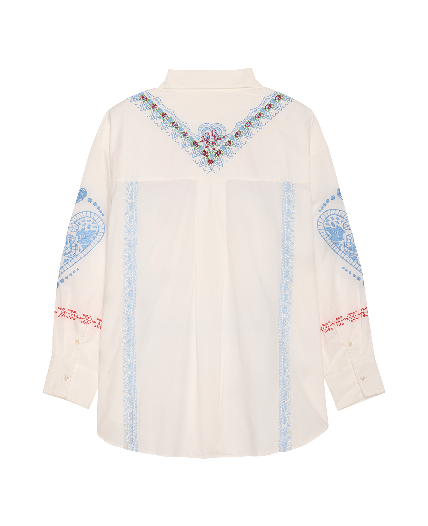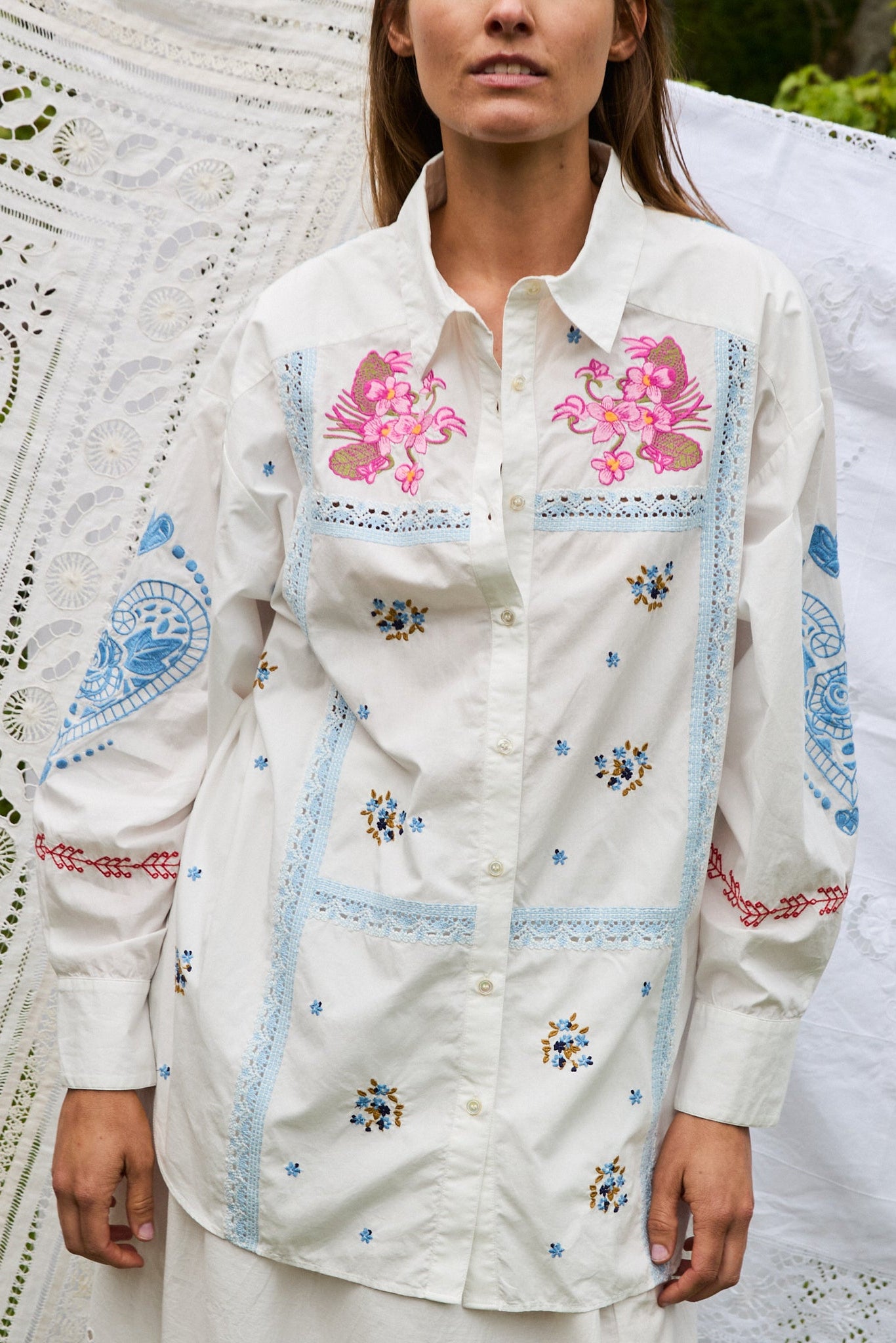Den buede bundkant tilfører et blødt og feminint touch, mens det poetiske broderi med blomster og hjerter skaber et romantisk og kunstnerisk udtryk. Delikate blondebånd indrammer designet og fremhæver skjortens fine detaljer.