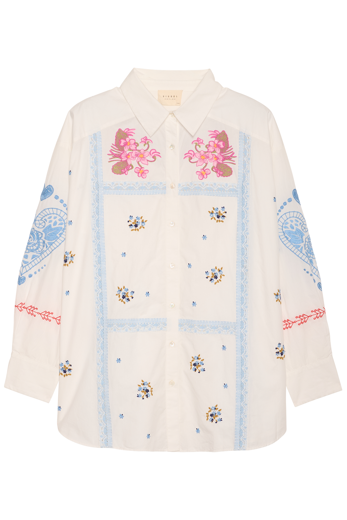 Denne style fra Sissel Edelbo er udsmykket med delikat broderi og fine detaljer, udført med stor omhu. For at bevare skjortens unikke udtryk anbefales skånsom behandling og opmærksom brug.