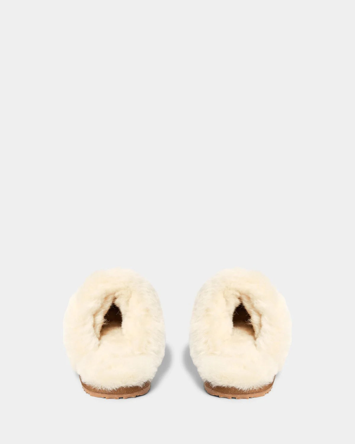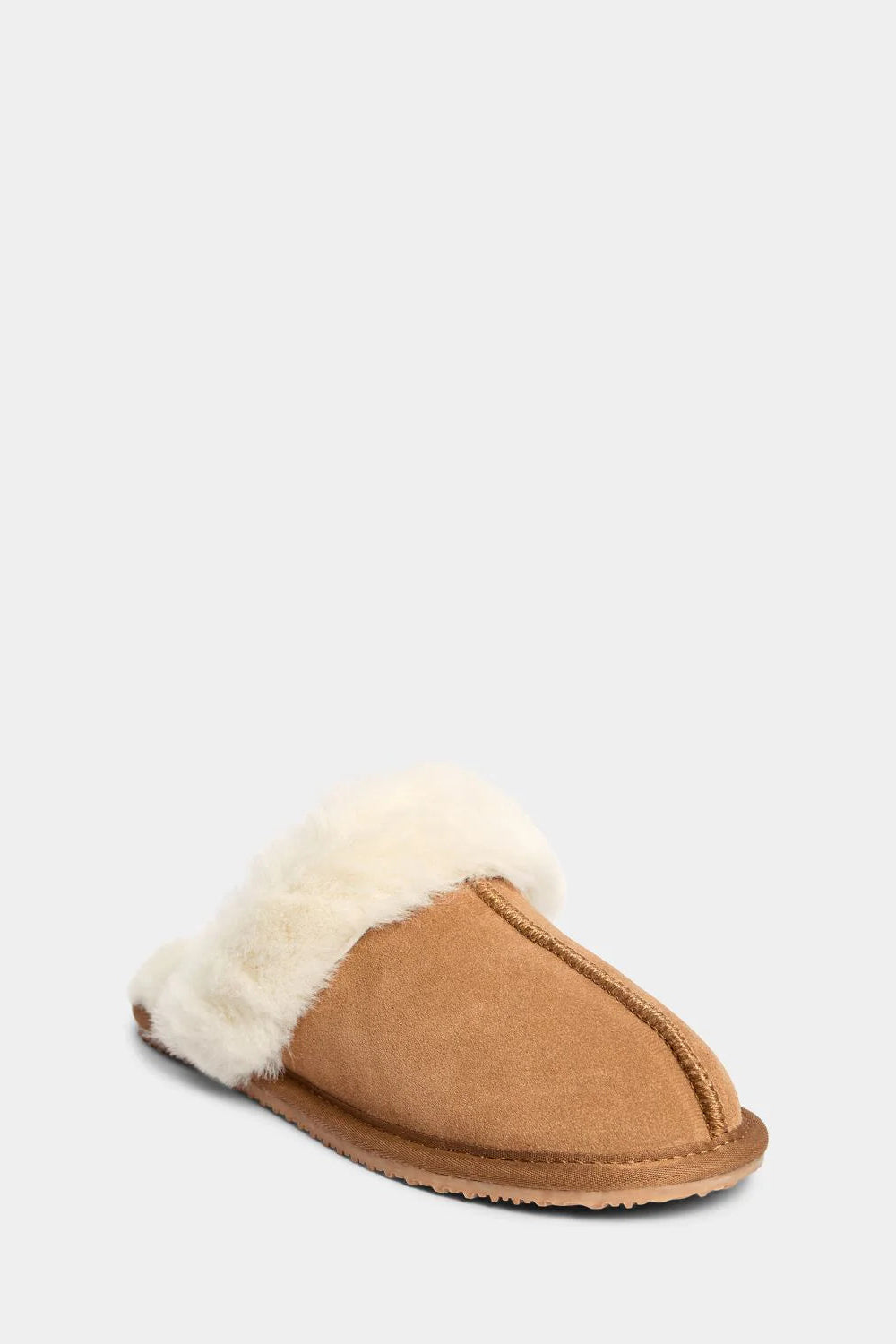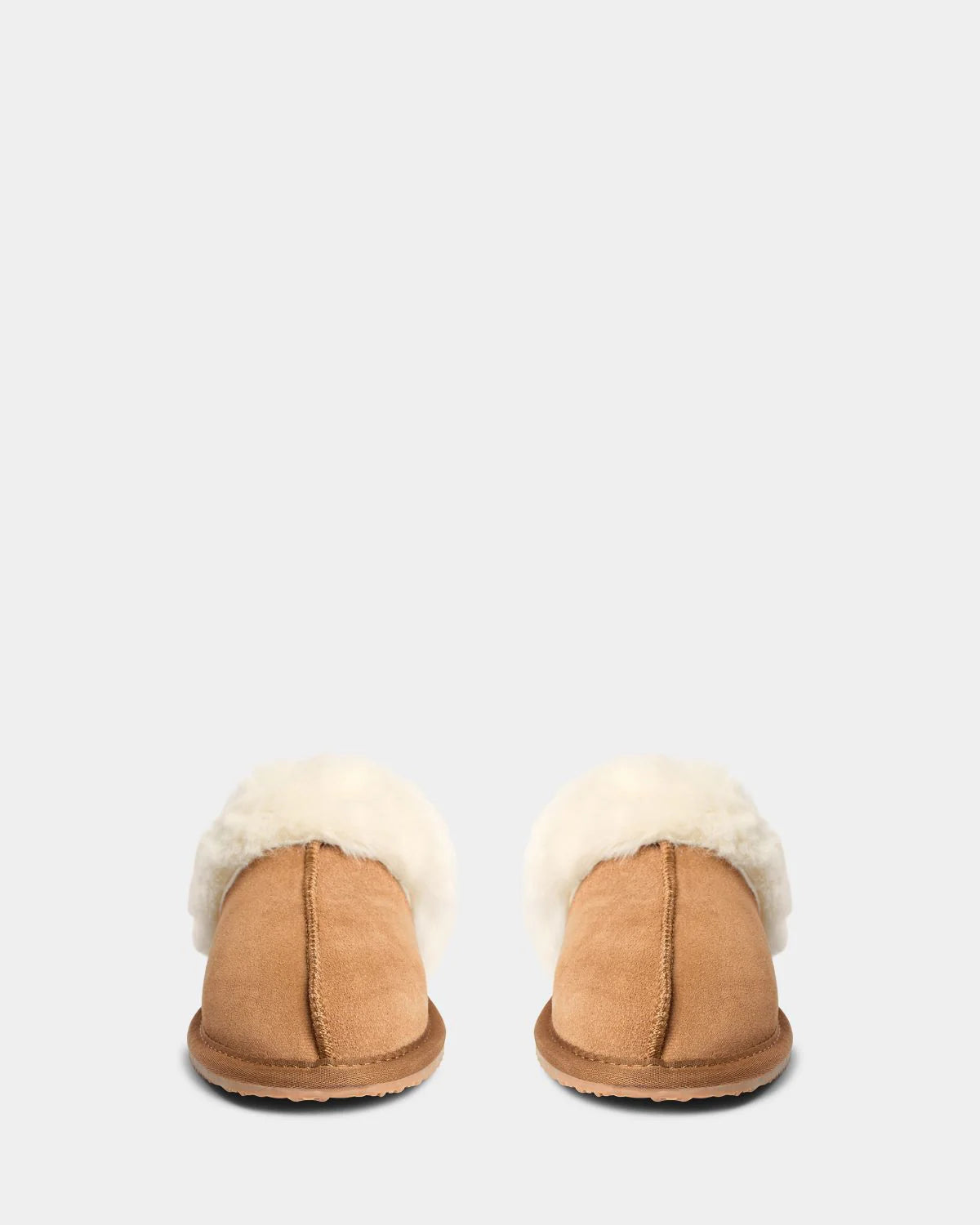 Bettina-hjemmeskoen løfter hjemmekomfort til et nyt niveau. Den er skabt i blødt tanfarvet ruskind, som giver et roligt og naturligt look, mens den fyldige kant af hvid fårepels indrammer foden med varme og blødhed. Indvendigt fortsætter luksusfølelsen med 100% fårepels, der gør hver skridt let, varmt og utroligt behageligt.