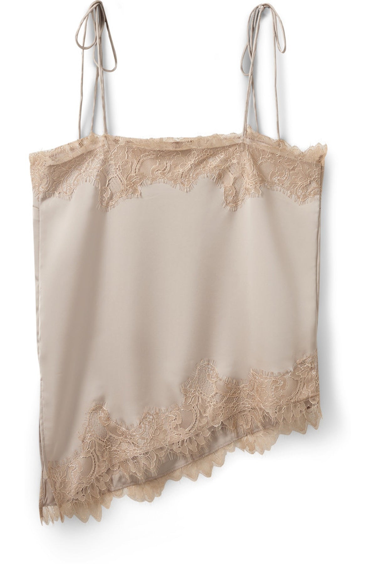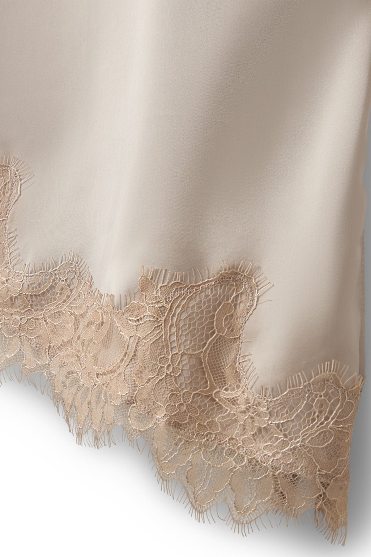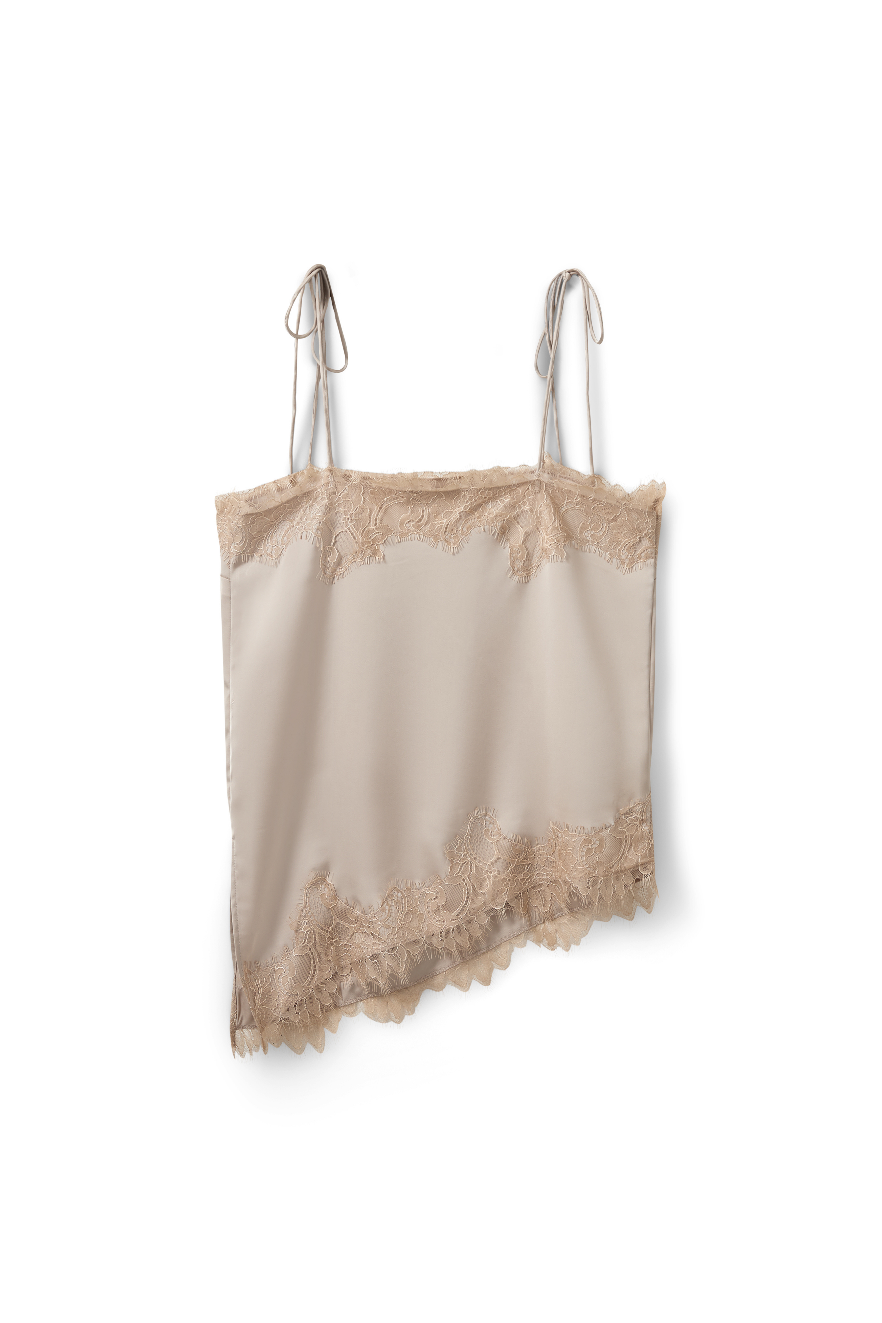 En let og feminin top med blonde-detaljer og en blød satinfinish, der ligger behageligt mod huden. Toppen har en enkel silhuet, der fungerer godt både til hverdag og ved mere pyntede lejligheder, og den diskrete farve Feather Gray gør den nem at kombinere med andre items i garderoben, med fx. et par bukser.