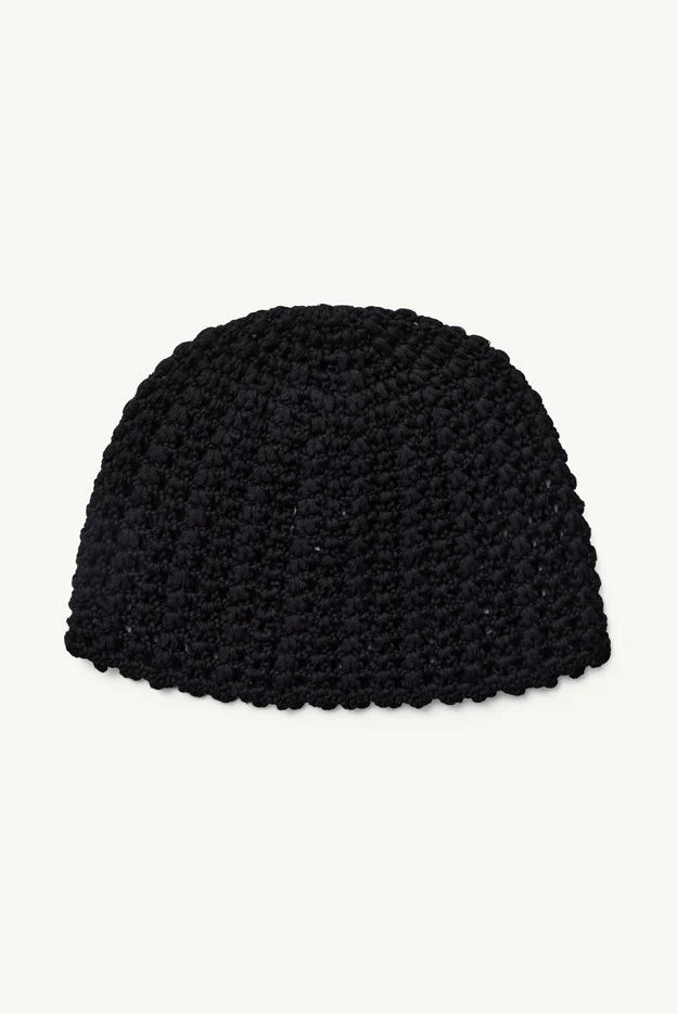 Hæklet beanie fra The Garment i sort med et let og åbent mønster, der giver et raffineret og moderne udtryk. Den tætsiddende pasform fremhæver den enkle silhuet, mens den mørke farve tilfører et skarpt og alsidigt look.