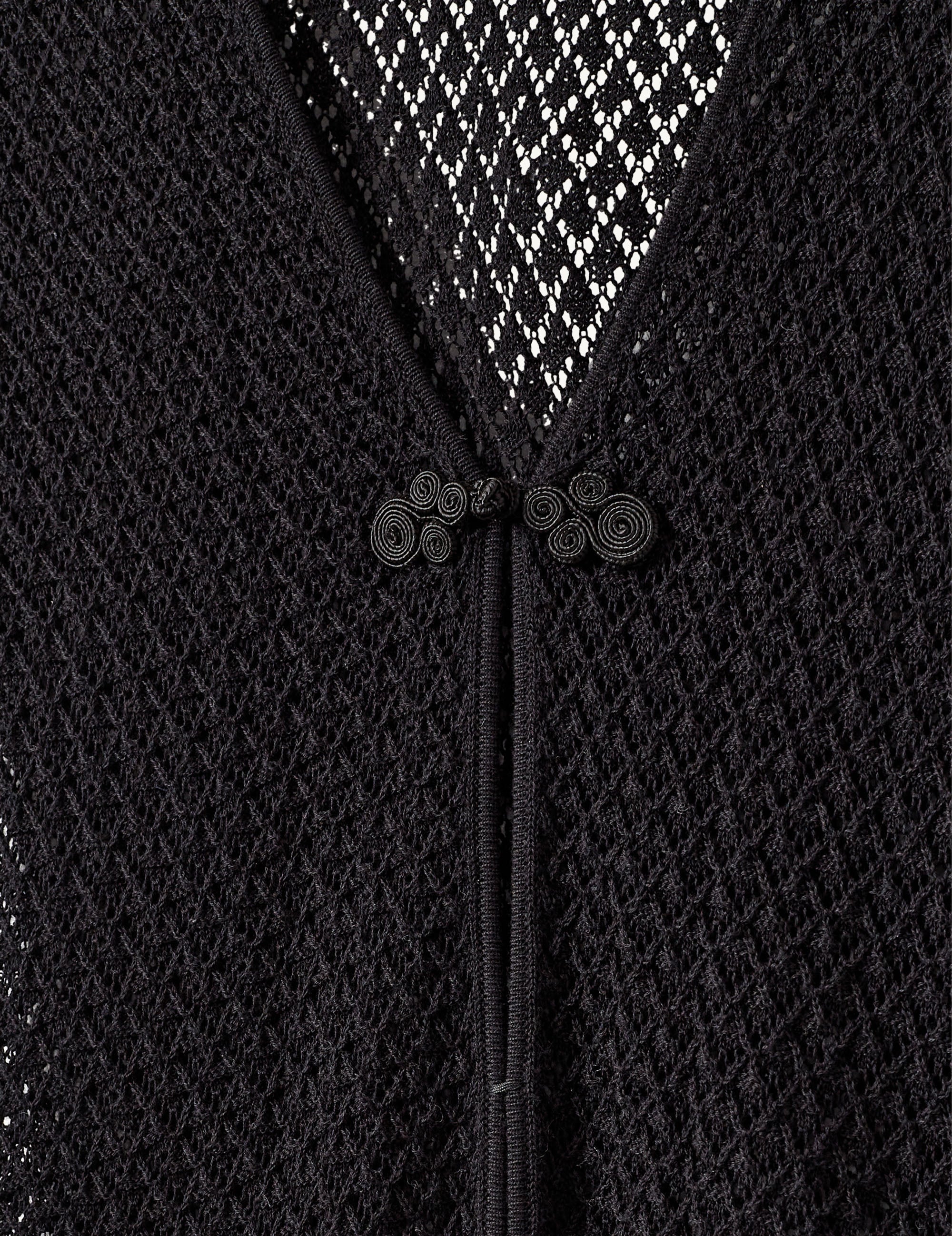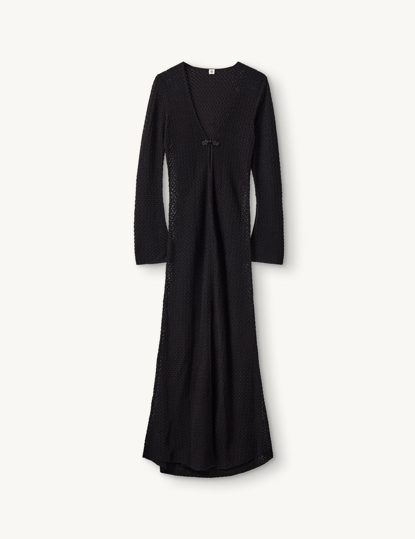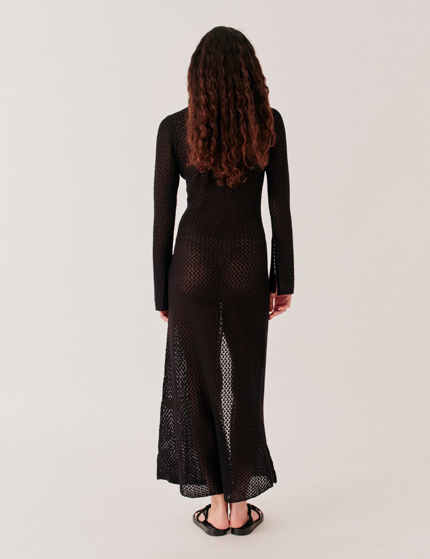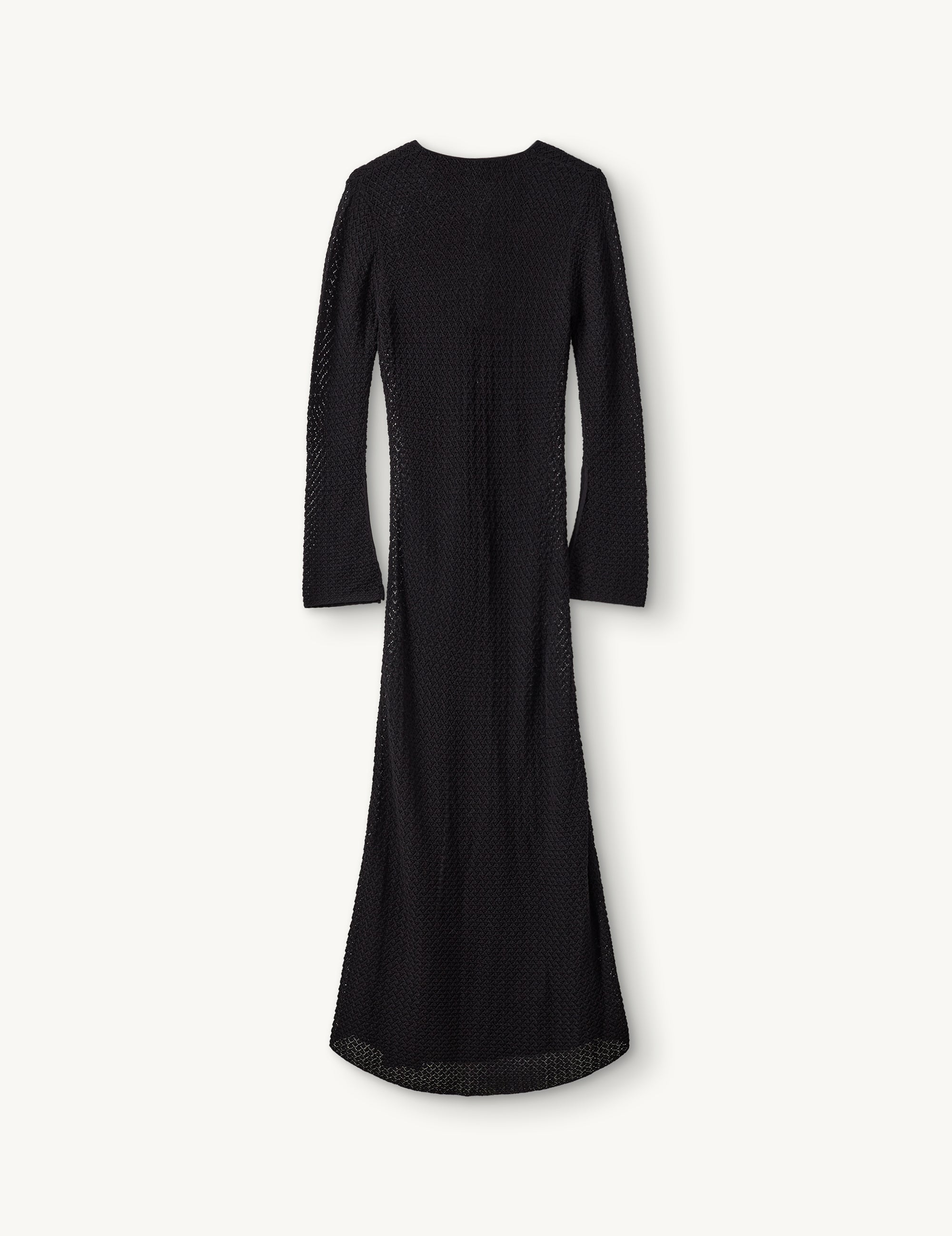 Denne kjole fra The Garment har et særligt gennembrudt mønster og en sort spændedetalje ved halsen. Den lange silhuet og V-udskæringen gør den passende til festlige anledninger, hvor den holder dig komfortabel.