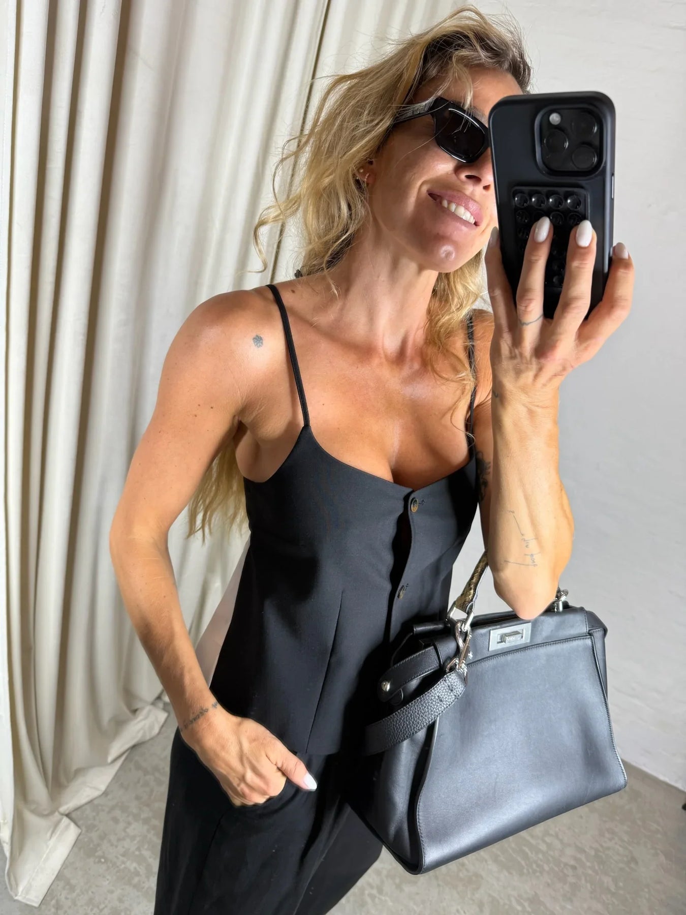 En sort top fra The Garment med hvid ryg og knaplukning foran. Den faste overdel og den løse underdel giver et praktisk look til lange arbejdsdage. De justerbare stropper sikrer en behagelig pasform.
