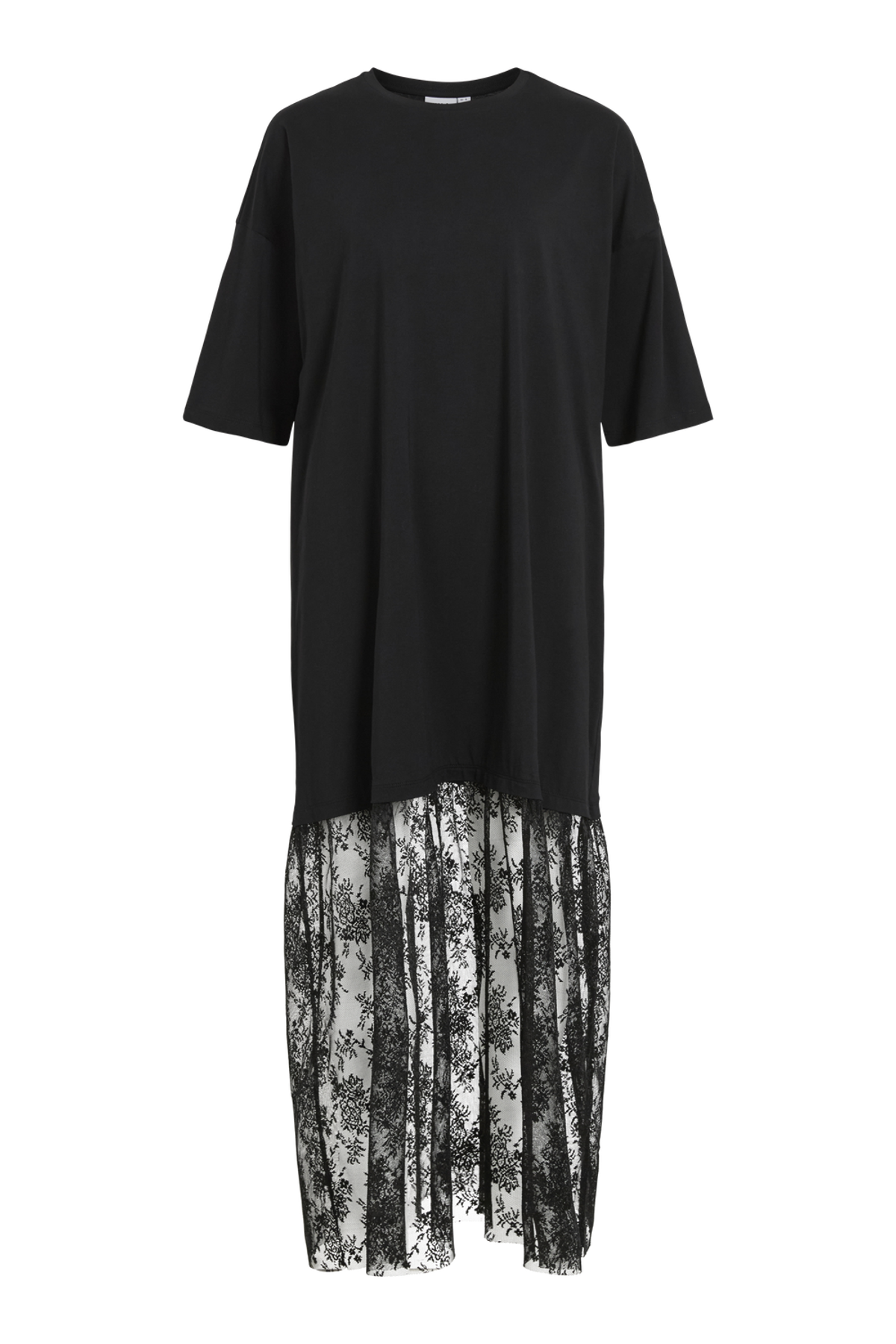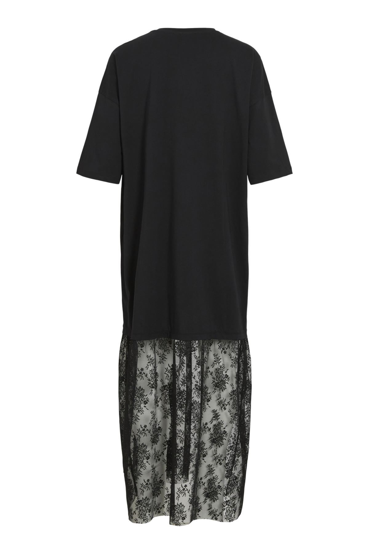 En løs, kortærmet lang kjole i sort med rund hals og fine blondepartier fra VILA, der giver et feminint touch uden at gå på kompromis med komforten. Den lette pasform og dropped shoulders skaber et afslappet, moderne udtryk, som fungerer godt til både hverdagsbrug og mere afslappede aftener.